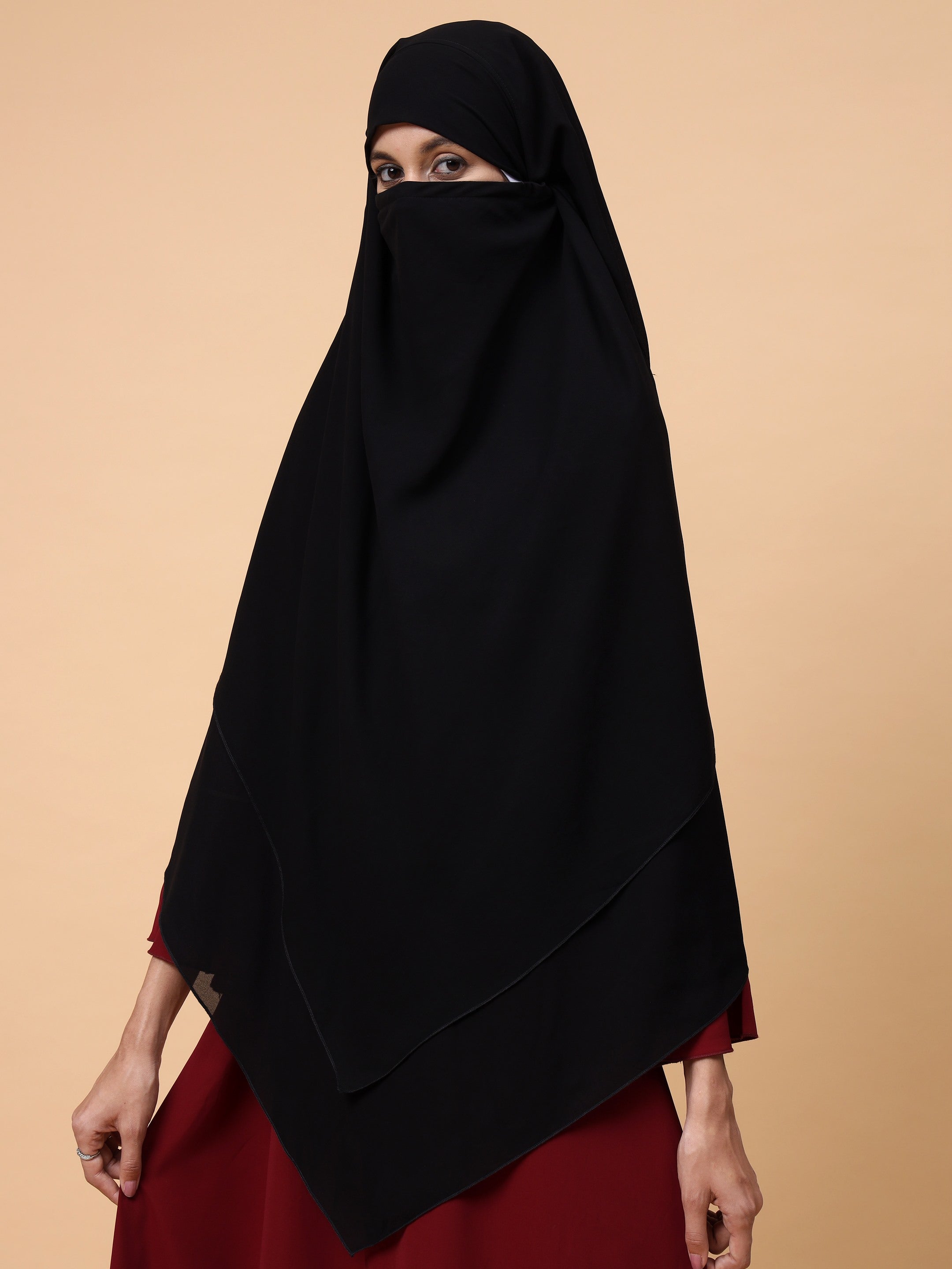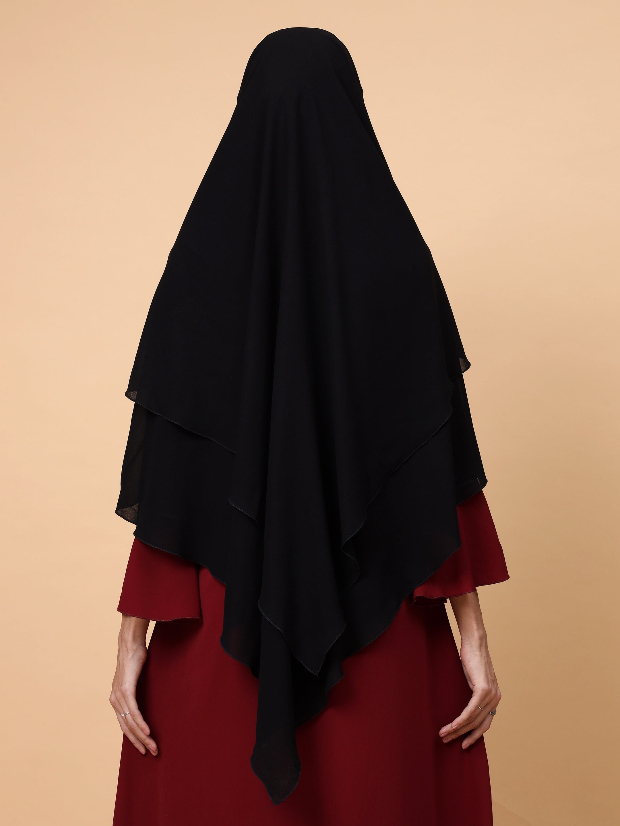 Introducing the elegant 2-layer Black Solid Prayer Khimar Hijab, tailored for adult girls and women seeking comfort and style. Crafted with a breathable, lightweight fabric, it offers modest coverage and a graceful drape, perfect for prayer and daily wear. Ideal for those embracing both tradition and contemporary fashion.