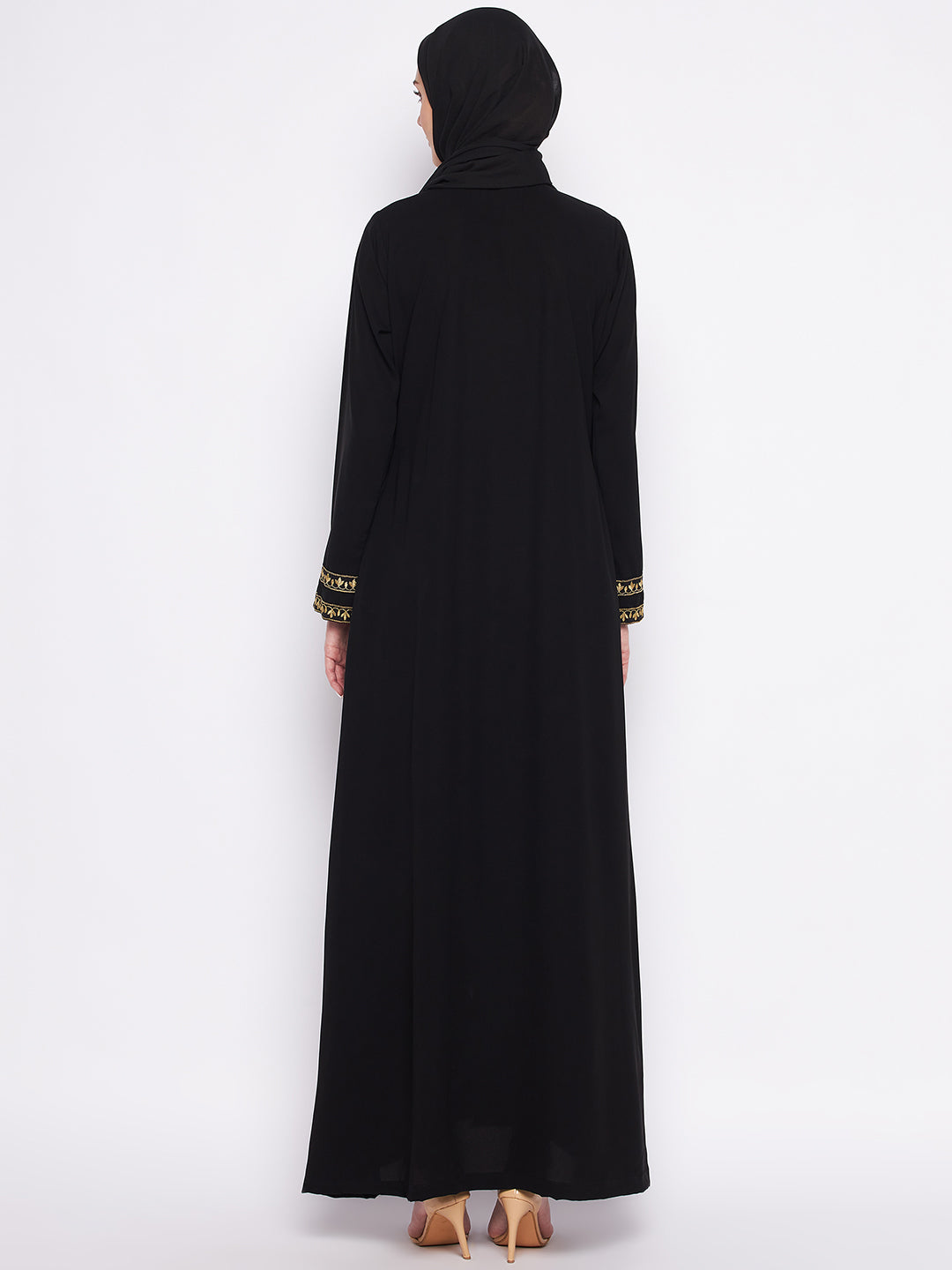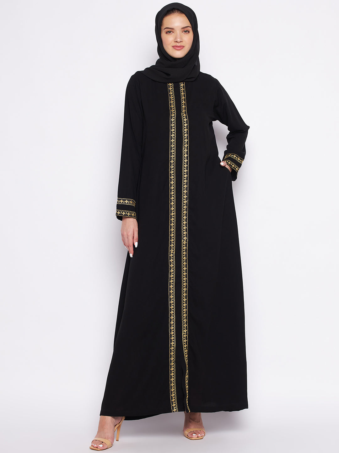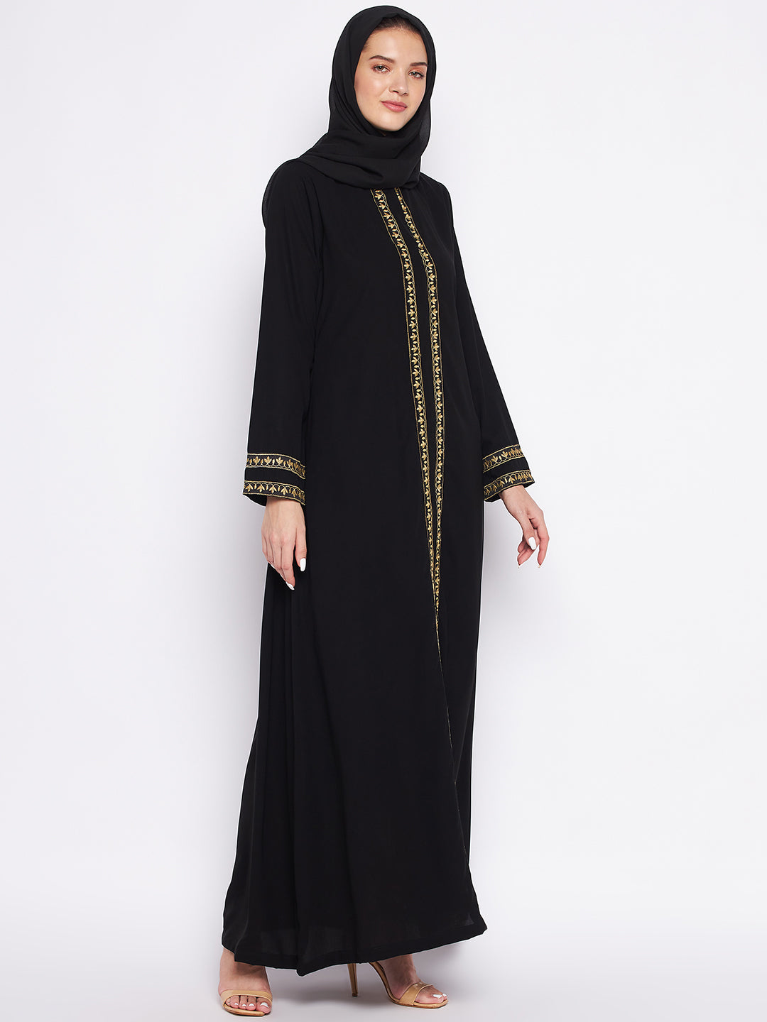 Nabia's Black Embroidery Abaya is a tasteful and modest choice for Muslim women. Crafted from high-quality Nida Matte Fabric, this Abaya features intricate embroidery on the front and sleeves, adding an elegant touch to the design. With an A-line cut, it seamlessly combines Islamic values with contemporary fashion. Available online, it enables women to express their faith gracefully while staying true to their cultural traditions. Perfect for various occasions, it exudes elegance and style.