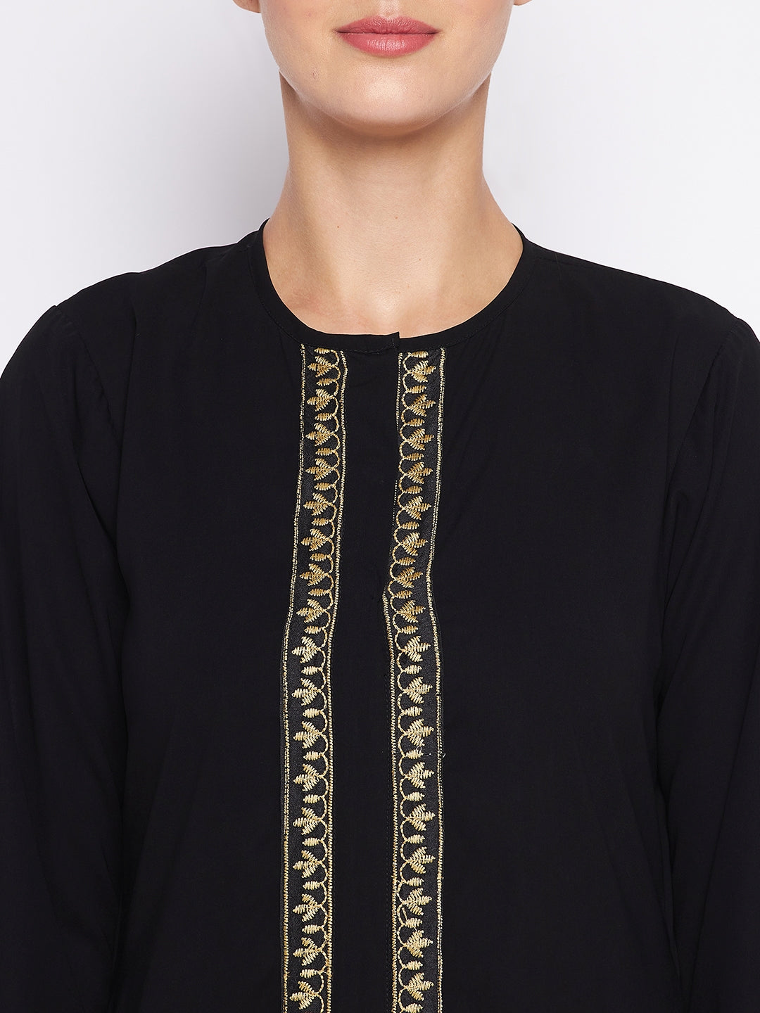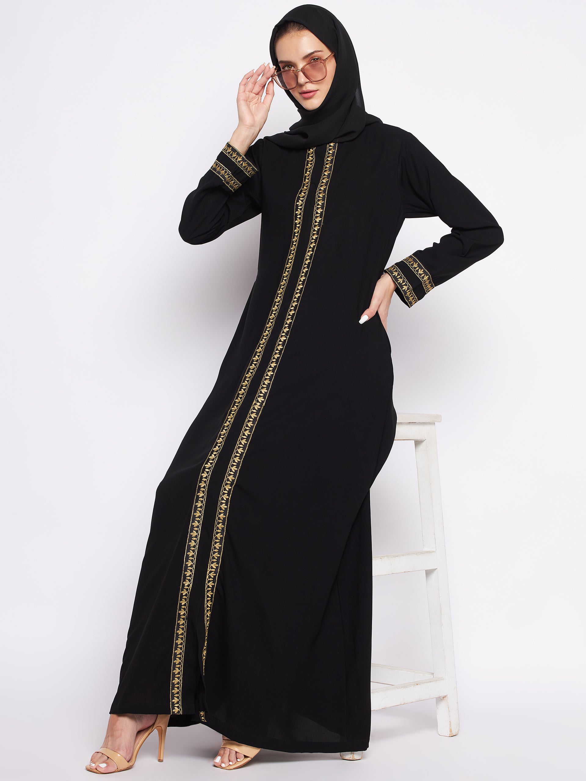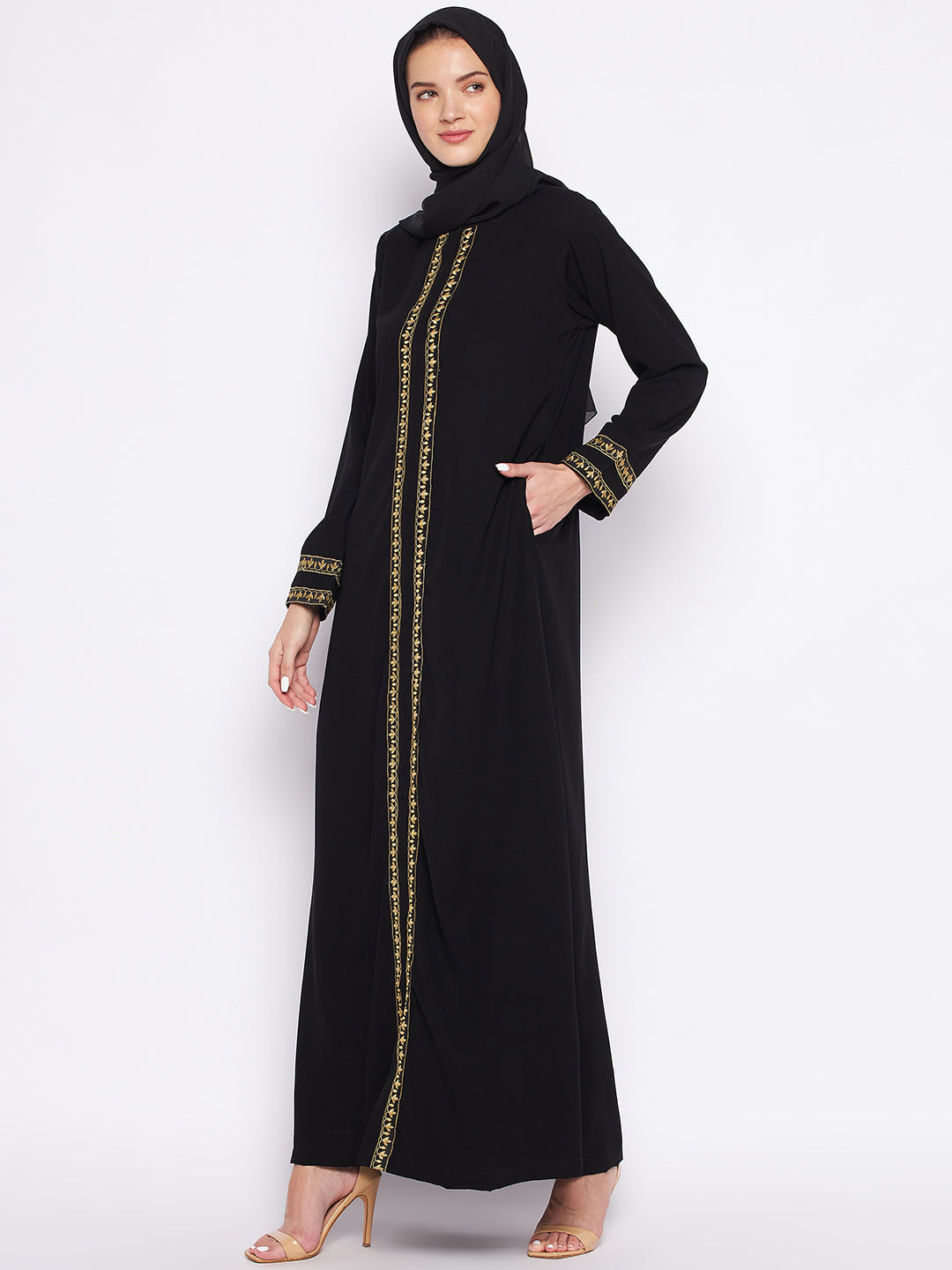 Nabia's Black Embroidery Abaya is a tasteful and modest choice for Muslim women. Crafted from high-quality Nida Matte Fabric, this Abaya features intricate embroidery on the front and sleeves, adding an elegant touch to the design. With an A-line cut, it seamlessly combines Islamic values with contemporary fashion. Available online, it enables women to express their faith gracefully while staying true to their cultural traditions. Perfect for various occasions, it exudes elegance and style.