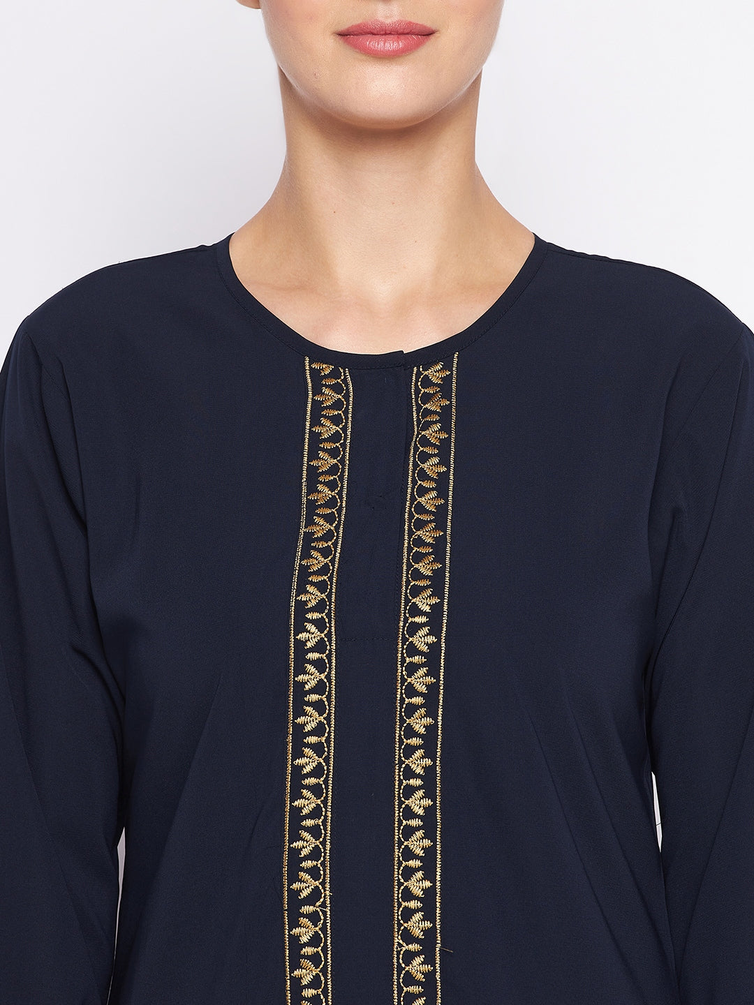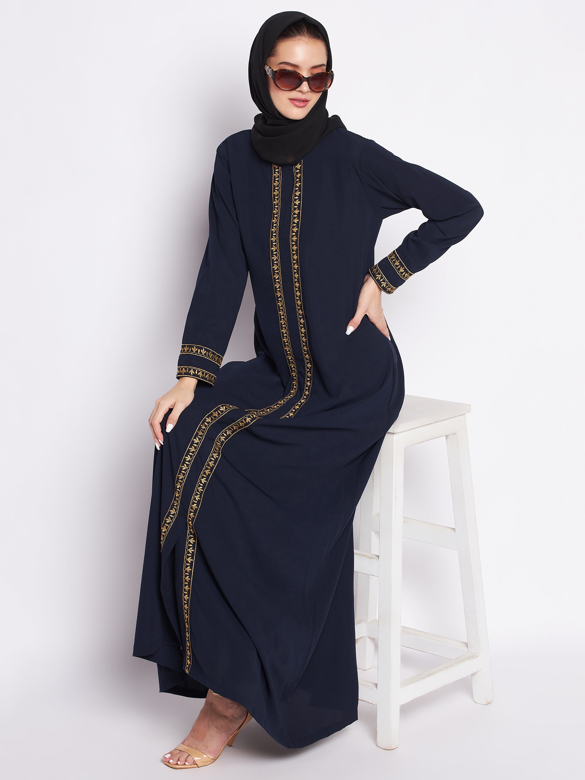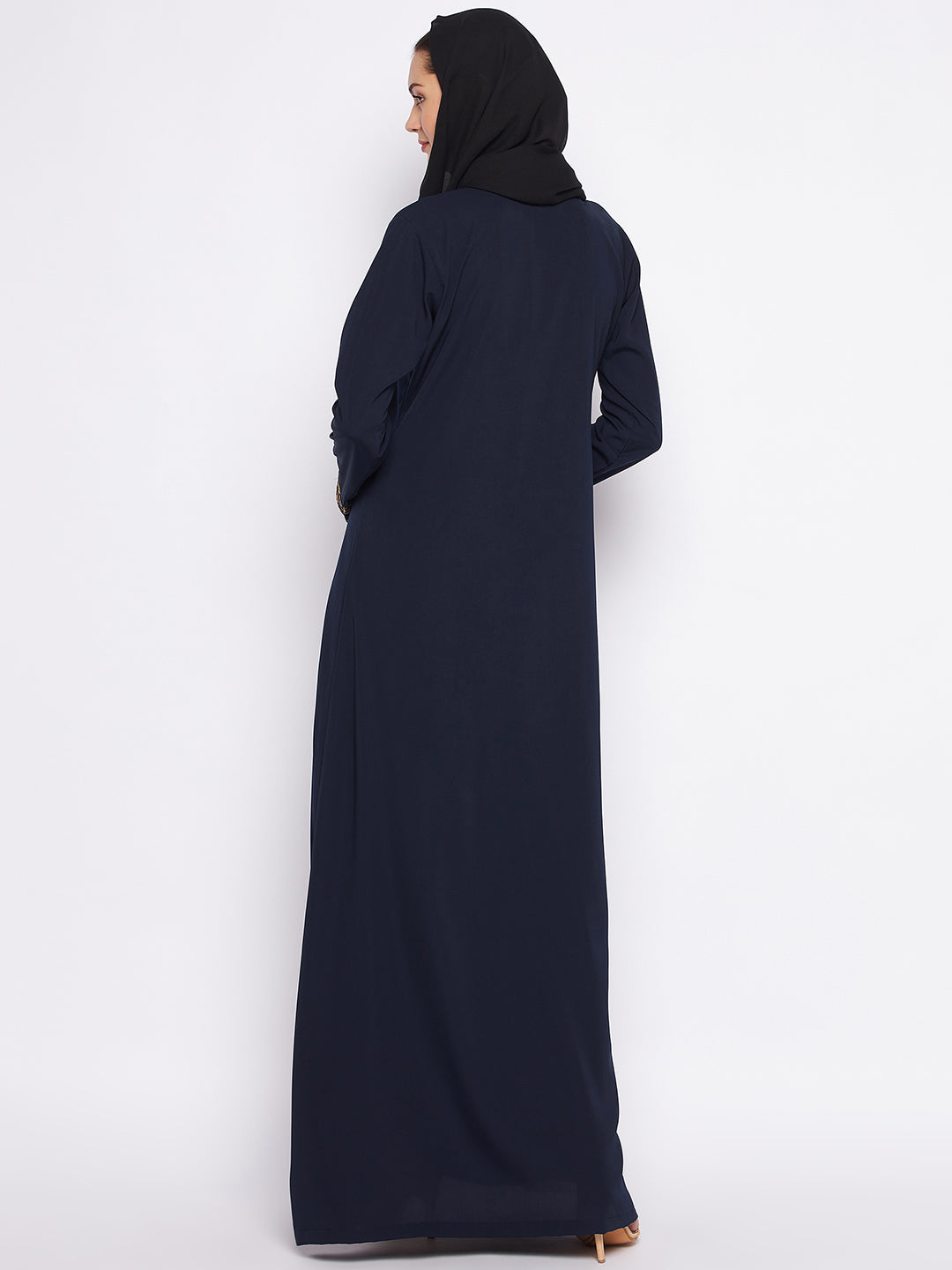 Nabia's Blue Embroidery Abaya is a tasteful and modest choice for Muslim women. Crafted from high-quality Nida Matte Fabric, this Abaya features intricate embroidery on the front and sleeves, adding an elegant touch to the design. With an A-line cut, it seamlessly combines Islamic values with contemporary fashion. Available online, it enables women to express their faith gracefully while staying true to their cultural traditions. Perfect for various occasions, it exudes elegance and style.