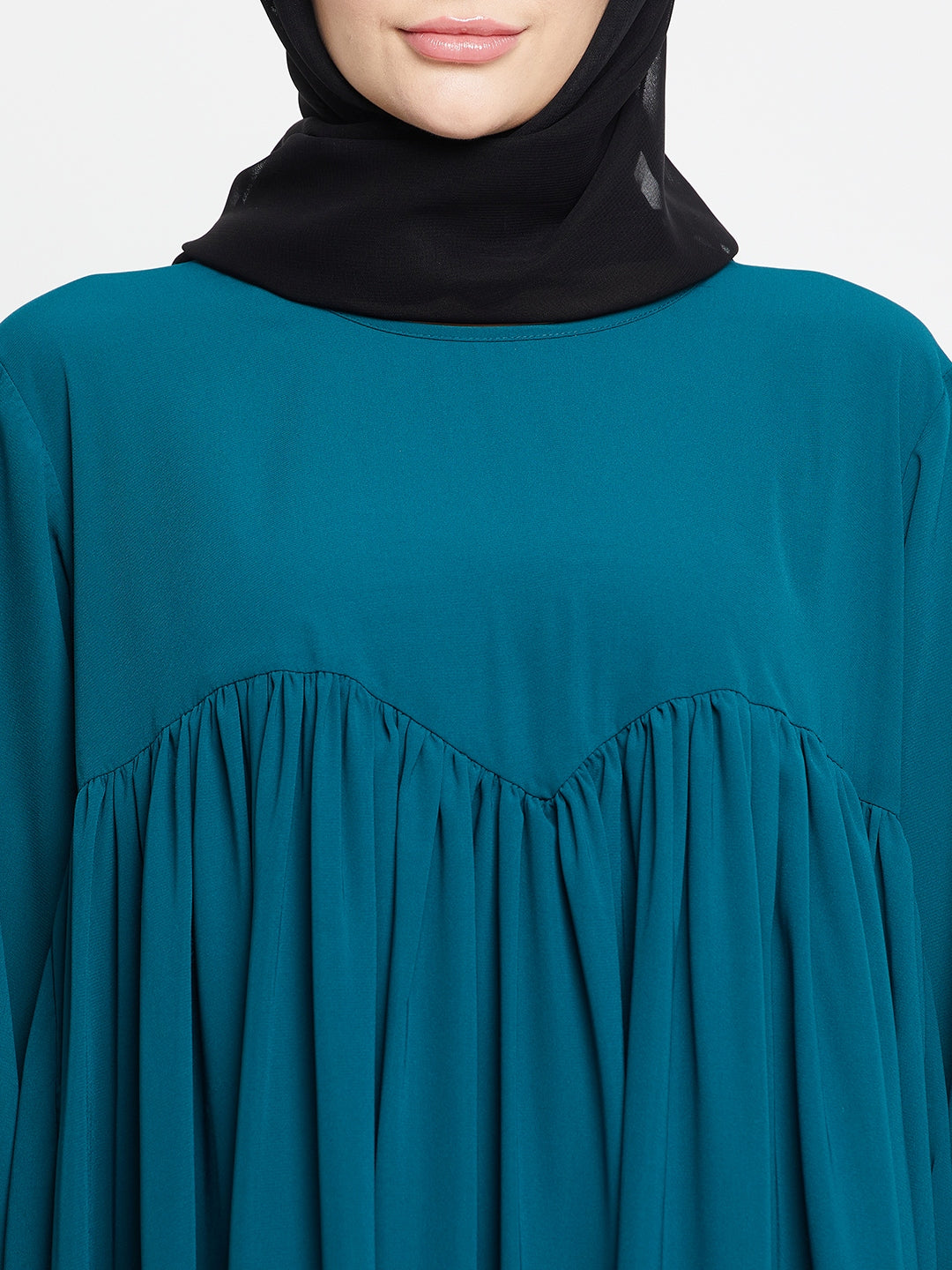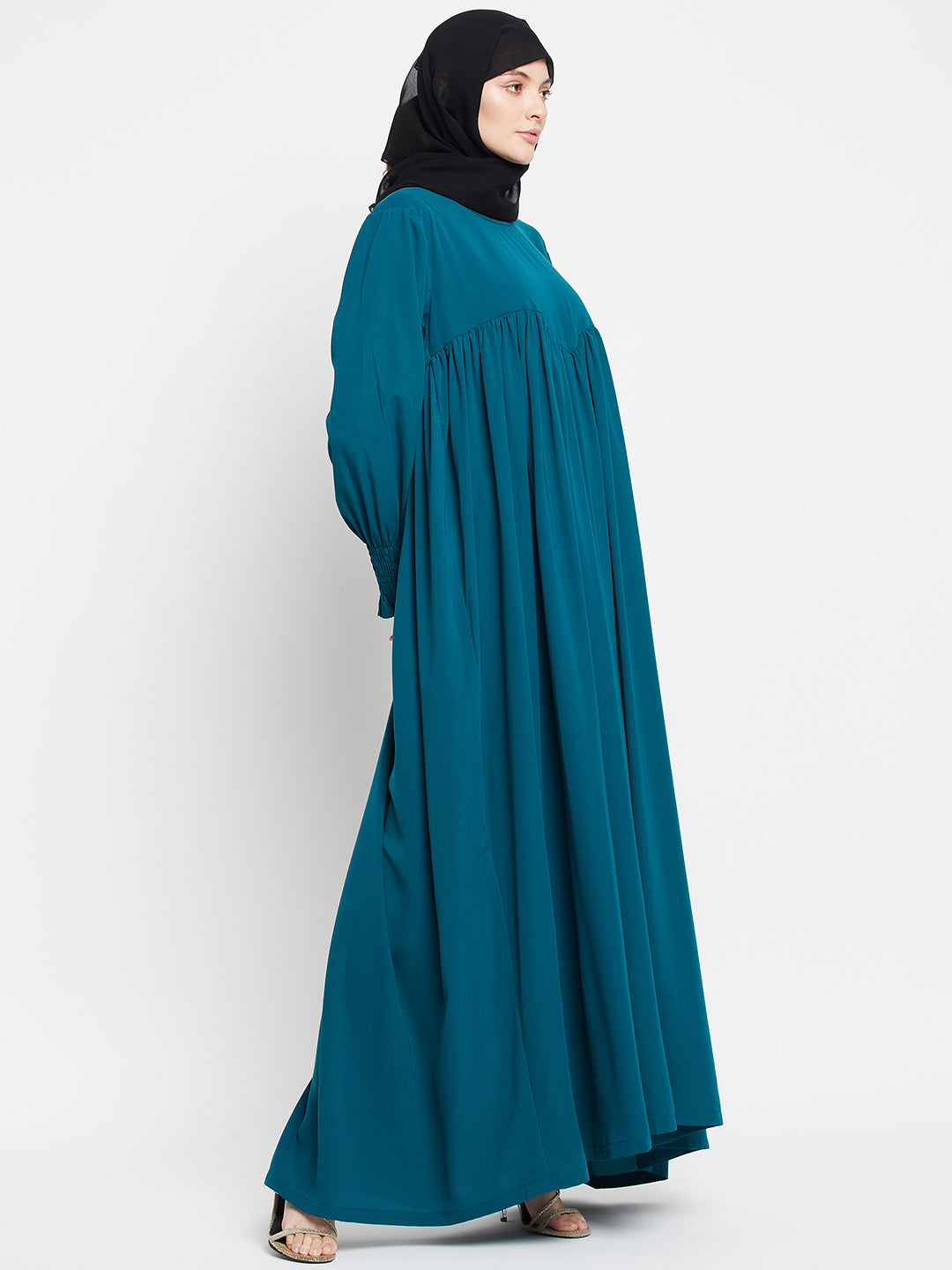 The Nabia bottle green abaya for women is designed for both style and comfort. Featuring elastic sleeves for easy adjustment, it's made from Nida Matte fabric and boasts long and puff sleeves, adding a touch of elegance to this modest attire.