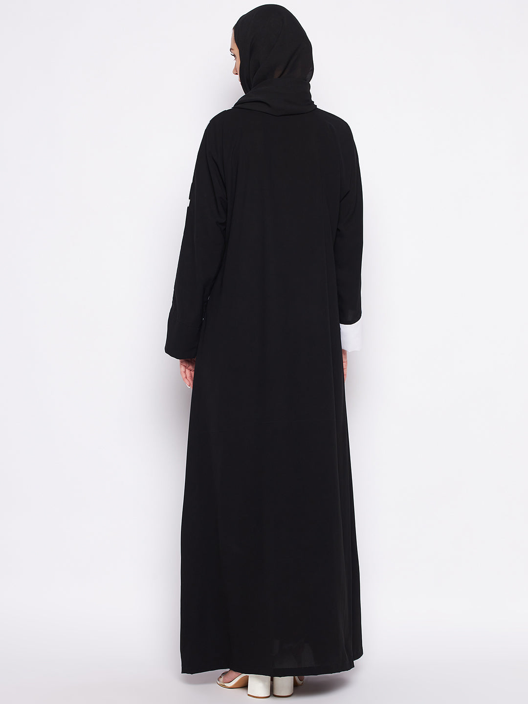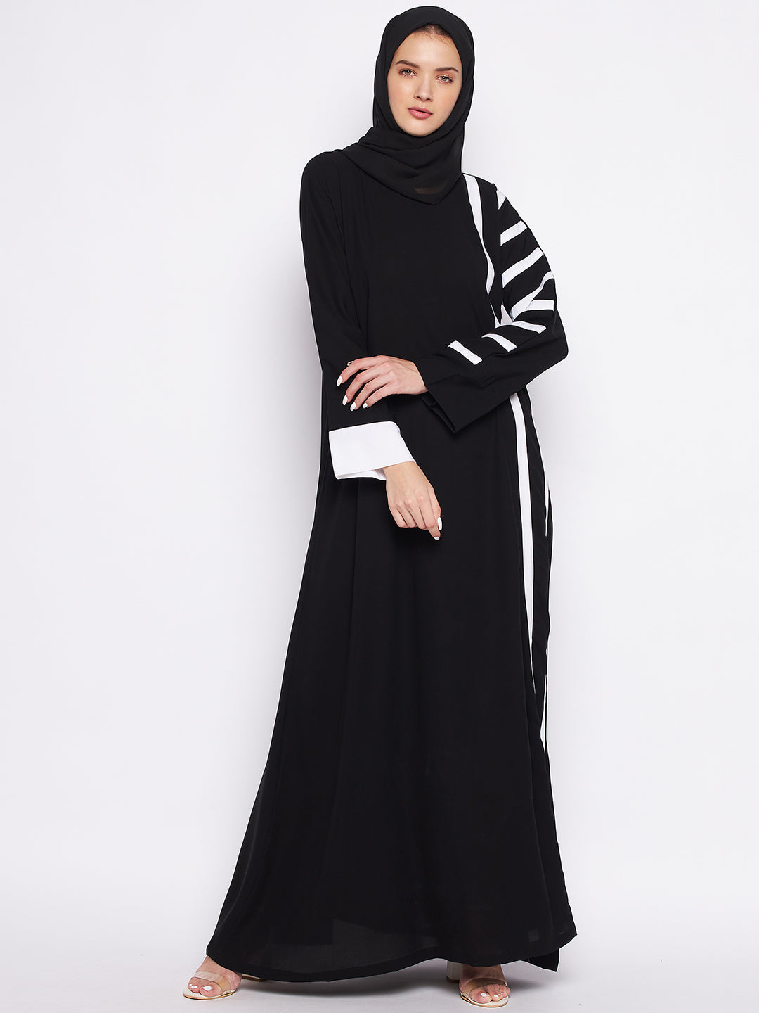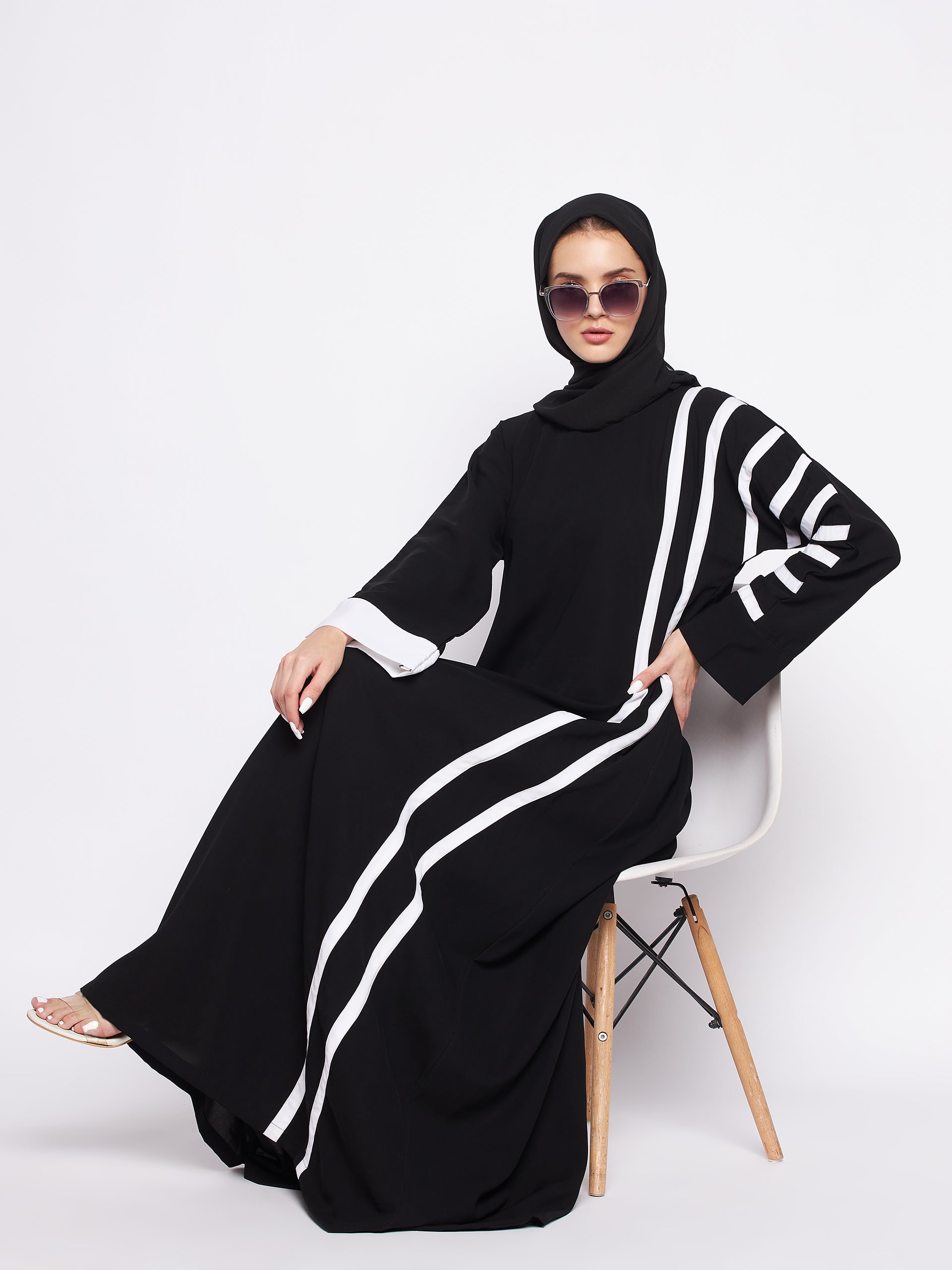The Nabia A-Line Black abaya for women boasts contrasting, stylish white piping on the sleeves and front. Crafted from comfortable Nida Matte fabric, it offers timeless elegance and modesty with a fashionable twist.