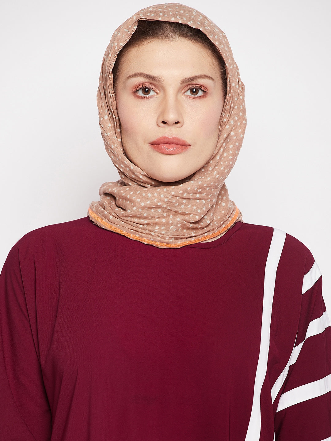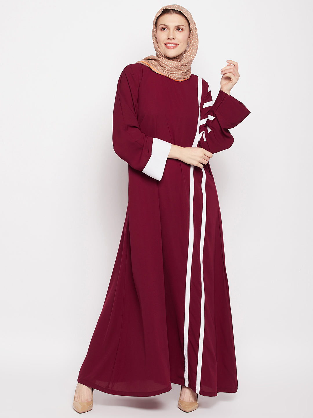 The Nabia A-Line Maroon abaya for women boasts contrasting, stylish white piping on the sleeves and front. Crafted from comfortable Nida Matte fabric, it offers timeless elegance and modesty with a fashionable twist.