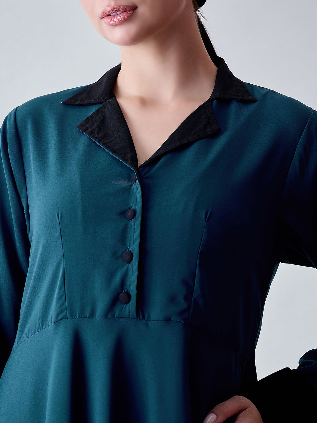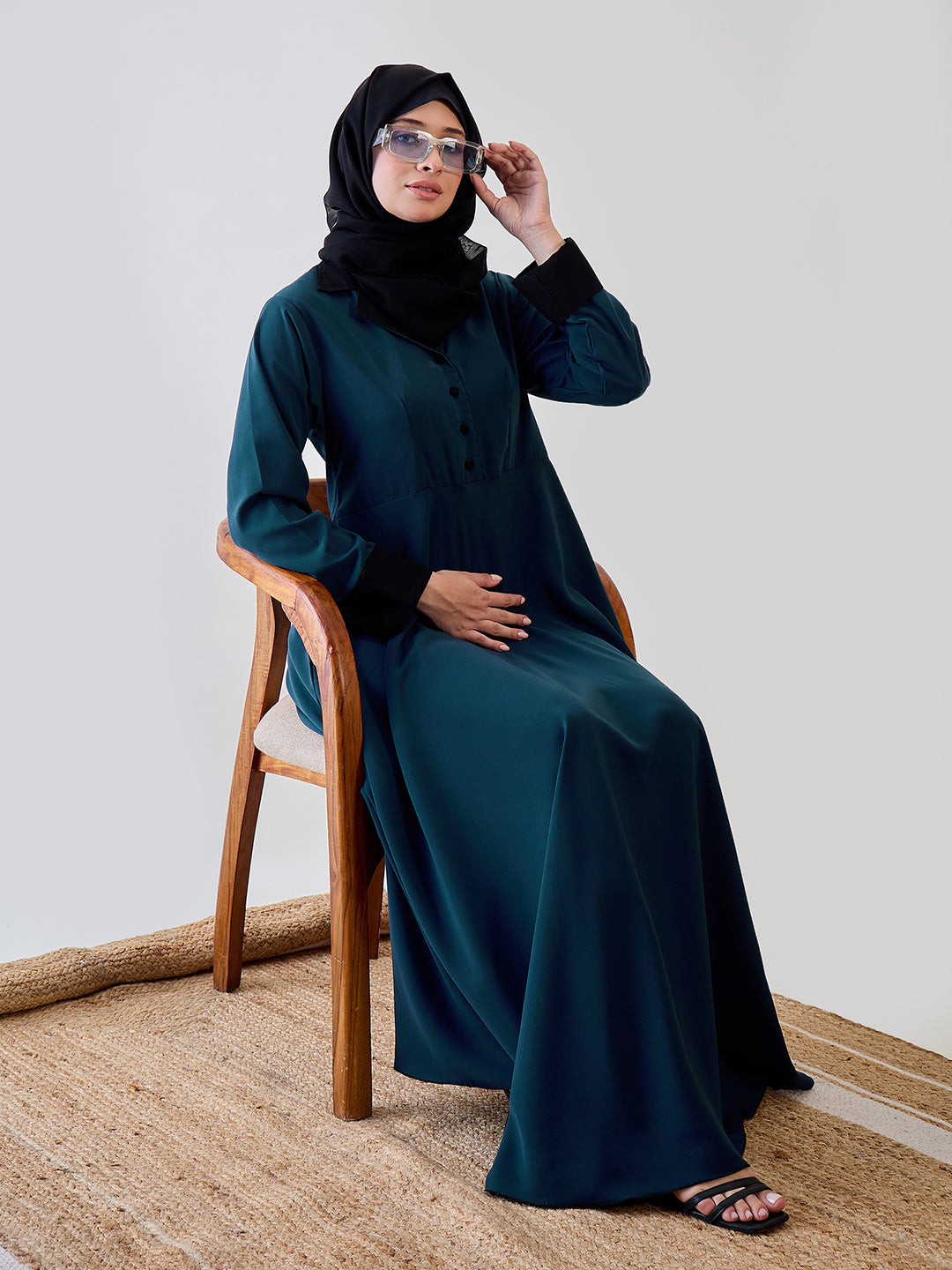 This teal coat-style abaya burqa is a sophisticated choice for Islamic and Muslim women who value modesty with a touch of elegance. Crafted from high-quality fabric, it features a solid coat-style neck and a button closure for a refined look. The elegant bell sleeves and sleek black piping along the sleeves and neck add a stylish contrast. Designed for comfort and versatility, this abaya is perfect for both formal events and everyday wear, offering a timeless and graceful appearance.