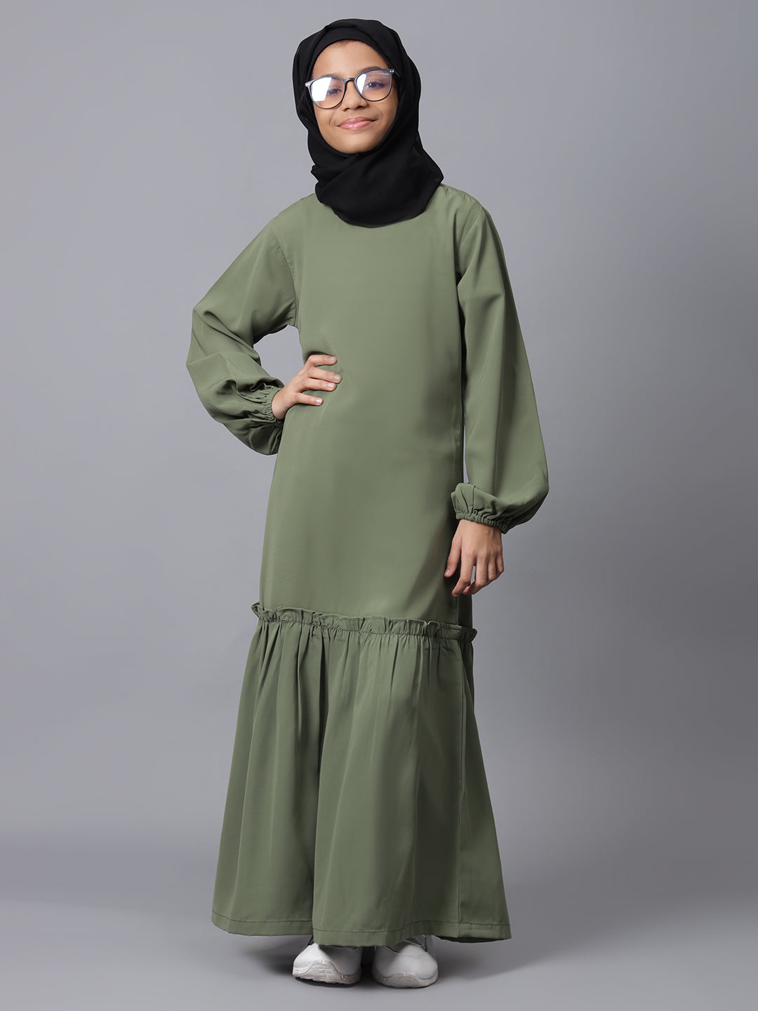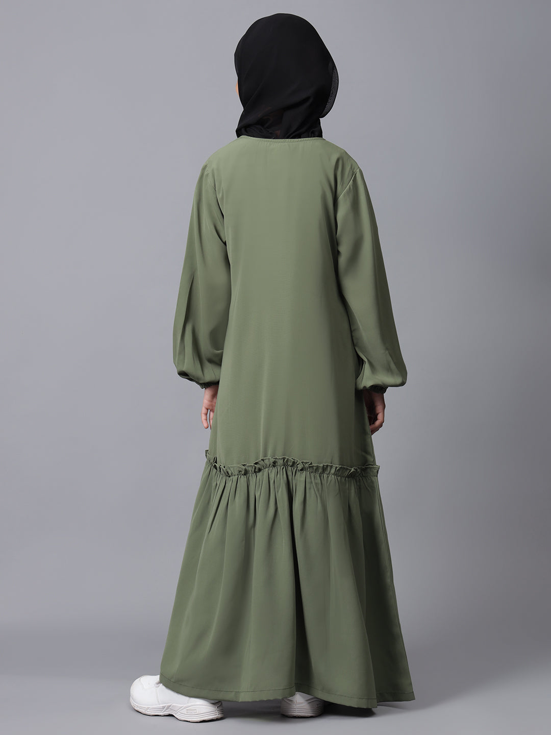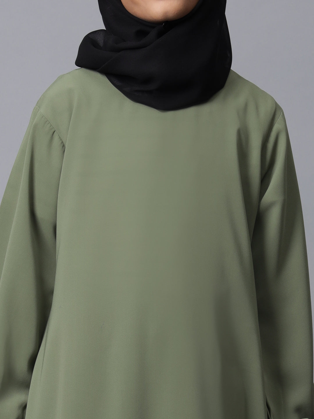 The A-line jade green abaya is a perfect choice for Muslim and Islamic girls, featuring stylish puffed sleeves. This solid-colored abaya offers a modest yet fashionable look, aligning with the latest trends. Designed to be both attractive and comfortable, it's an ideal outfit for any occasion, blending tradition with modern elegance.