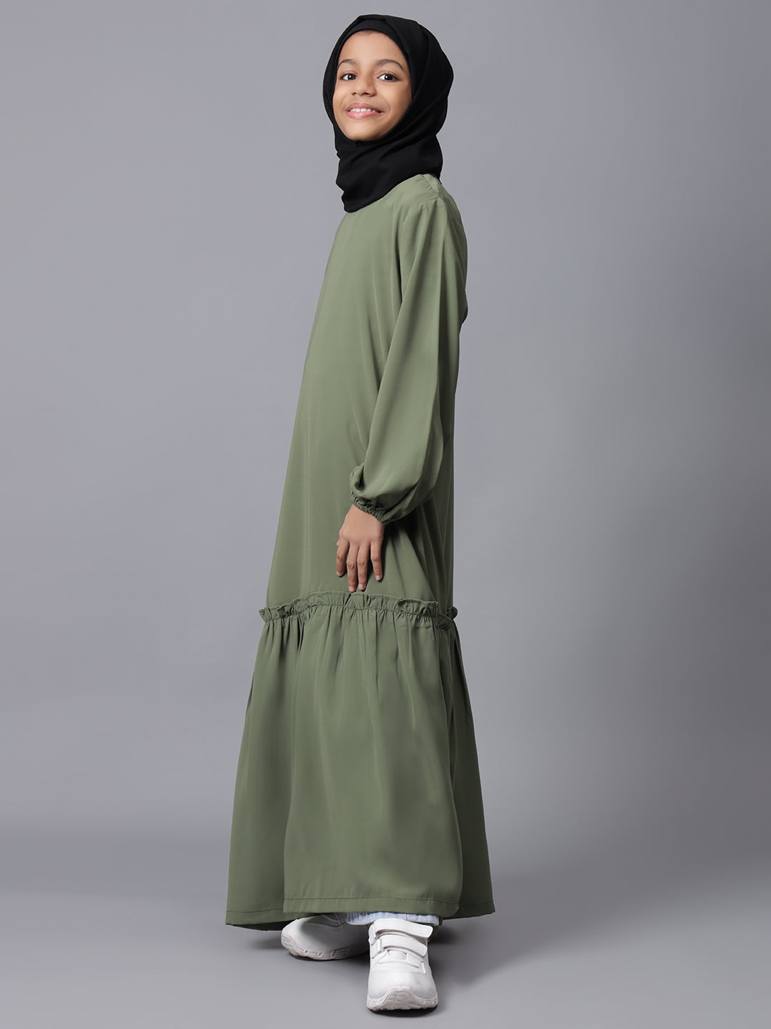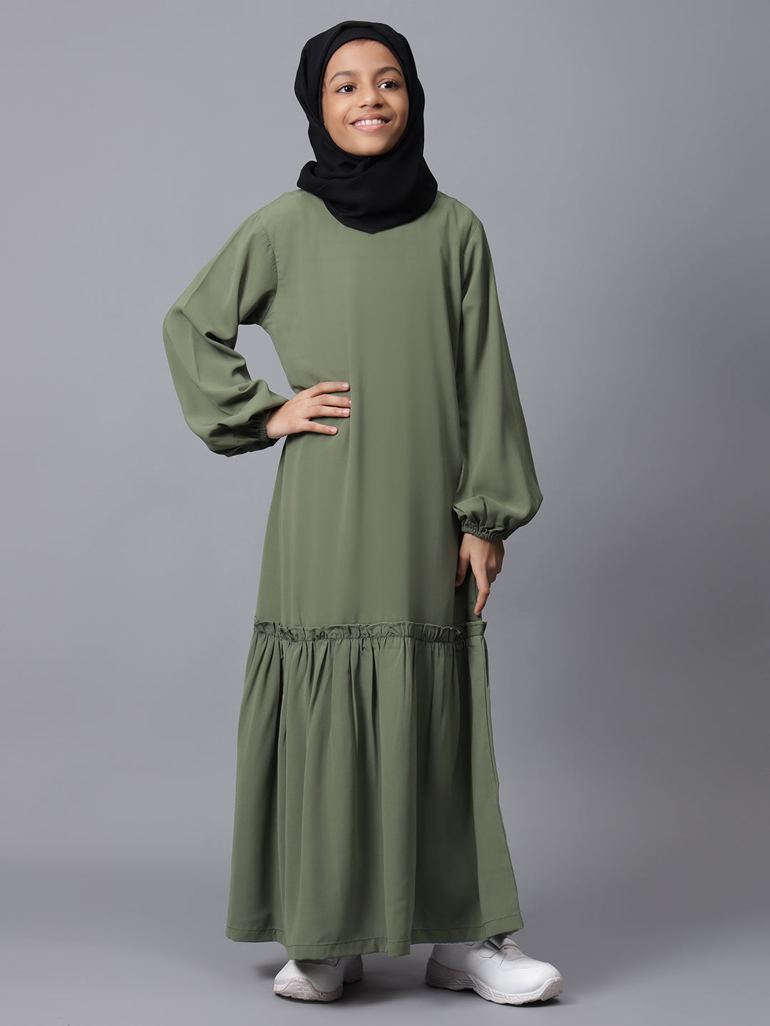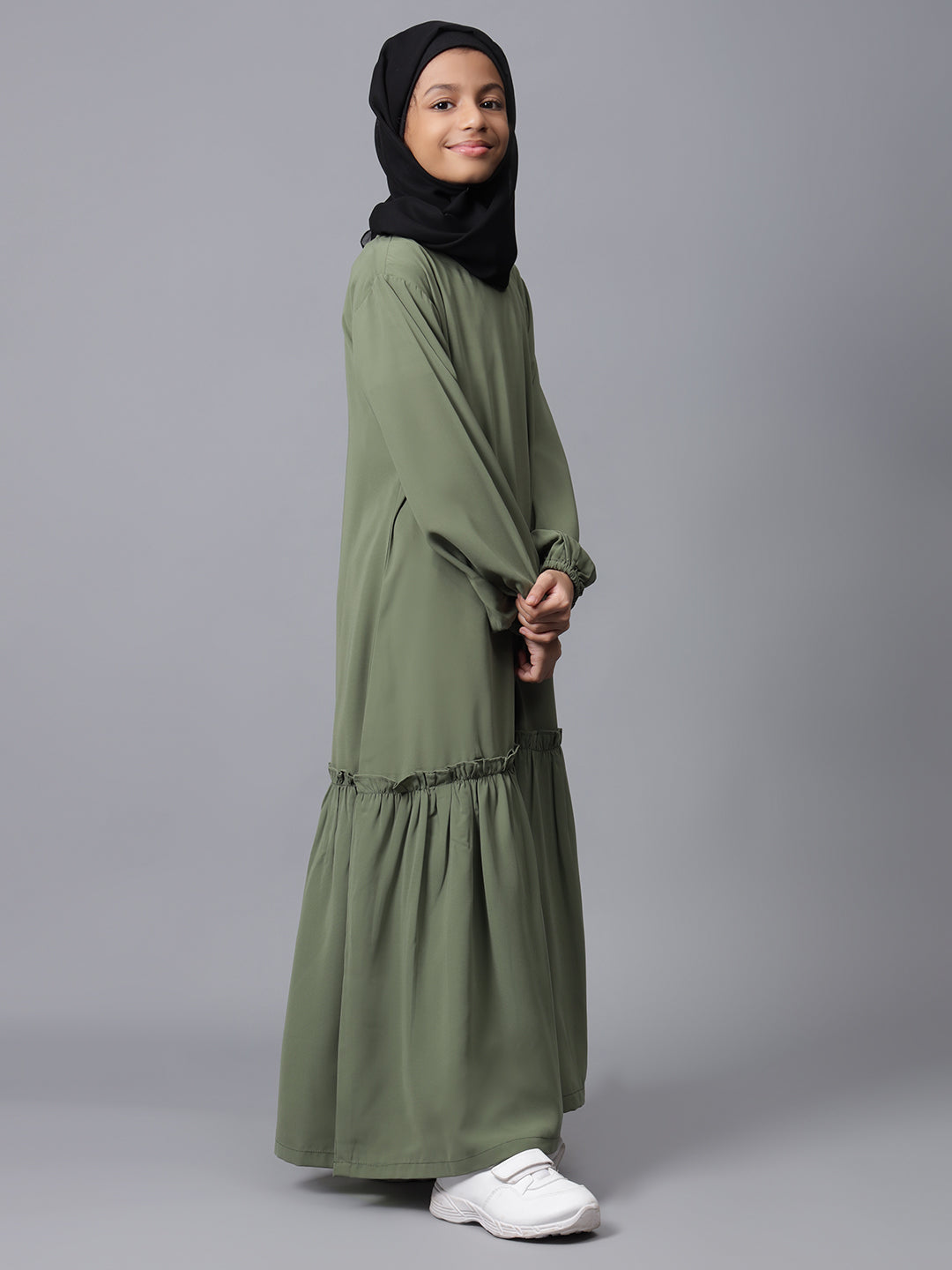 The A-line jade green abaya is a perfect choice for Muslim and Islamic girls, featuring stylish puffed sleeves. This solid-colored abaya offers a modest yet fashionable look, aligning with the latest trends. Designed to be both attractive and comfortable, it's an ideal outfit for any occasion, blending tradition with modern elegance.