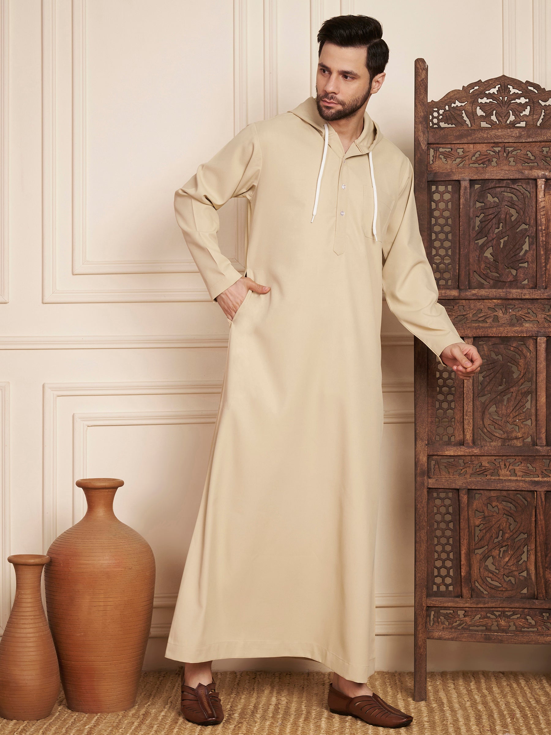 Enhance your traditional style with this men’s hoodie thobe / jubba, crafted from premium poly cotton material for a soft feel, airflow, and durability. Designed with a stand collar, full-length sleeves, and a comfortable straight cut, it ensures ease of movement. Featuring a front button closure and plain modern finish, this Islamic men’s jubba is ideal for namaz, mosque wear, Ramadan, Eid celebrations, daily use, cultural events, and formal occasions, delivering modest elegance with contemporary comfort.
