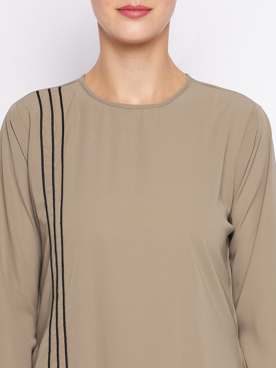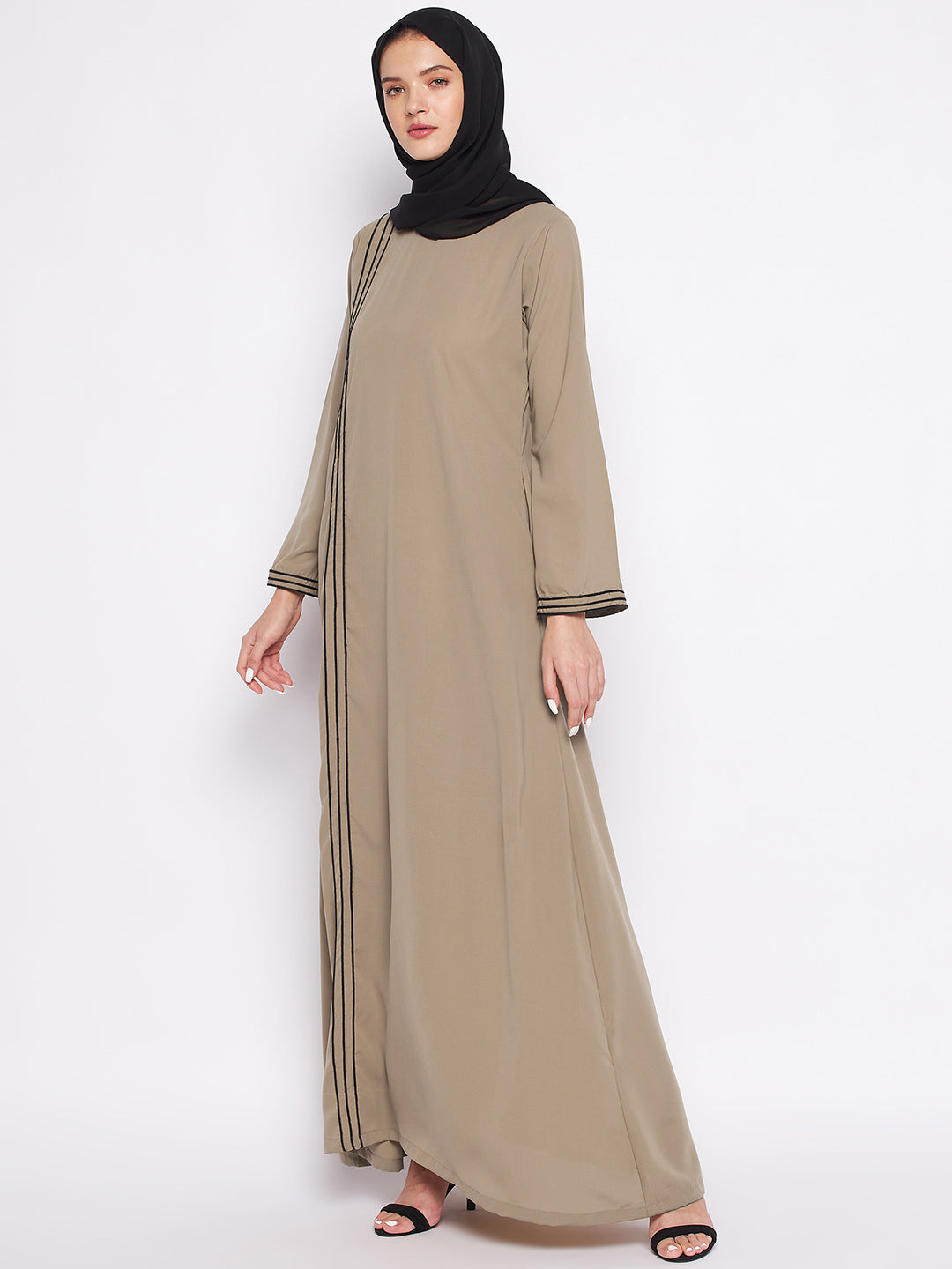 The Nabia A-Line Beige abaya for women combines elegance and functionality. It showcases contrast black piping on the sleeves and the right side, adding a stylish touch. Featuring convenient side pockets and crafted from comfortable Nida Matte fabric