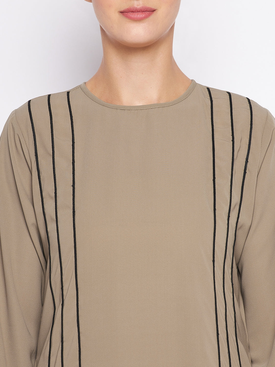 The Nabia A-Line Beige abaya for women is a stylish choice with contrasting black piping on both sides. It offers the convenience of side pockets and is crafted from comfortable Nida Matte fabric. This abaya combines fashion and practicality elegantly.