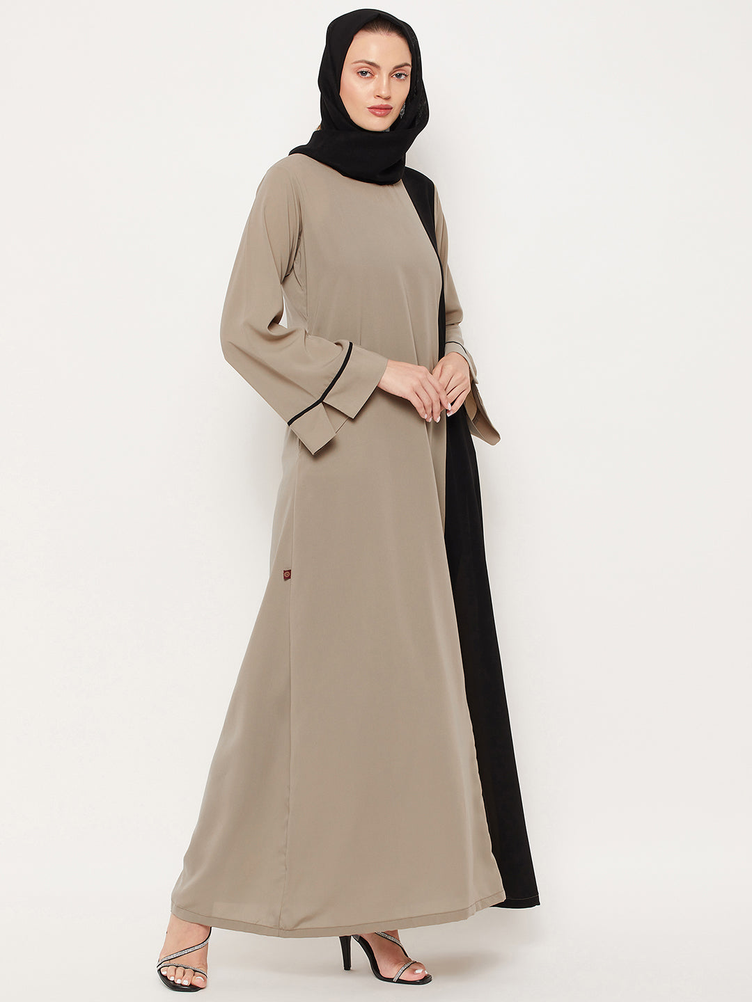 Nabia's A-Line Abaya Dress for women features a stylish black and beige color combination with black piping on the sleeves. The long & flared sleeves and both side pockets add practicality, making it a sophisticated and functional choice for modern Muslim women.