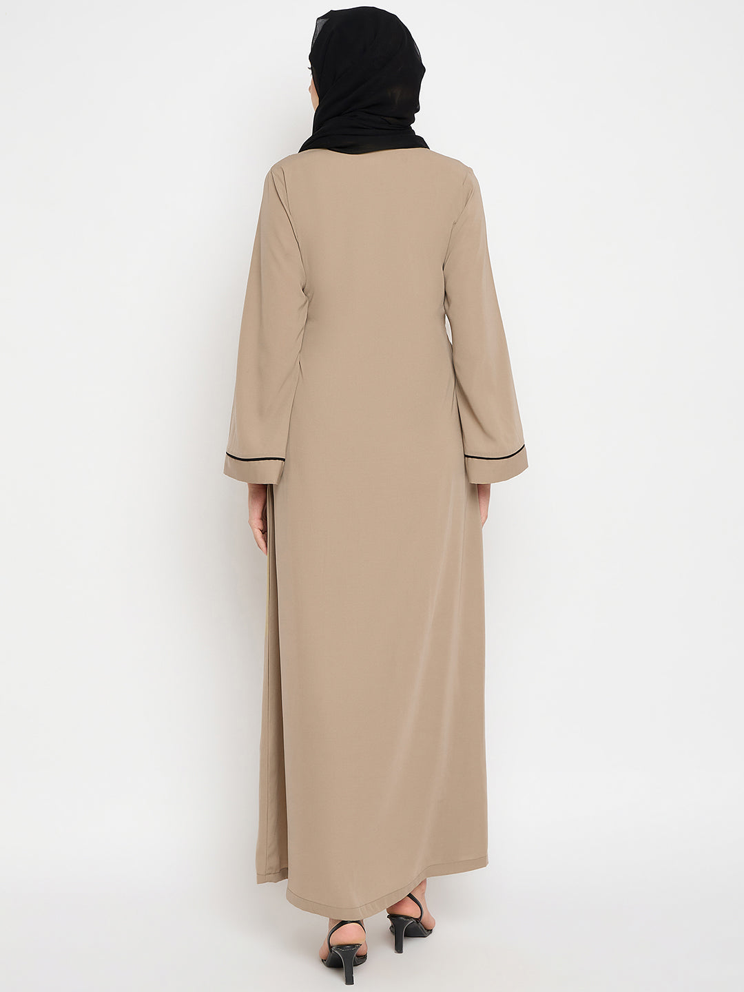 This Beige Luxury Abaya is crafted from soft Nida matte fabric, perfect for festive and party wear. It features round neck, delicate handwork detailing, black piping details on the both sleeves and side pockets. Ideal for Islamic women, this abaya combines elegance and modesty effortlessly, offering both style and comfort.