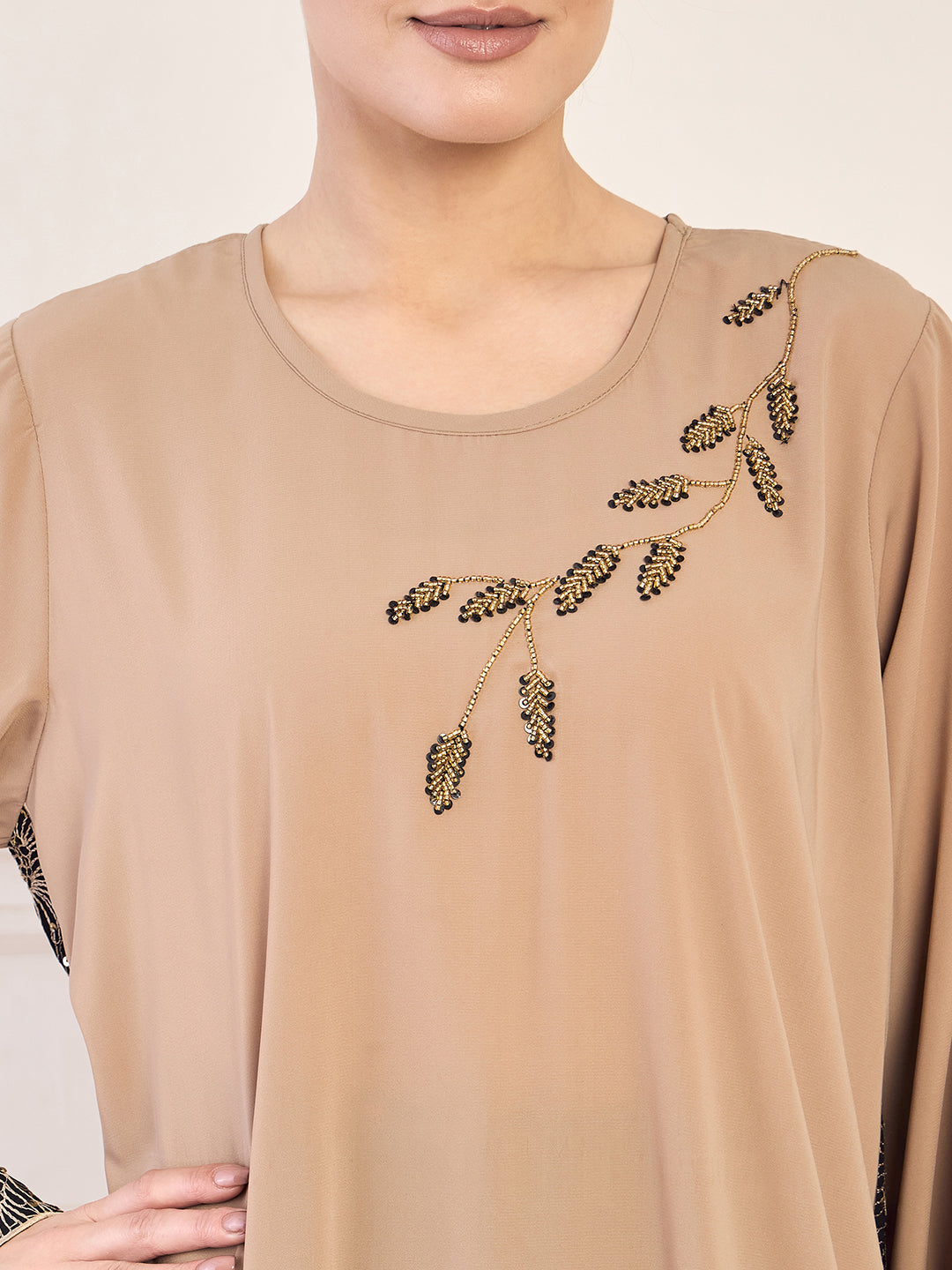 This beige solid luxury embroidered abaya burqa beautifully blends elegance and modesty, making it a perfect choice for Islamic women. Crafted from premium nida matte fabric, it features intricate handwork detailing that adds a touch of sophistication. The relaxed fit ensures all-day comfort, while the slip-on closure allows for effortless wear. Ideal for special occasions, this abaya exudes timeless charm and embraces contemporary modest fashion. A versatile wardrobe staple, it’s designed for those seeking refined, modern style with graceful appeal.