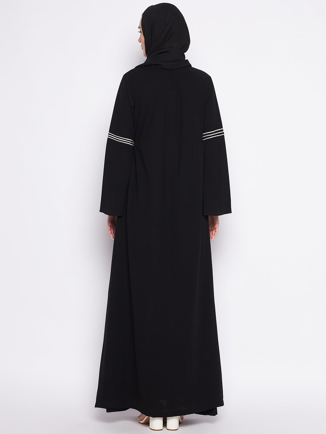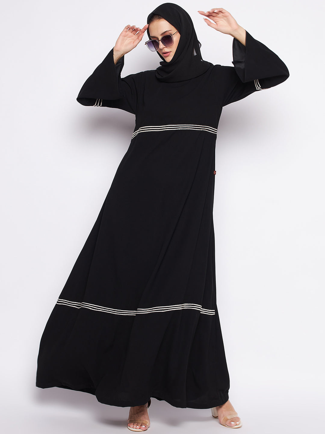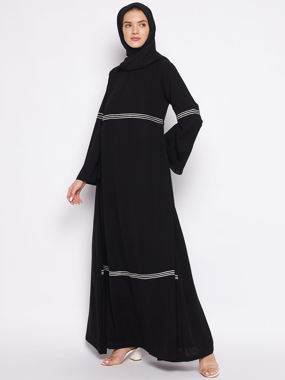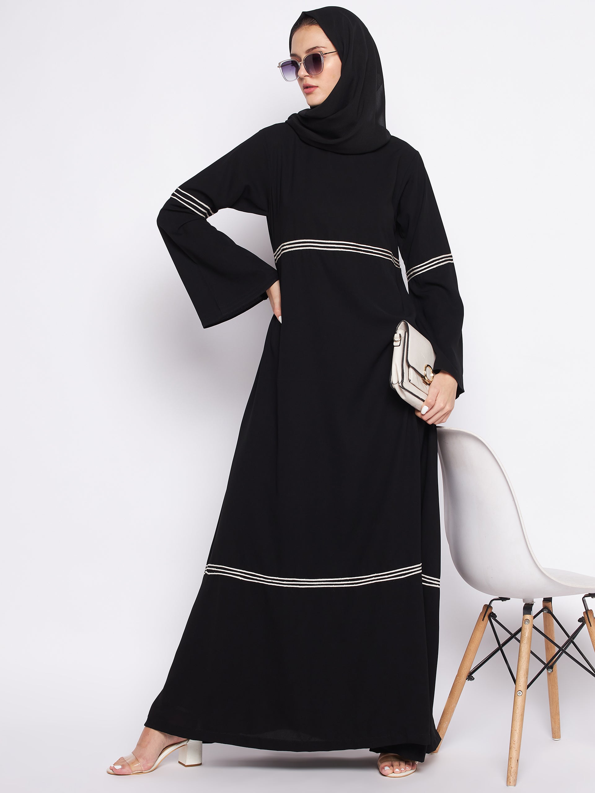 The Nabia A-Line Black abaya for women is a classic piece with contrasting white piping on the sleeves, bottom, and front, adding a touch of sophistication. Crafted from comfortable Nida Matte fabric, it exudes timeless style and modesty.