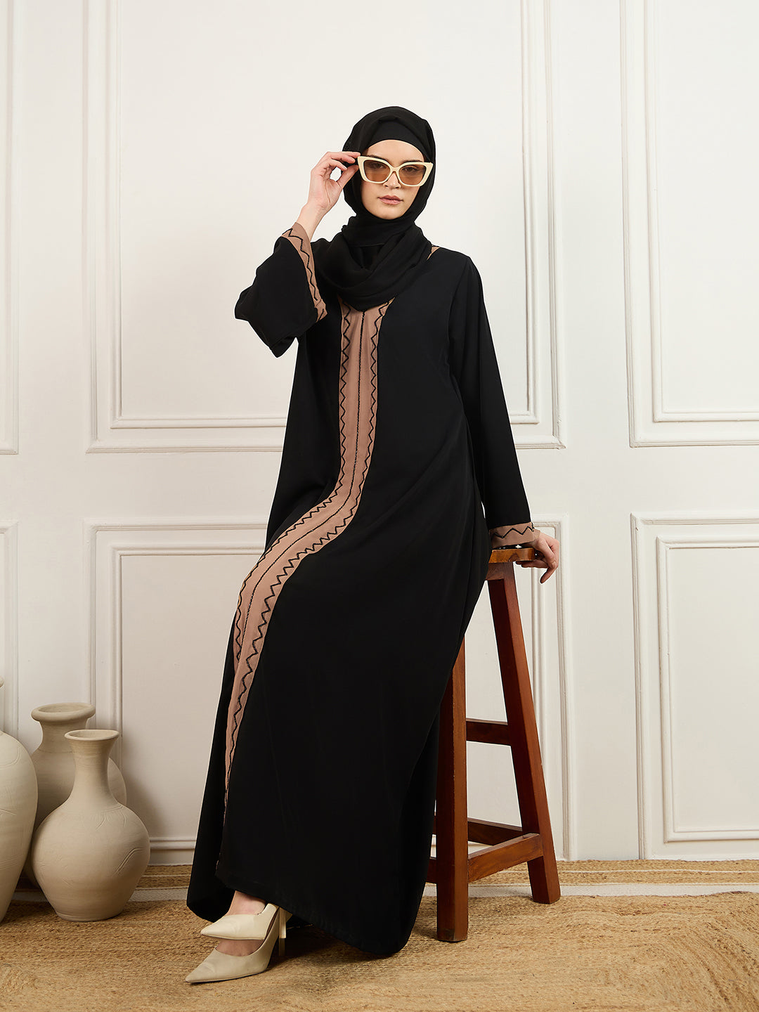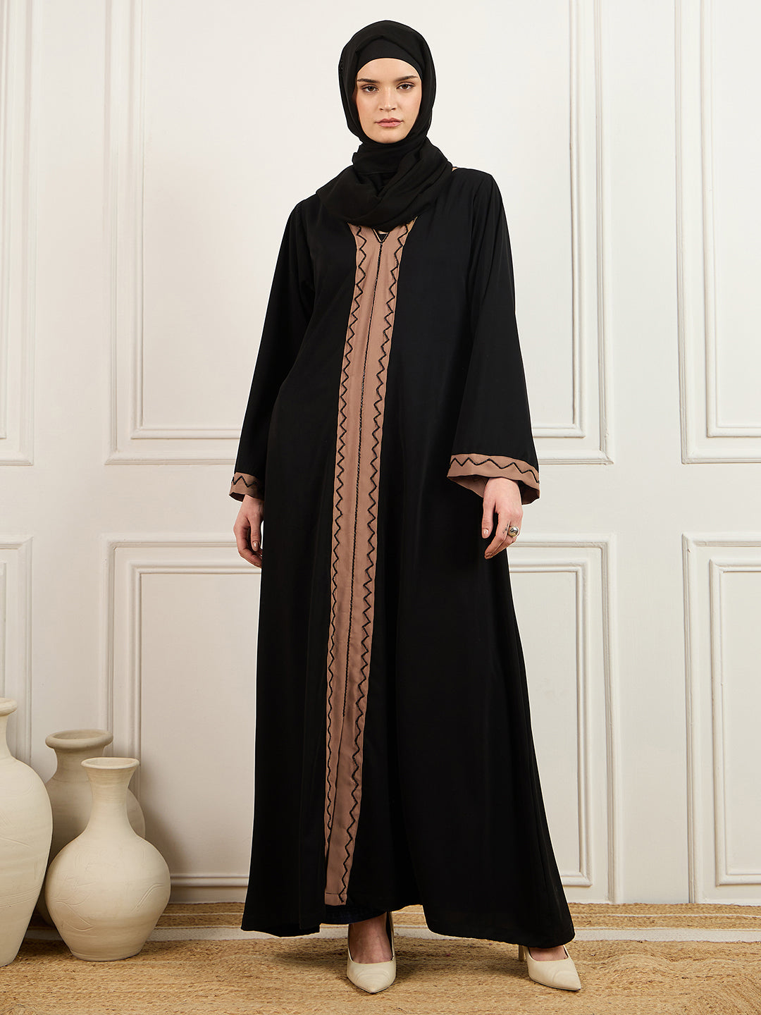 Elevate your modest wardrobe with this black and beige solid luxury abaya burqa, crafted from premium Prada fabric. Designed for Islamic women, it features exquisite handwork on the front and sleeves, blending elegance with tradition. The relaxed fit offers comfort throughout the day, while the stylish V-look neckline and easy slip-on design make it perfect for special occasions. A refined choice for those who value modesty, grace, and a subtle touch of luxury.