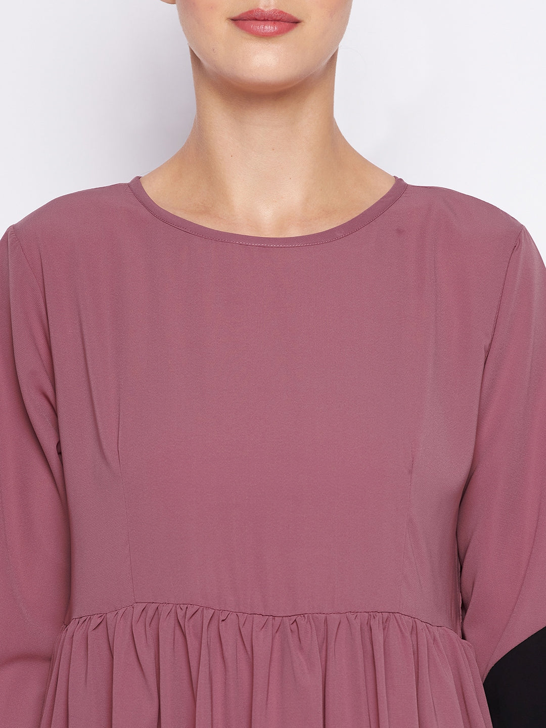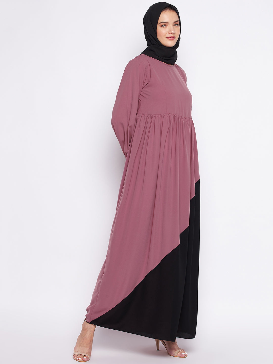 Nabia's Abaya Dress for women features a charming two-color combination of puce pink and black. The long & puffed sleeves, enhanced with elastic for adjustment, create a stylish and comfortable ensemble for contemporary Muslim women seeking both modesty and fashion.