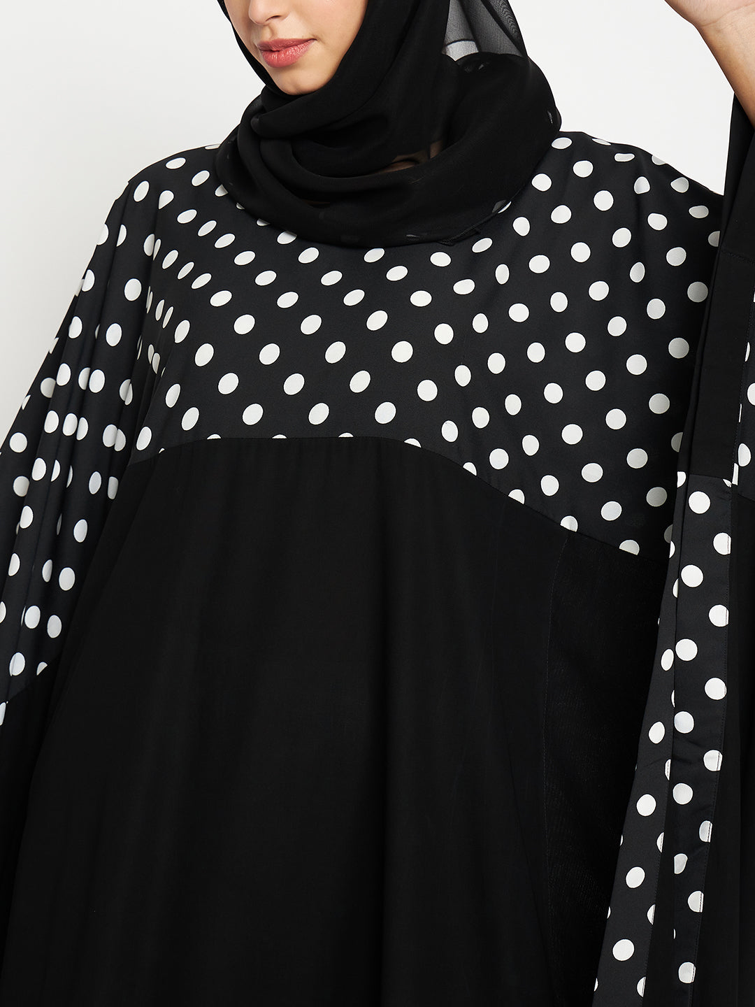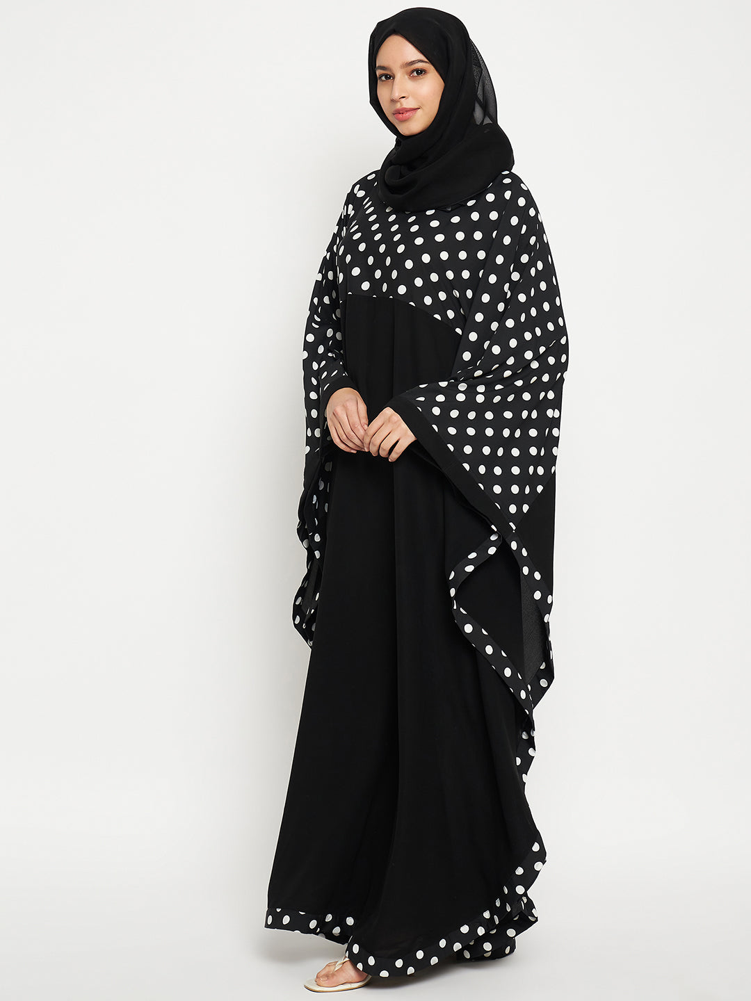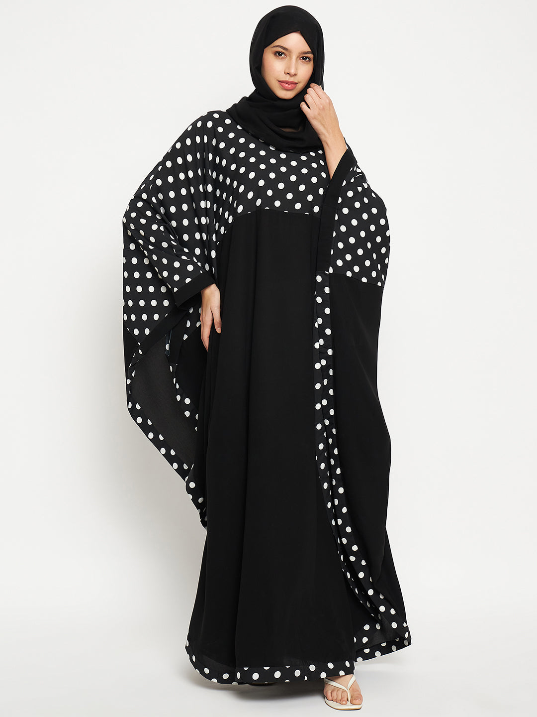 Elevate your modest wardrobe with this black and white polka dot printed kaftan tailored for Islamic and Muslim women. Crafted from crepe fabric, it boasts long, free sleeves and a loose fit for comfort. This modest attire exudes elegance and versatility for various occasions.