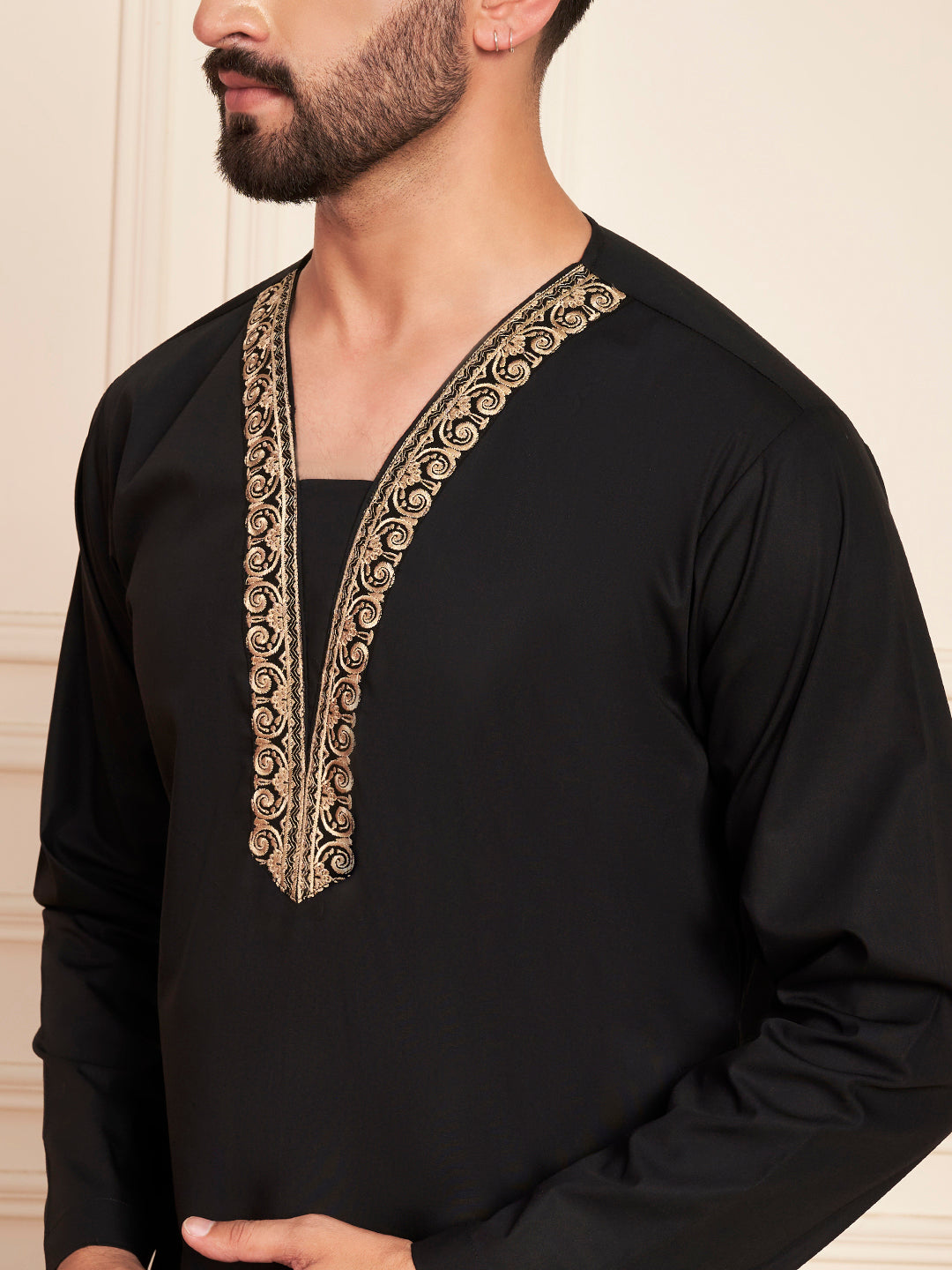 Elevate your modest wardrobe with this black embroidered men’s thobe, made from lightweight, breathable cotton fabric for all-day comfort. Featuring a classic V-neckline, slip-on closure, and elegant embroidery detailing, this Islamic thobe for men blends tradition with timeless style. The smart black color adds a refined touch, making it perfect for daily wear, Jummah prayer, mosque visits, Eid celebrations, Ramadan gatherings, and casual outings.