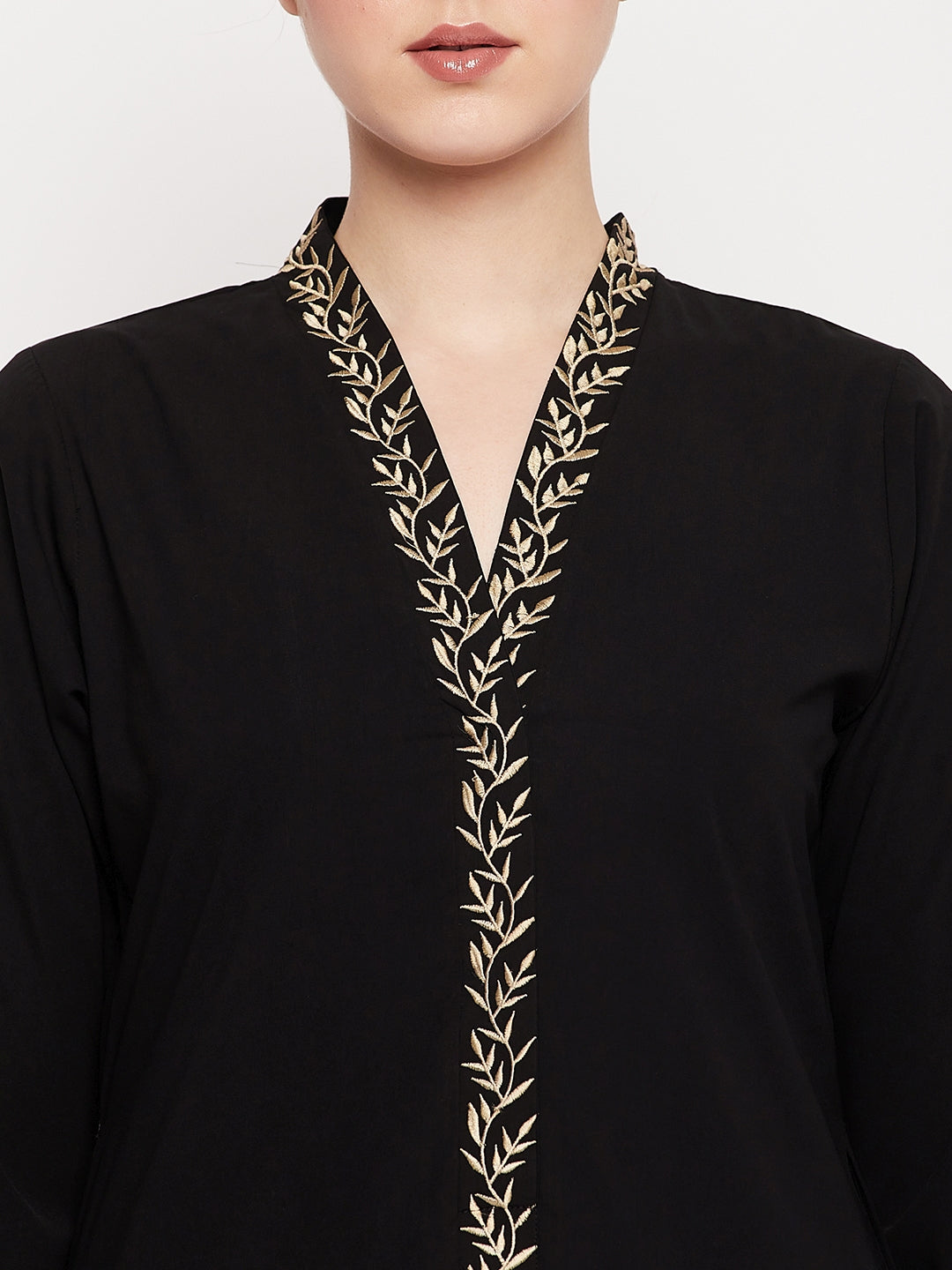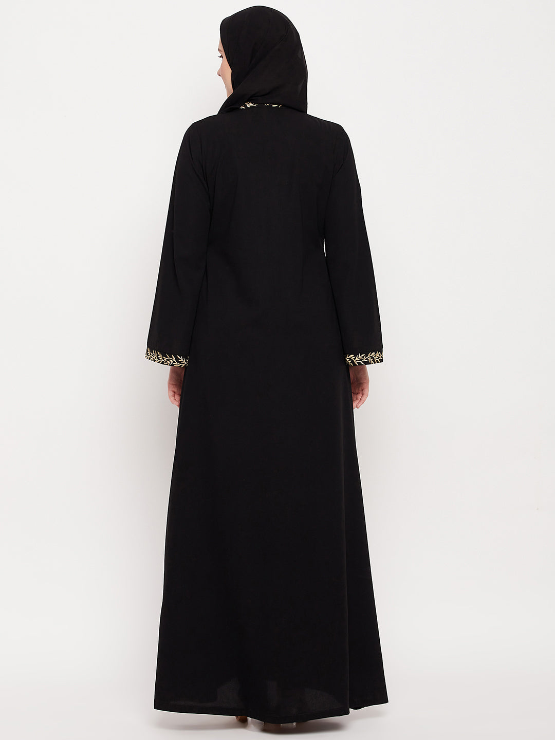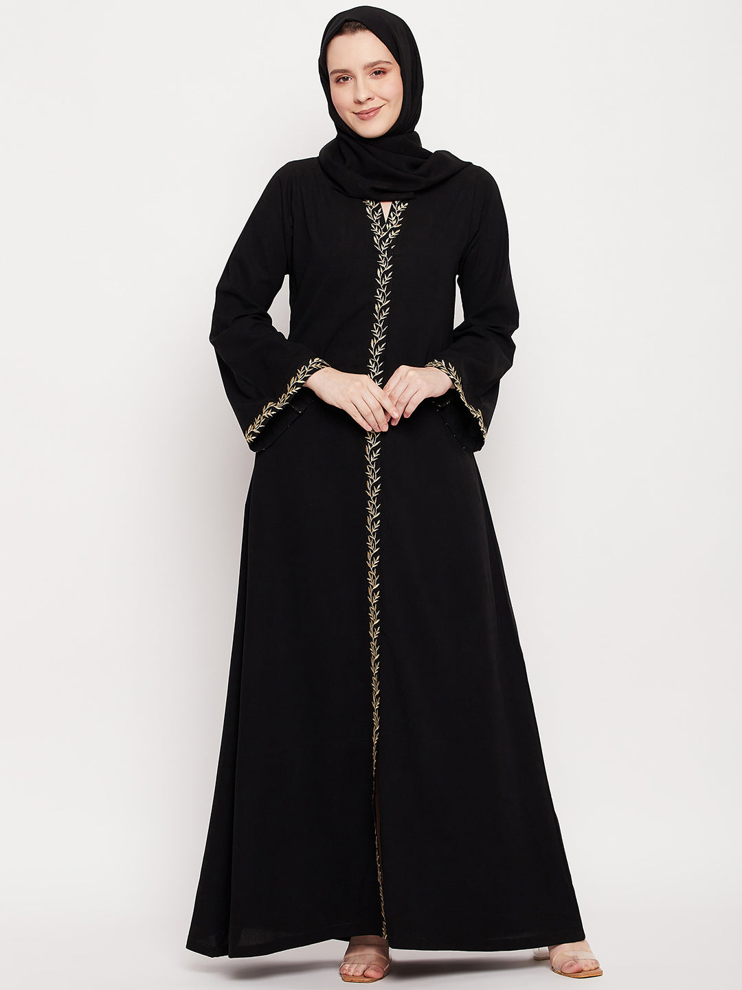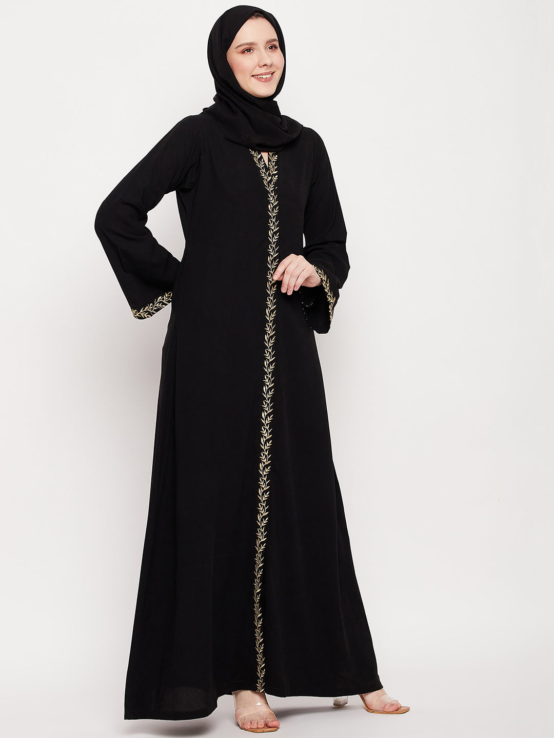 Elevate your modest wardrobe with this front-open sea green Kefiyyeh Abaya adorned with black embroidery. Crafted from comfortable Nida matte fabric, featuring free sleeves, side pockets, and a modest design, it is tailored for Islamic women seeking both style and ease.