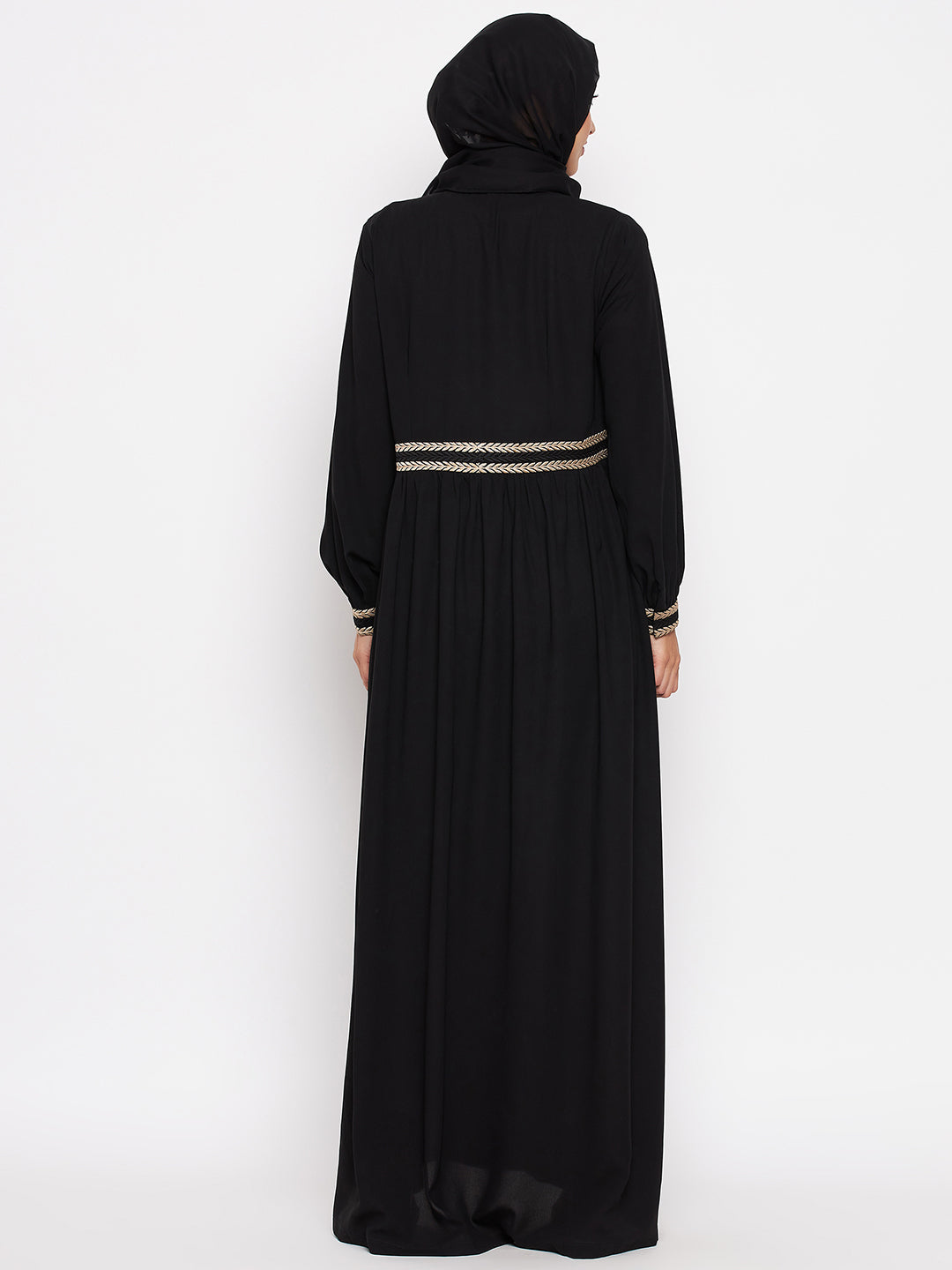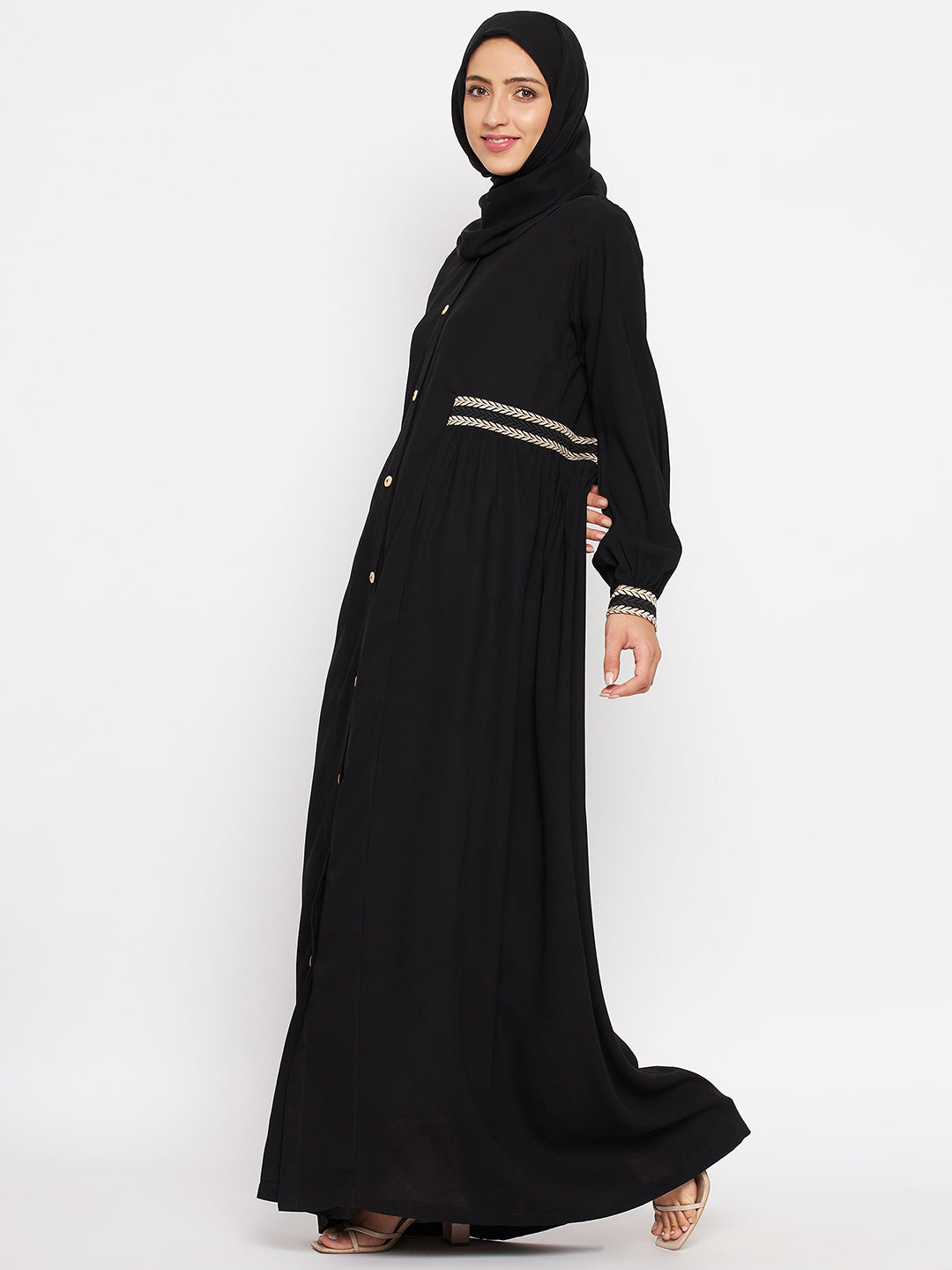 Nabia's Black Embroidery Abaya is a sophisticated choice for Muslim women seeking modesty and style. Crafted from high-quality Nida Matte Fabric, it features intricate embroidery on the back and sleeves, adding an elegant touch to the design. Available online, this Abaya enables women to express their faith gracefully while staying fashionable and true to their cultural values.