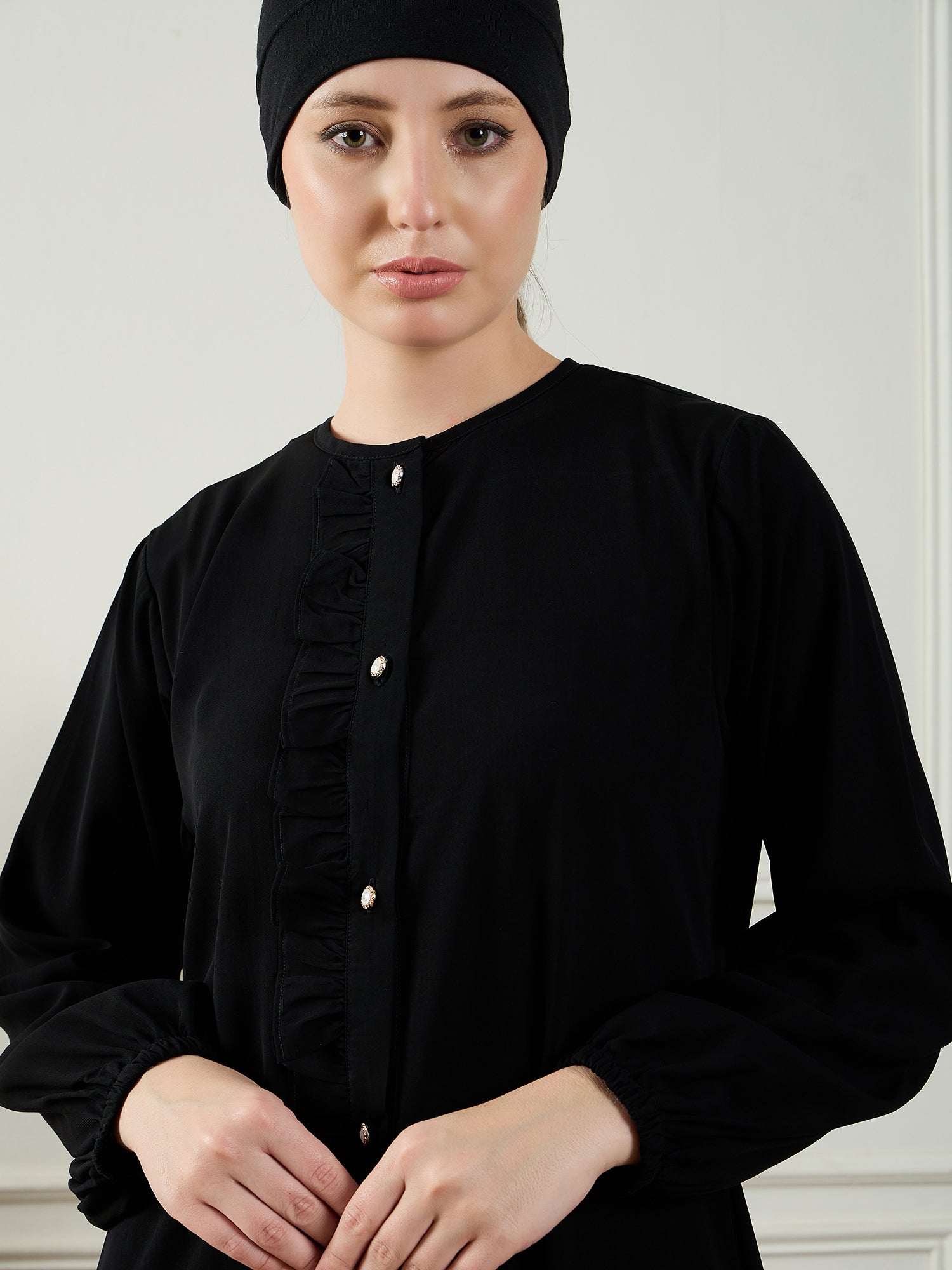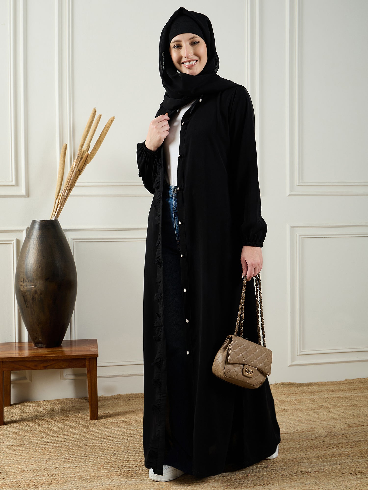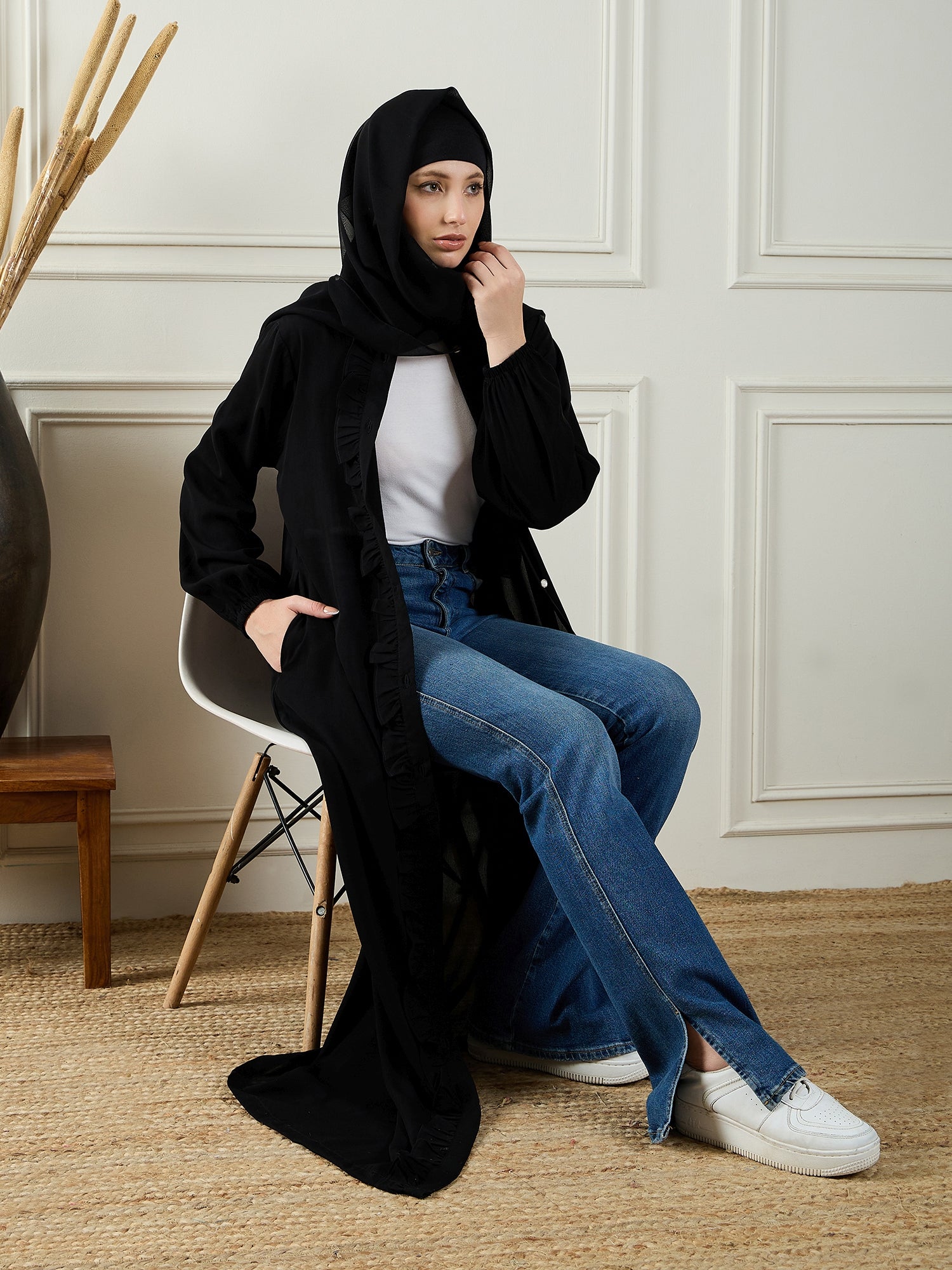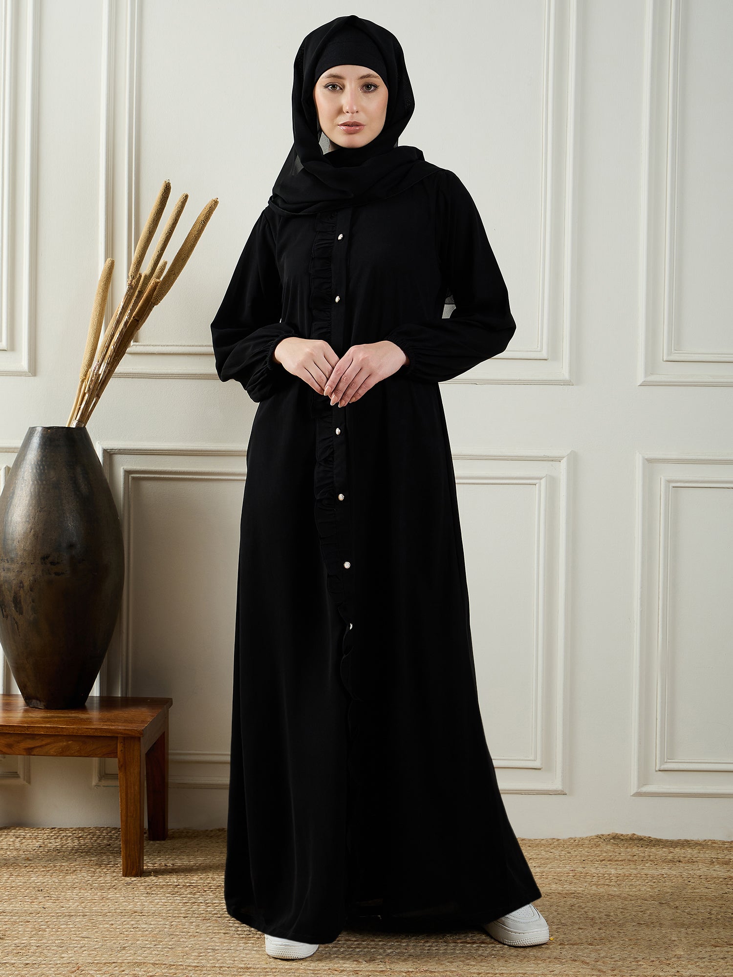The Nabia Black Ruffle Abaya is an elegant and modern choice for modest Muslim women. Crafted from soft Nida matte fabric, it offers a smooth, luxurious feel that ensures comfort throughout the day. The abaya's front-open design is enhanced by a round neckline, providing a sleek and versatile look. Stylish puffed sleeves add a touch of sophistication, while the ruffled detailing brings a trendy element to the solid black silhouette. This abaya combines fashion with modesty, making it perfect for women who appreciate both elegance and ease in their wardrobe.