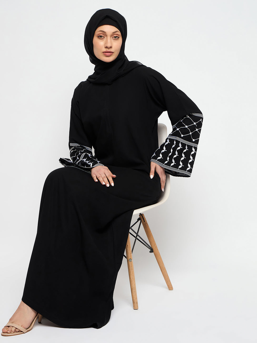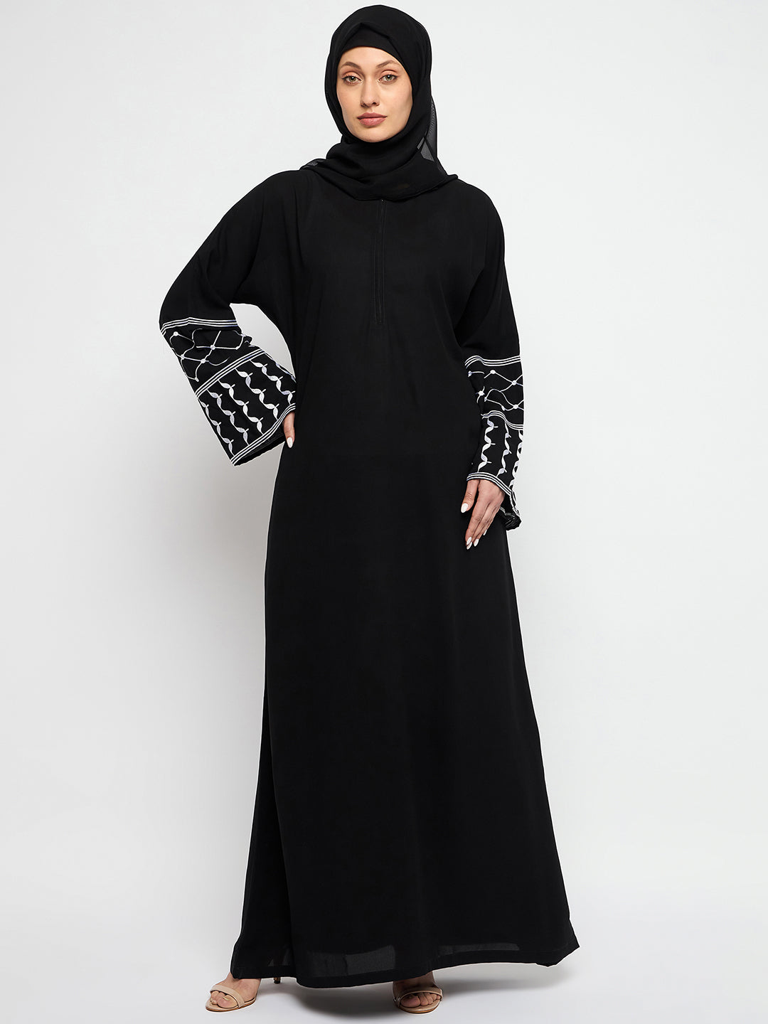 Elevate your style with the black Palestine Abaya, adorned with intricate embroidery inspired by Palestinian heritage. Crafted from breathable Nida matte fabric, featuring, zip closure, free sleeves, a round neck, and a solid pattern, this abaya embodies modesty, comfort, and cultural grace for Islamic women.