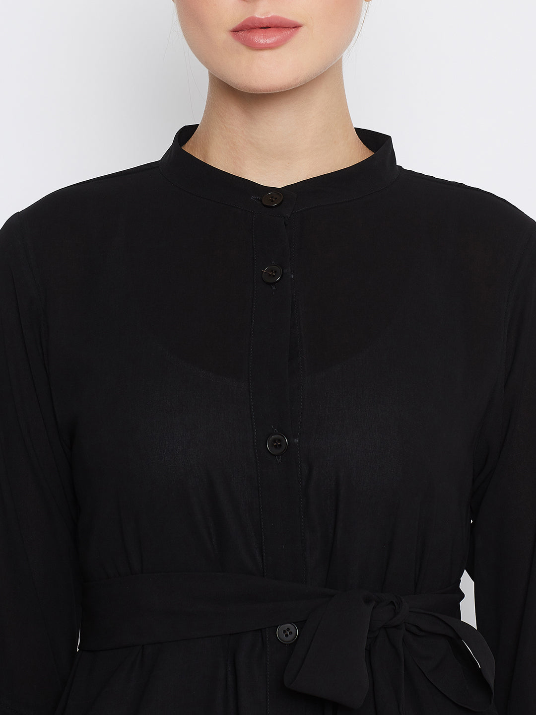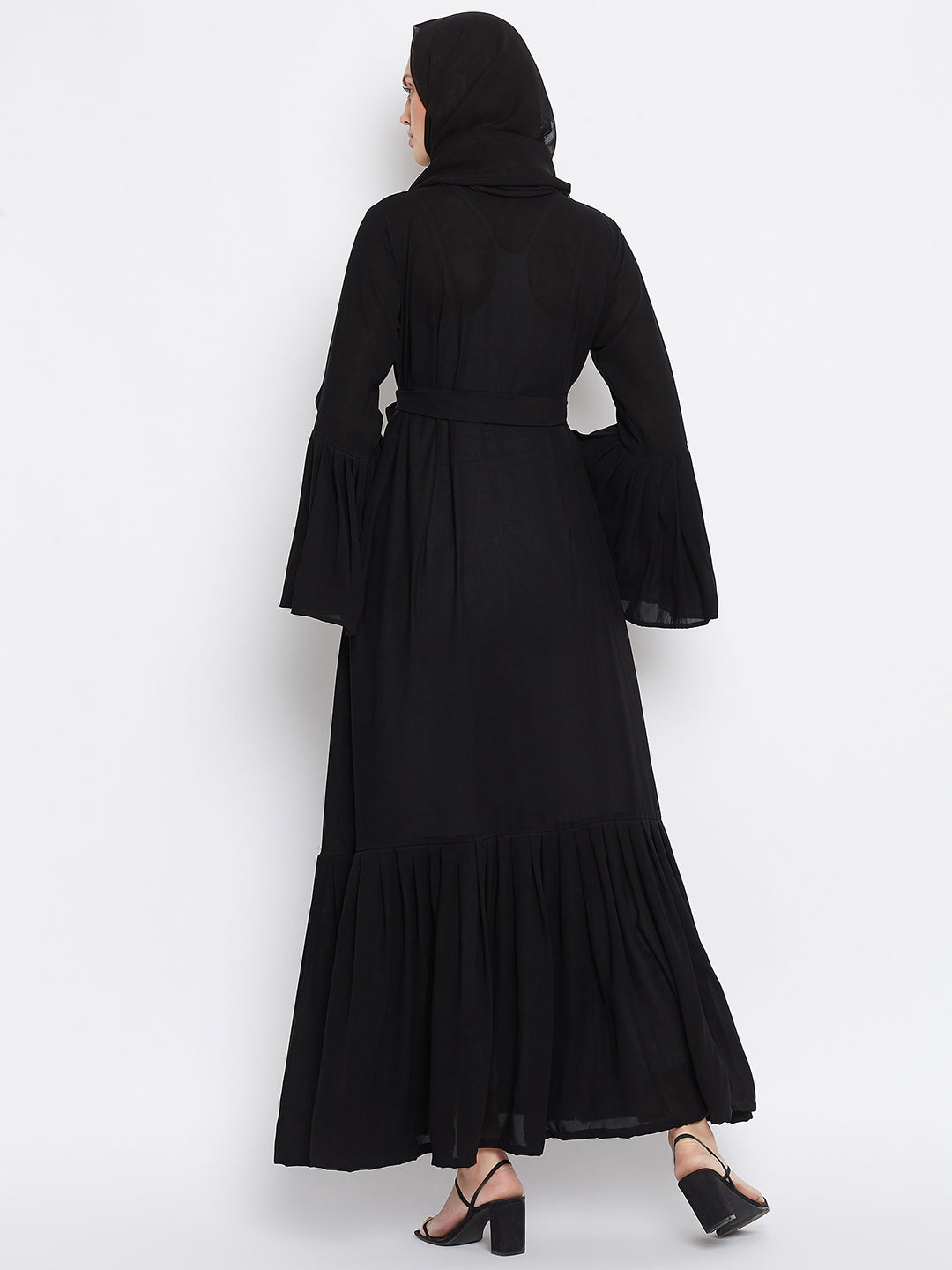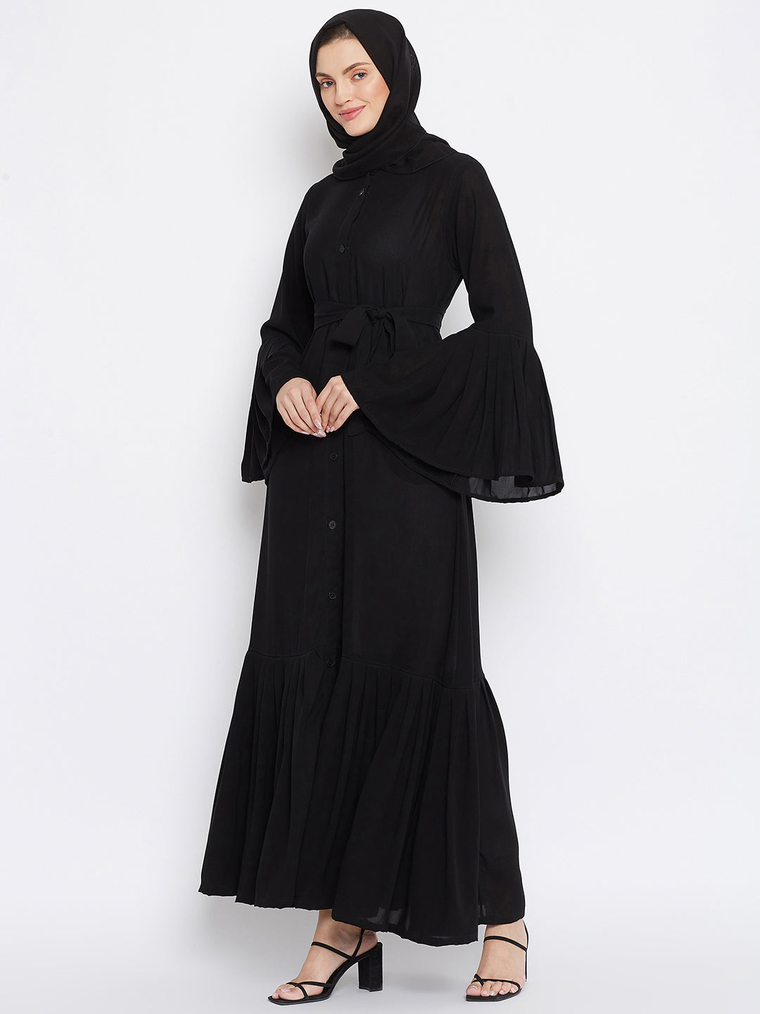 Nabia's Front Open Abaya Dress for women is tailored from solid Nida Matte fabric, featuring a plate design on the sleeves and bottom. The long & umbrella sleeves, mandarin collar, and both side pockets offer a perfect blend of style and functionality for contemporary Muslim women.