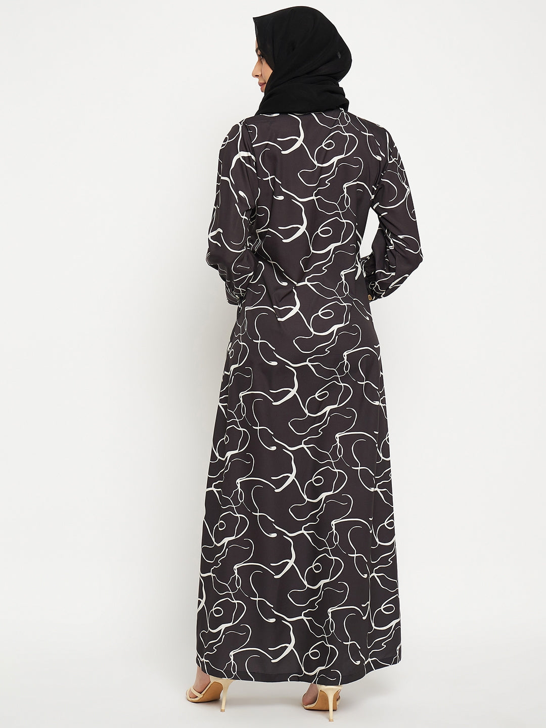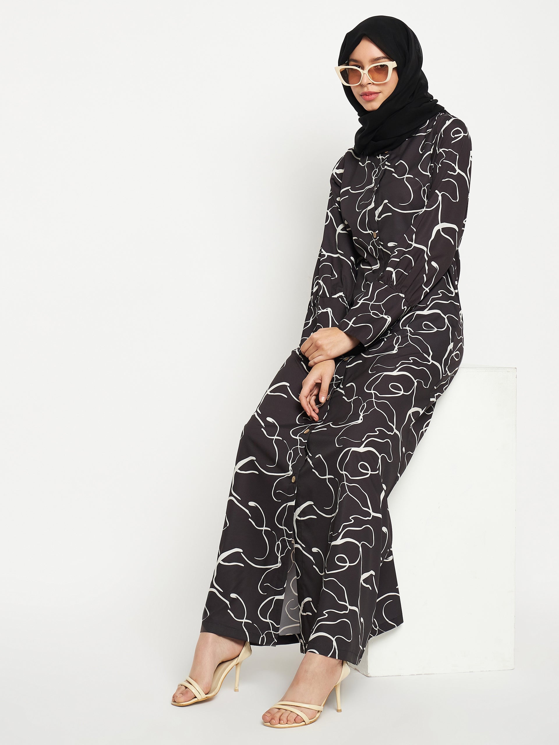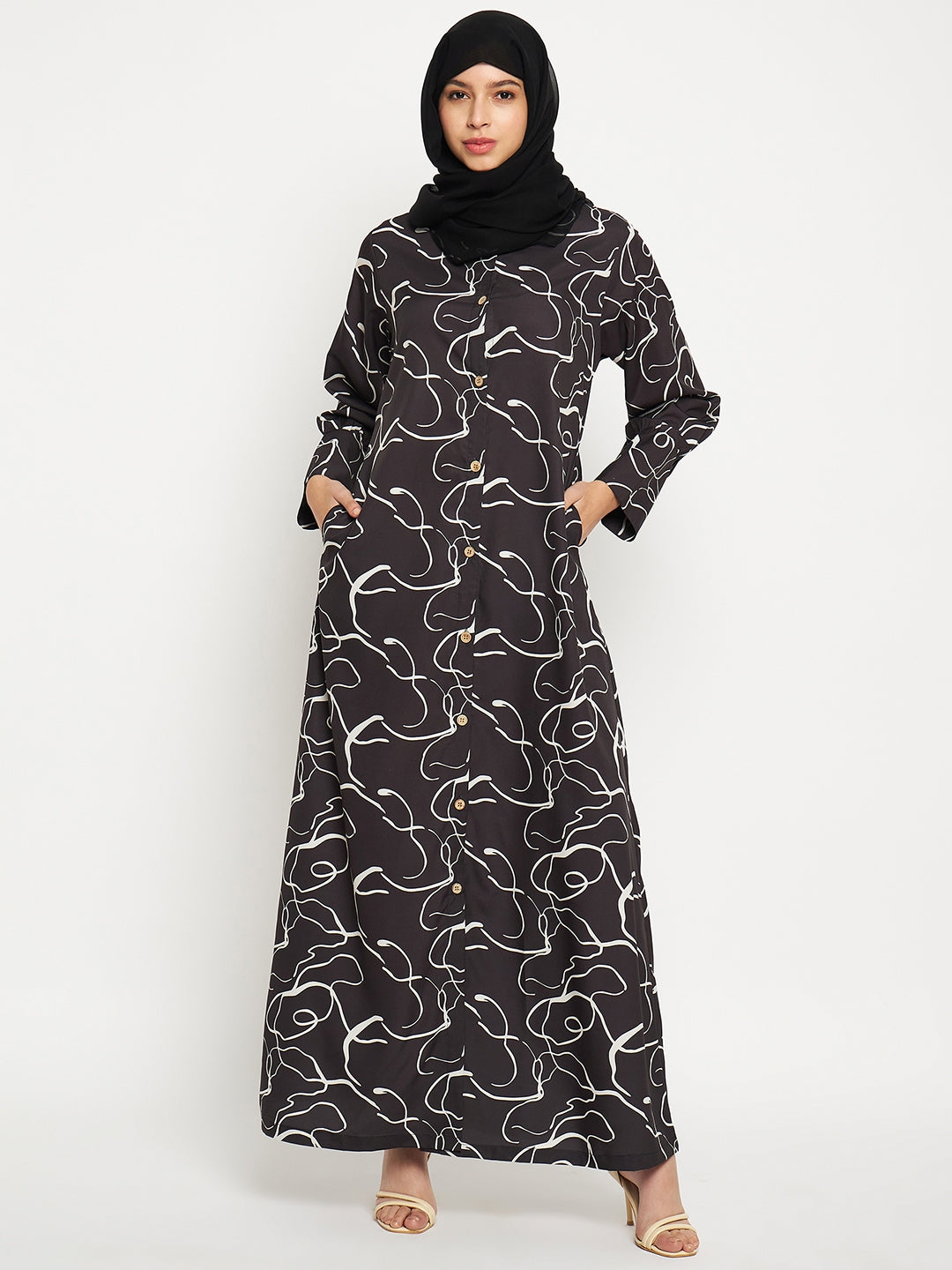Printed can never go out of trend. Nabia has a printed abaya design that is very highly appreciated that allows you to make a fashion statement wherever you go. This beige and black daily wear front open side pocket Abaya dress is an enduring addition to your wardrobe collection.