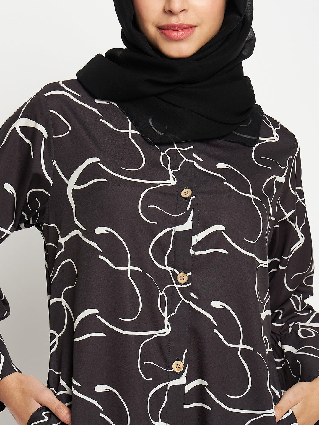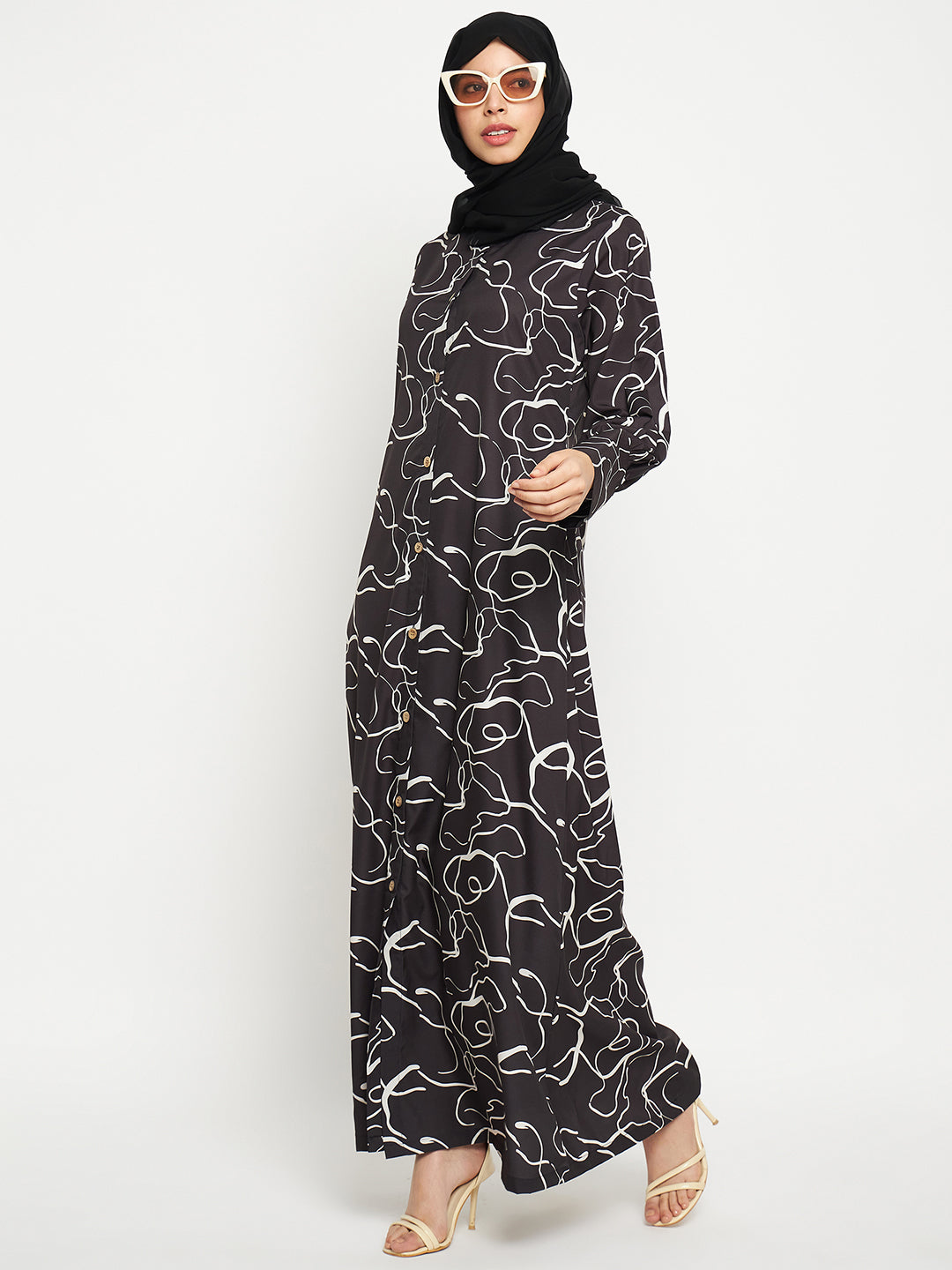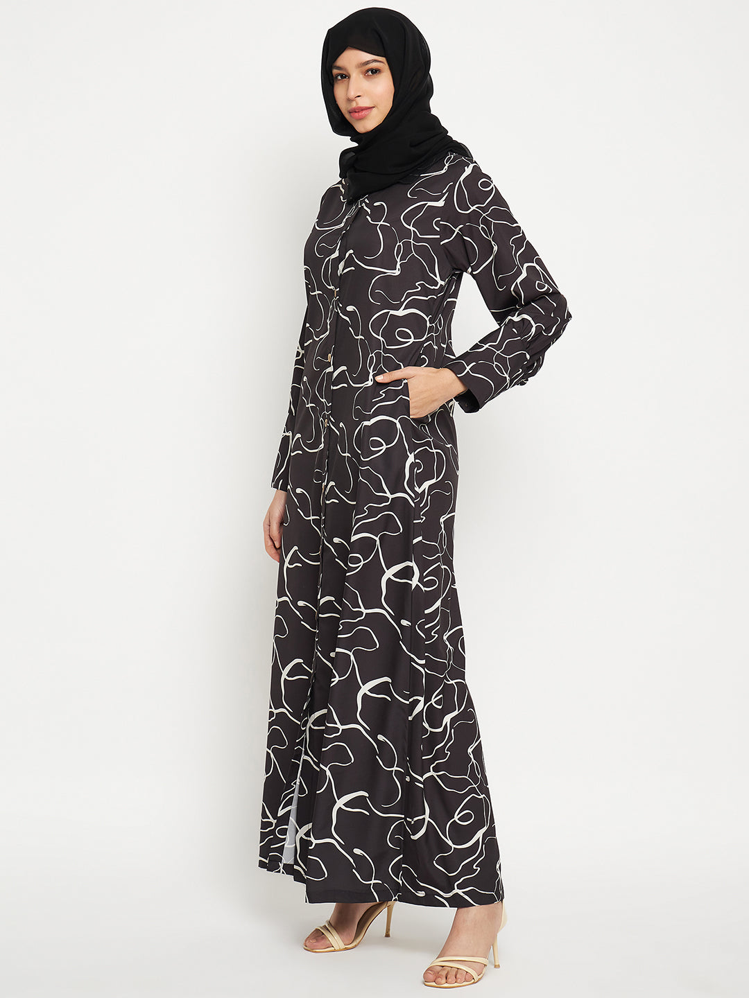Printed can never go out of trend. Nabia has a printed abaya design that is very highly appreciated that allows you to make a fashion statement wherever you go. This beige and black daily wear front open side pocket Abaya dress is an enduring addition to your wardrobe collection.
