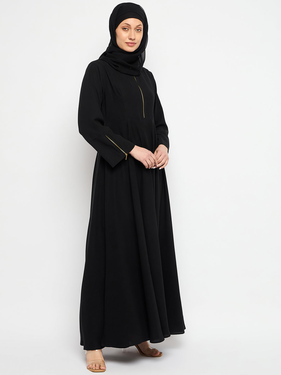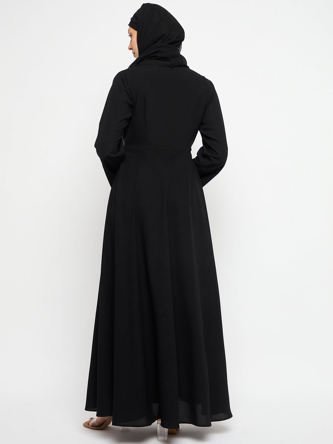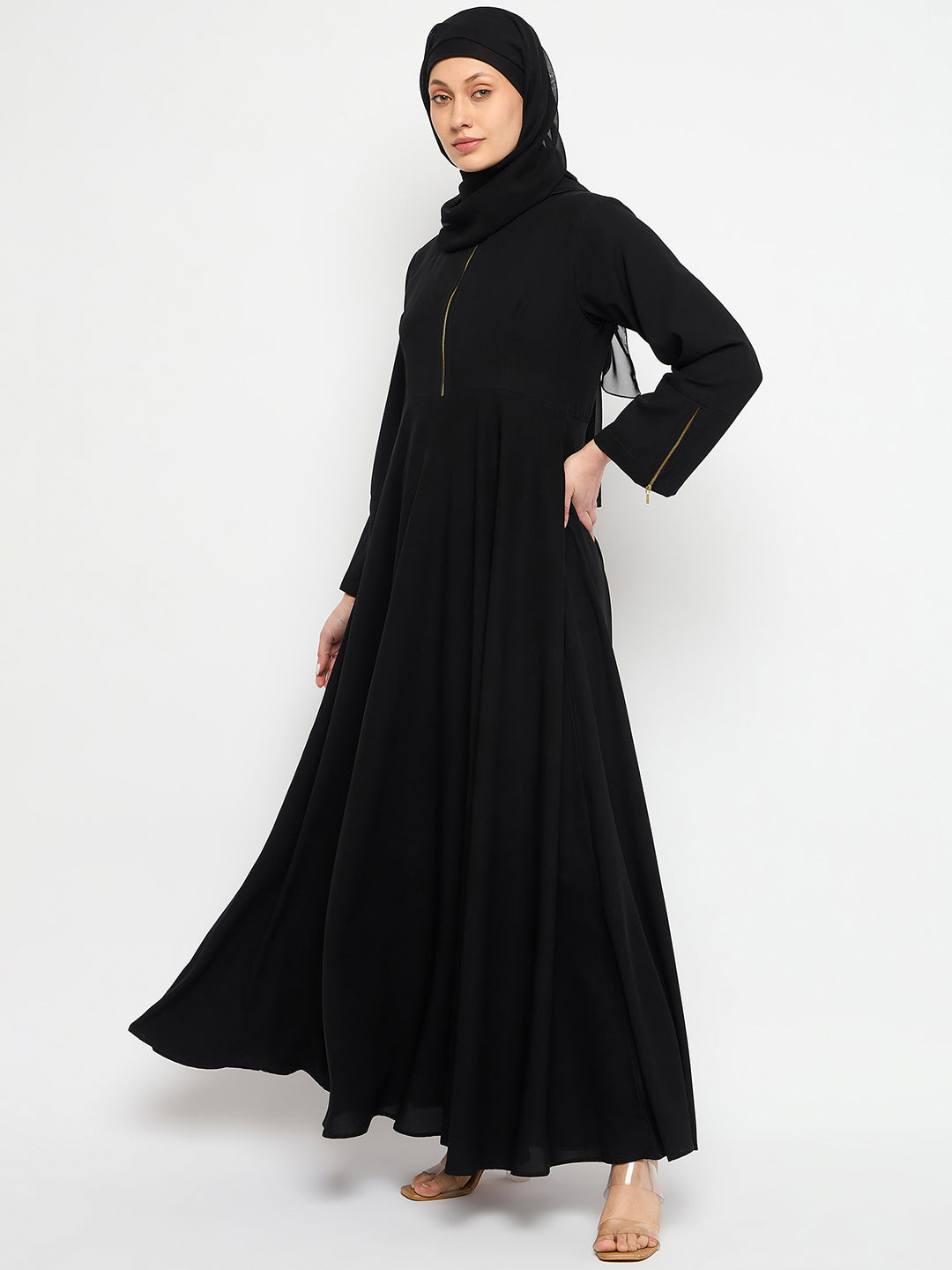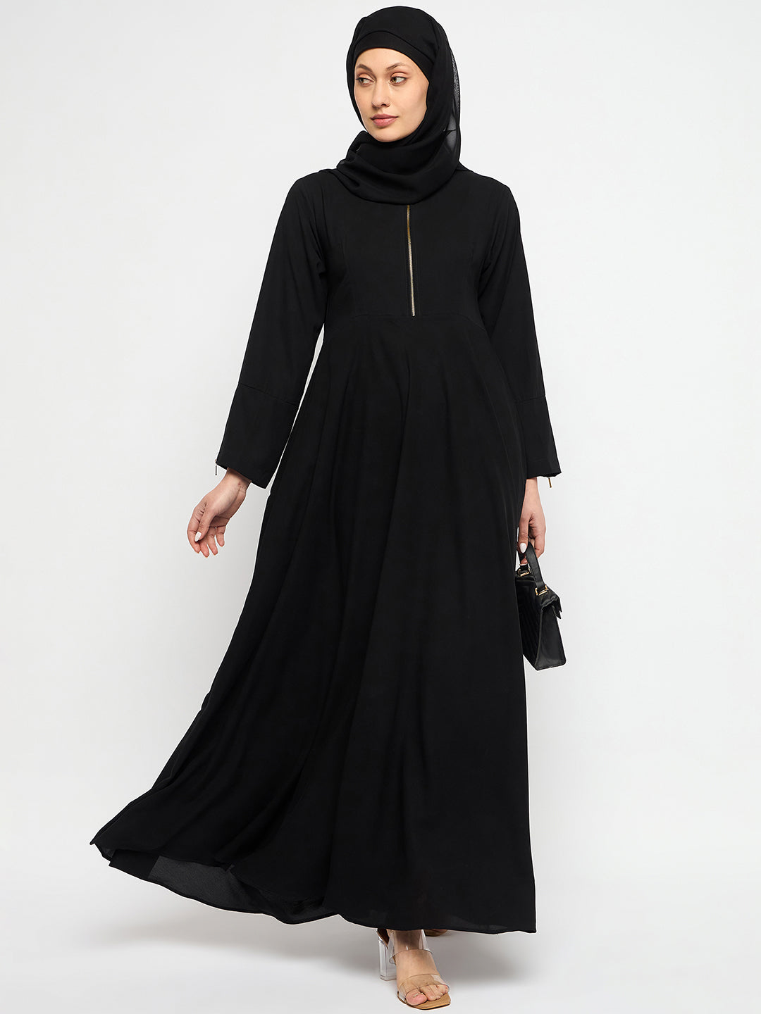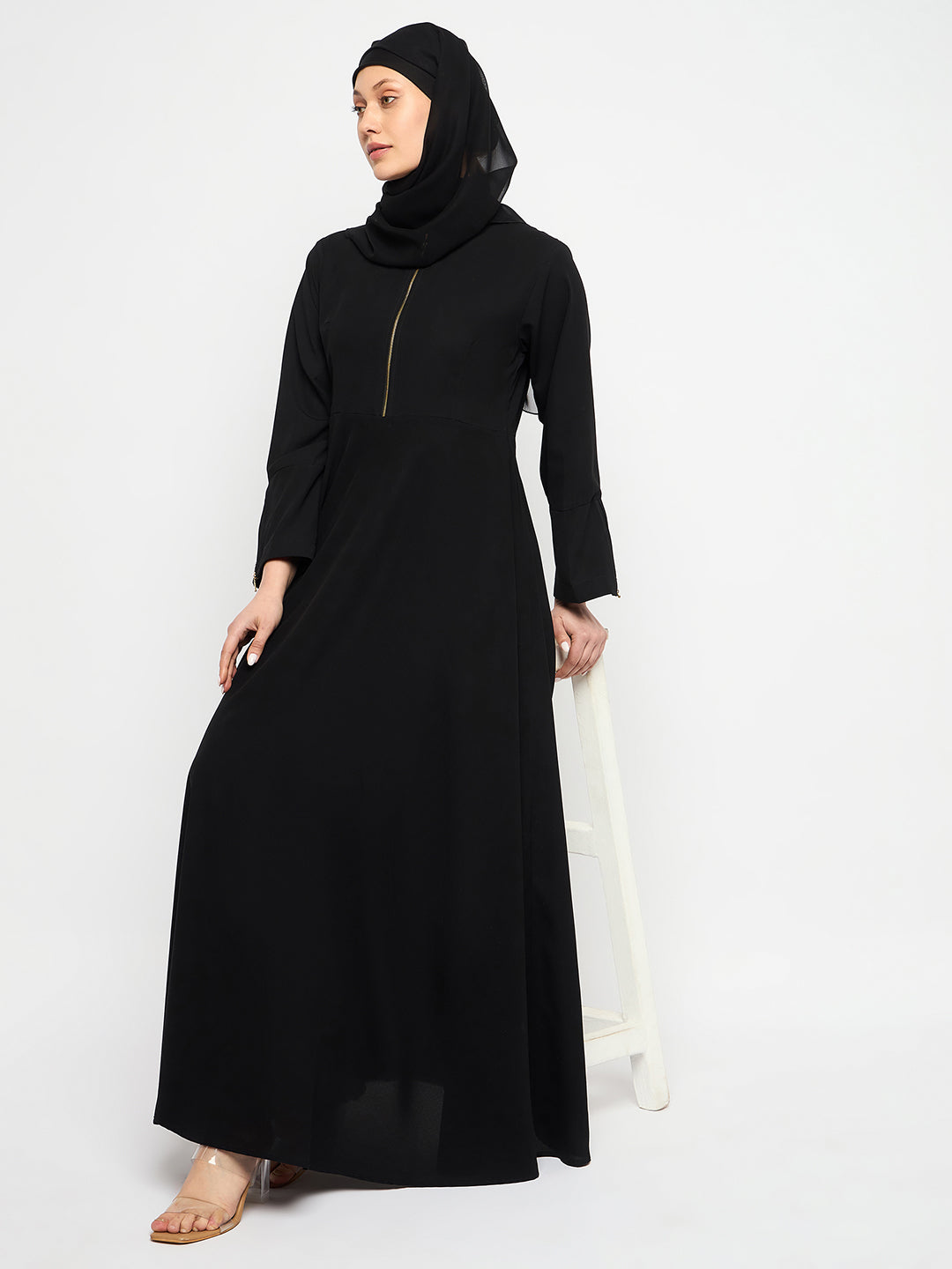 Indulge in femininity with the Black Abaya Dress. Featuring a front zip closure, mandarin collar, and bell sleeves, this solid nida matte fabric abaya combines comfort and style. Ideal for all seasons, it effortlessly embodies modesty, offering Islamic women a chic and comfortable fashion choice.