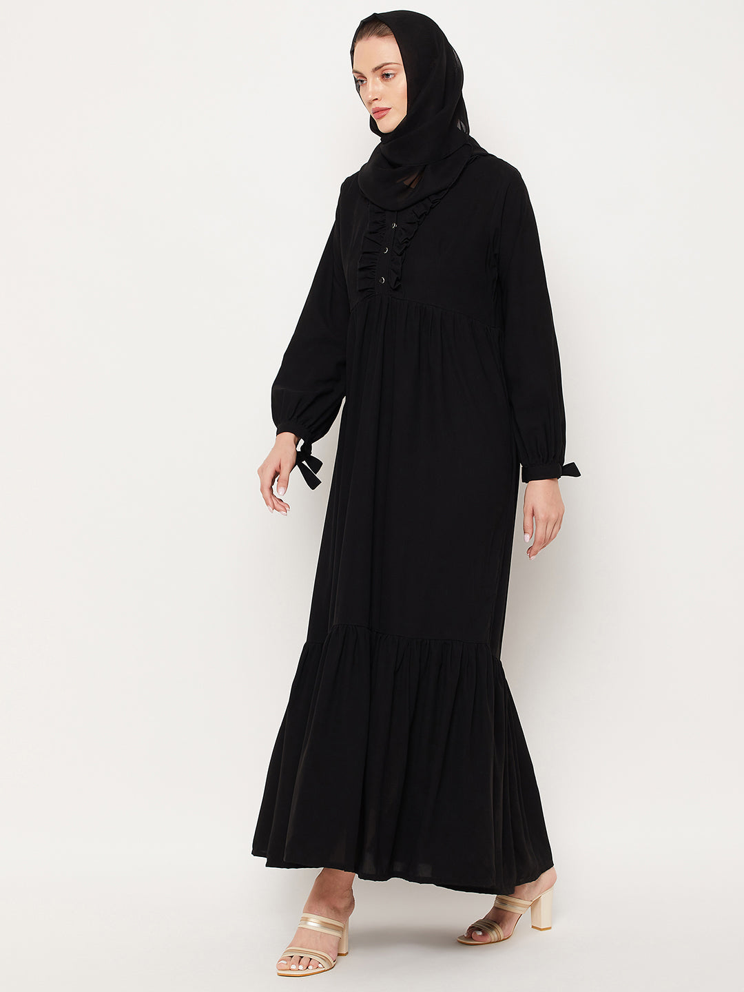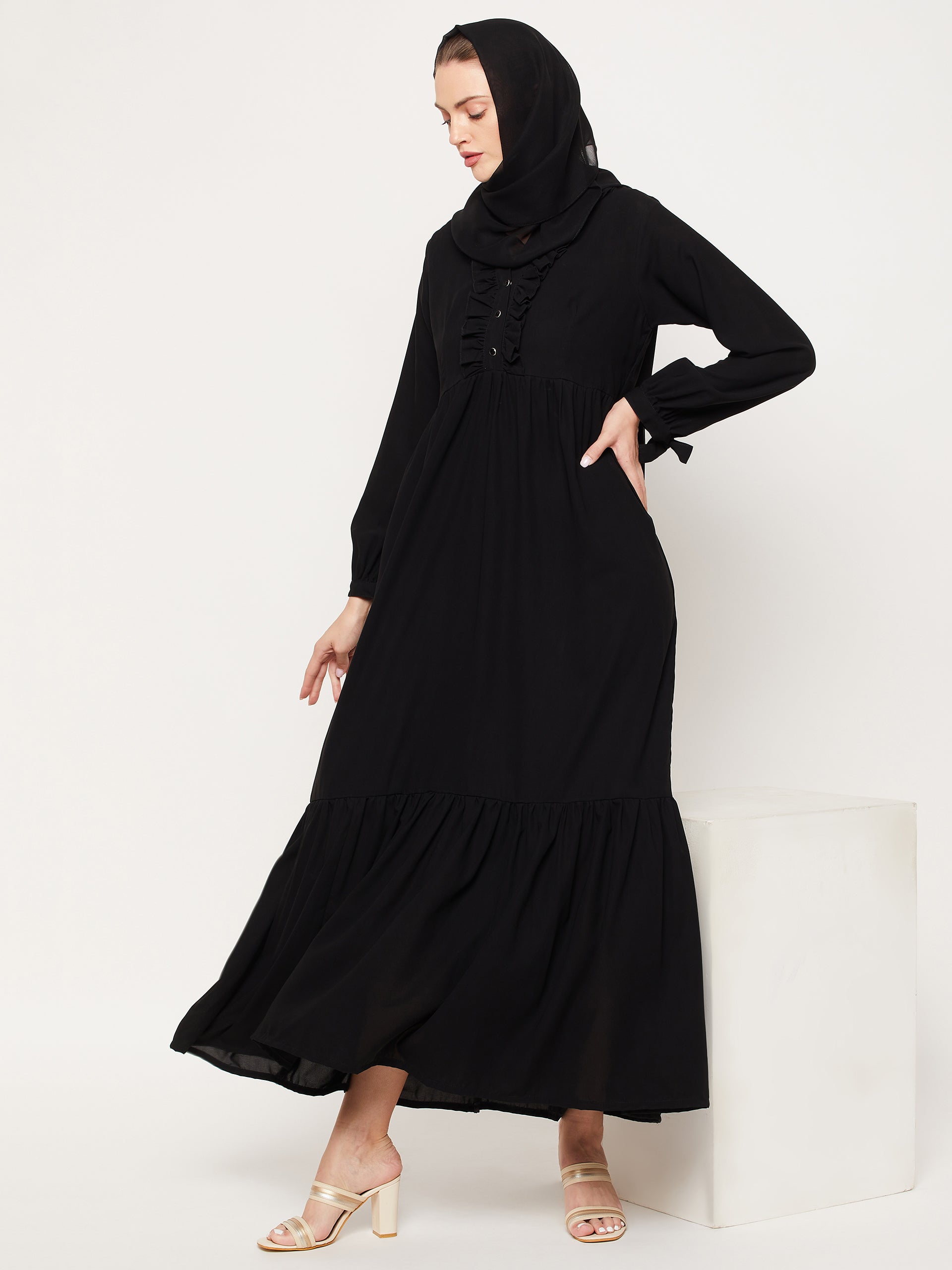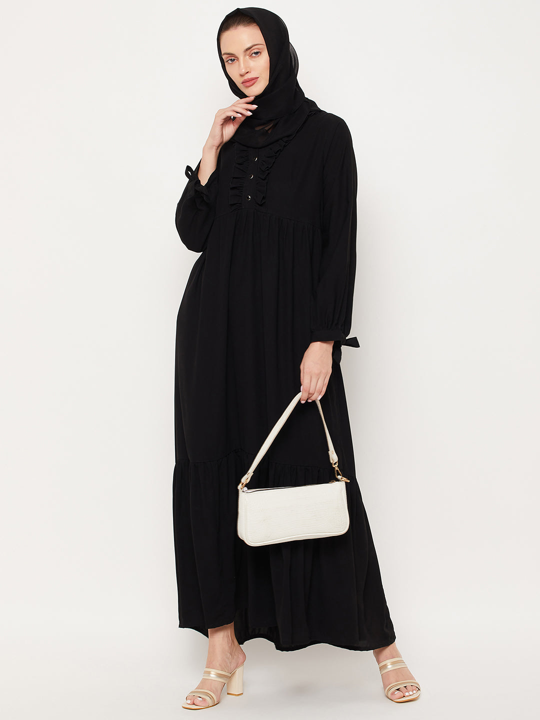 Nabia's Black Abaya Dress for women showcases a charming frill design with a ruffle detail on the neck. Adorned with buttons and tie-knot long sleeves, it combines elegance and modernity, offering a sophisticated and fashionable choice for contemporary Muslim women.