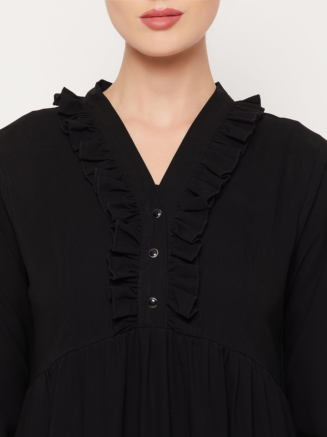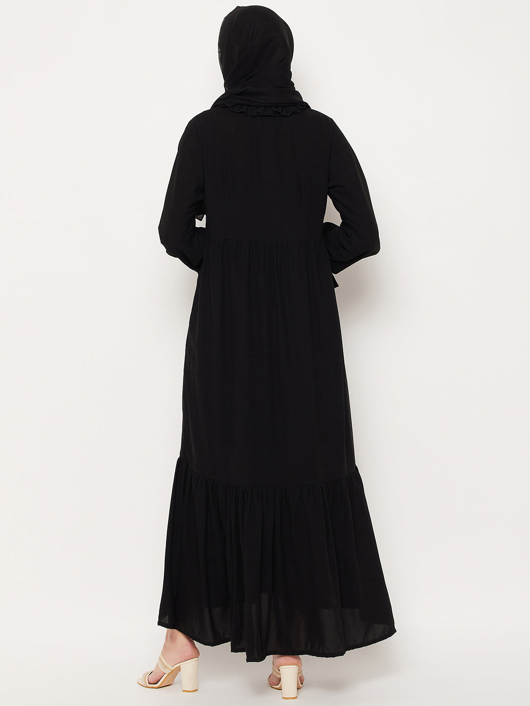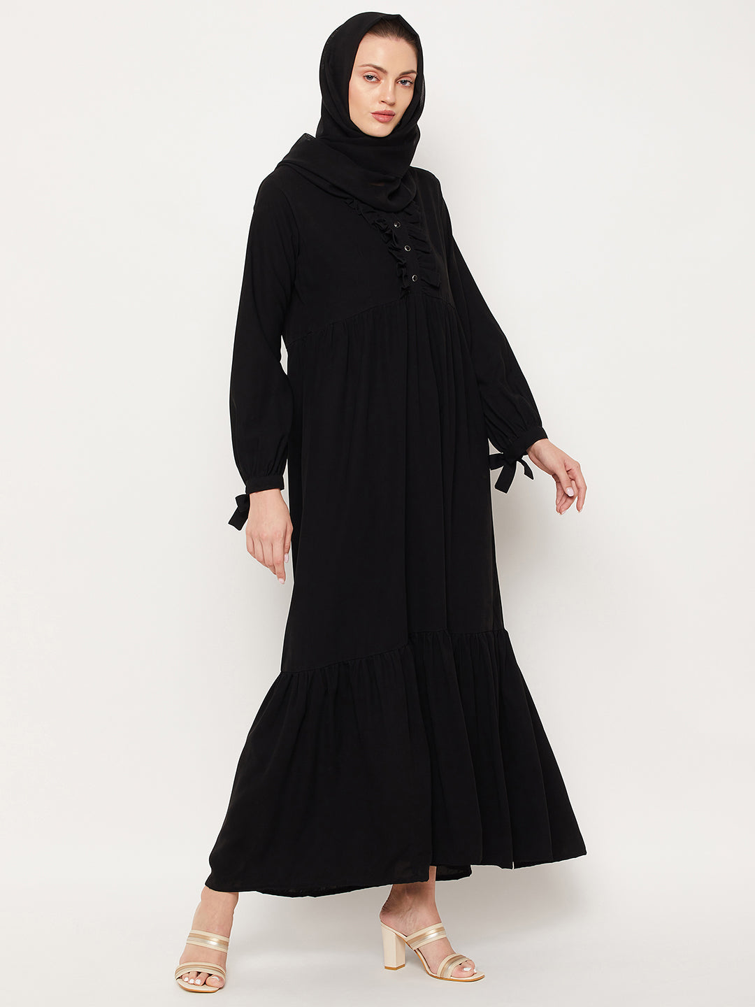 Nabia's Black Abaya Dress for women showcases a charming frill design with a ruffle detail on the neck. Adorned with buttons and tie-knot long sleeves, it combines elegance and modernity, offering a sophisticated and fashionable choice for contemporary Muslim women.