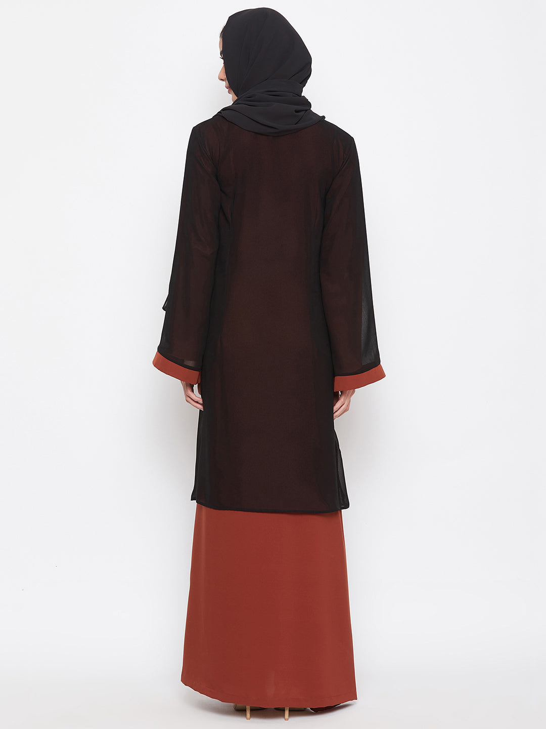 This trendy black and rust floral printed abaya is the perfect choice for a day out with friends. Crafted from two distinct fabrics, Nida matte for the inner garment and crepe for the outer shrug, it blends style with comfort seamlessly.