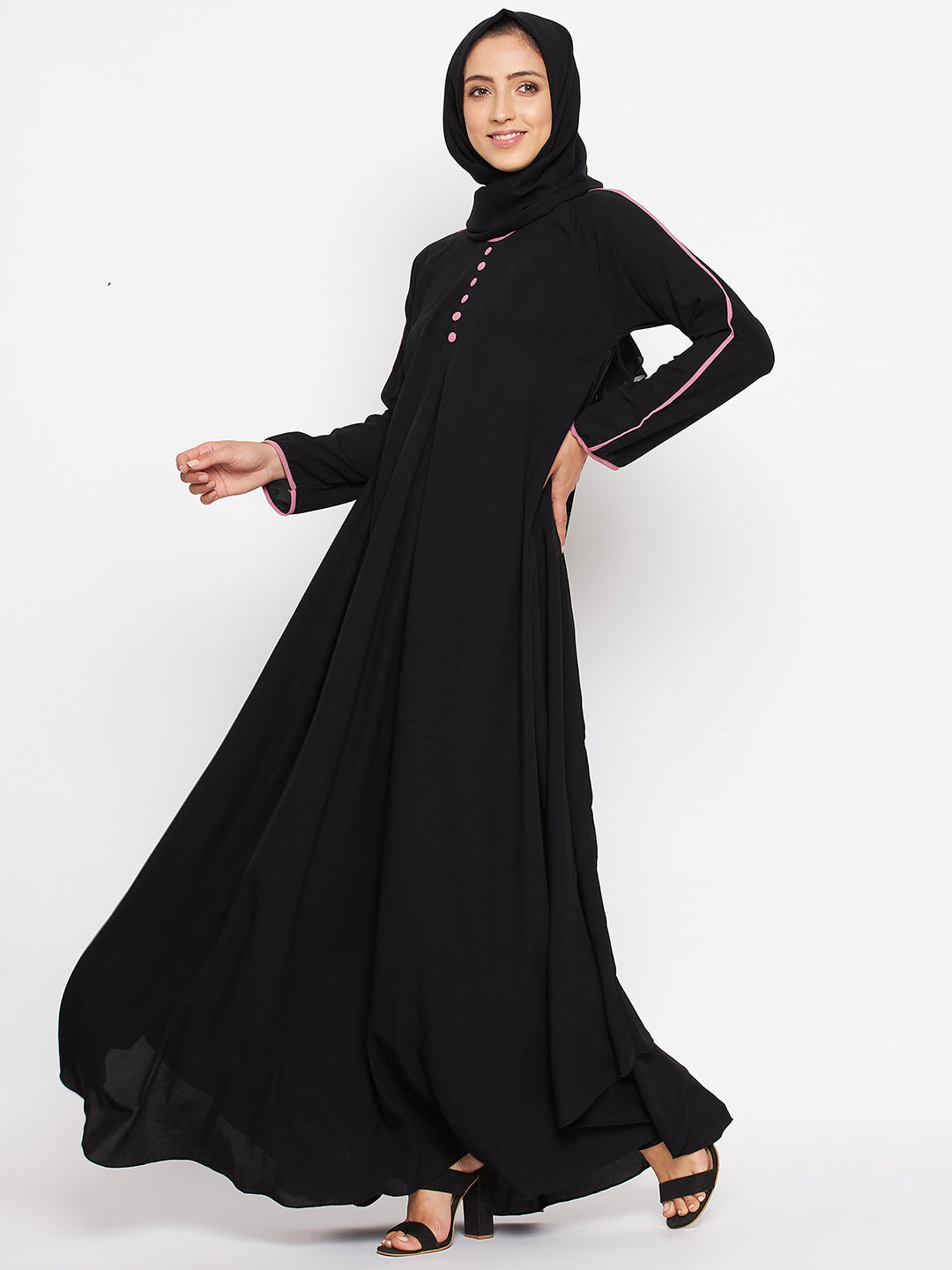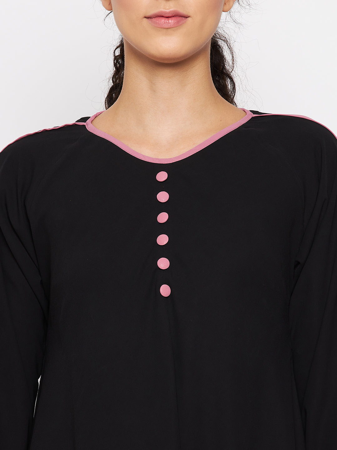 Discover the elegance of the Black Abaya by Nabia, available online. Crafted from high-quality Nida Matte fabric, this modest Islamic attire features contrast buttons on the front and a stylish contrast piping design on the sleeves