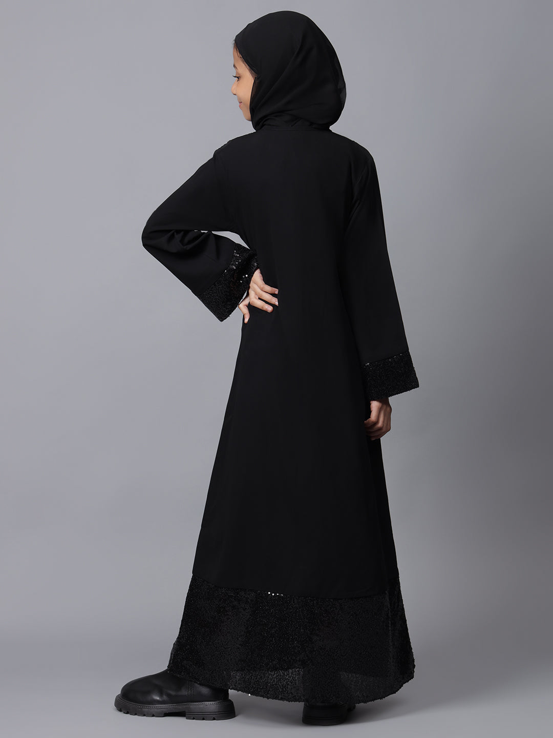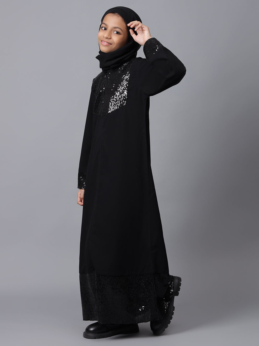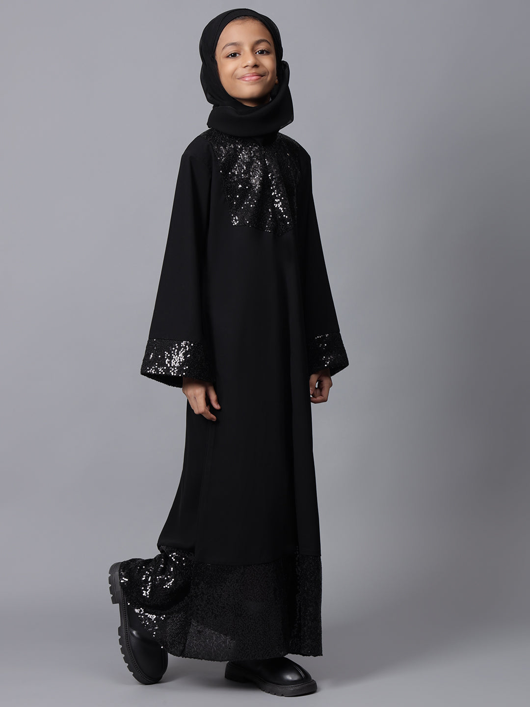 This black solid Abaya for Muslim girls features elegant sequin detailing, adding a touch of sparkle to its modest design. Combining the latest fashion trends with timeless modesty, it offers a stylish look perfect for any occasion. The sequin accents enhance its modern appeal while maintaining a comfortable and elegant fit.