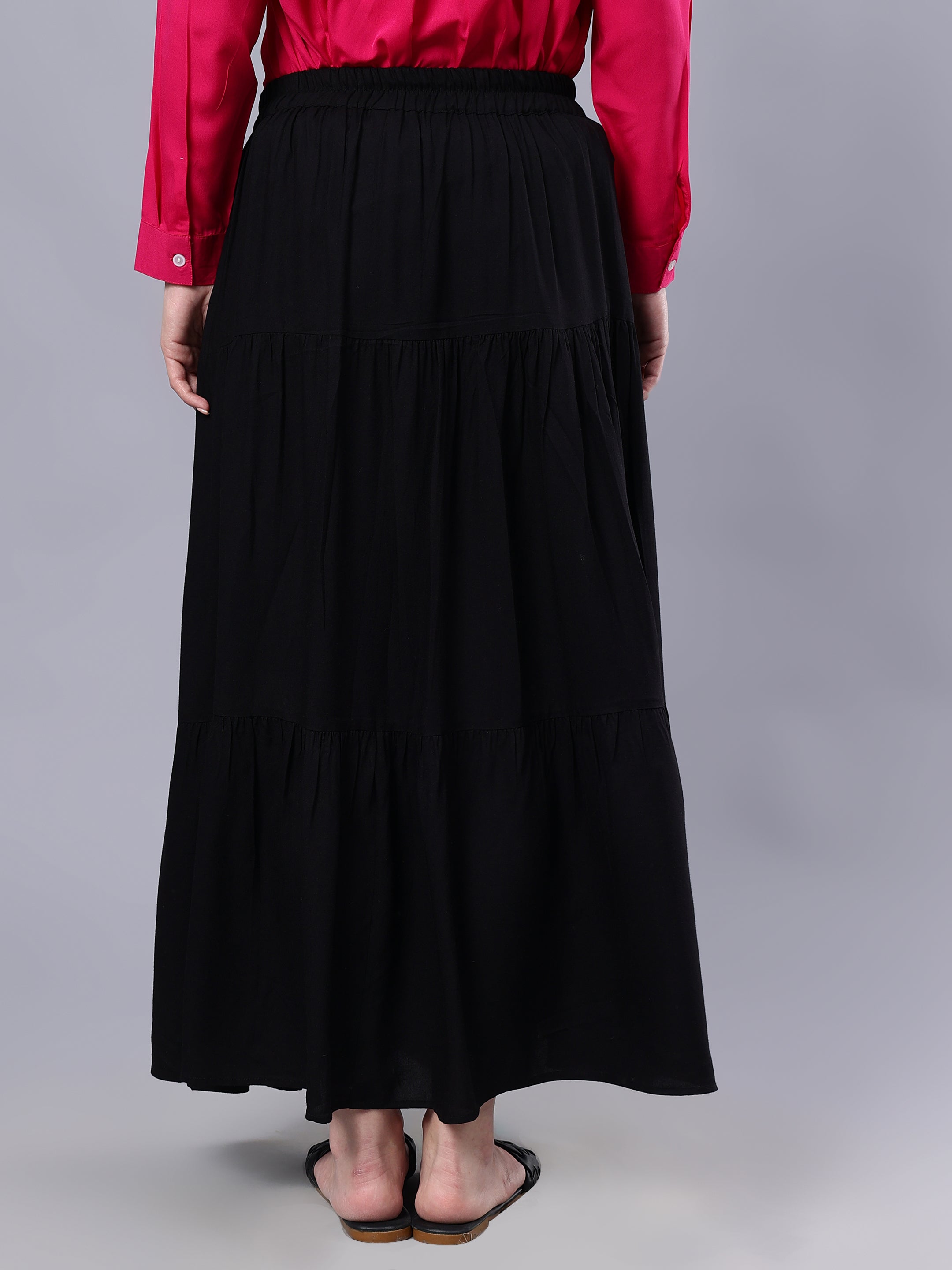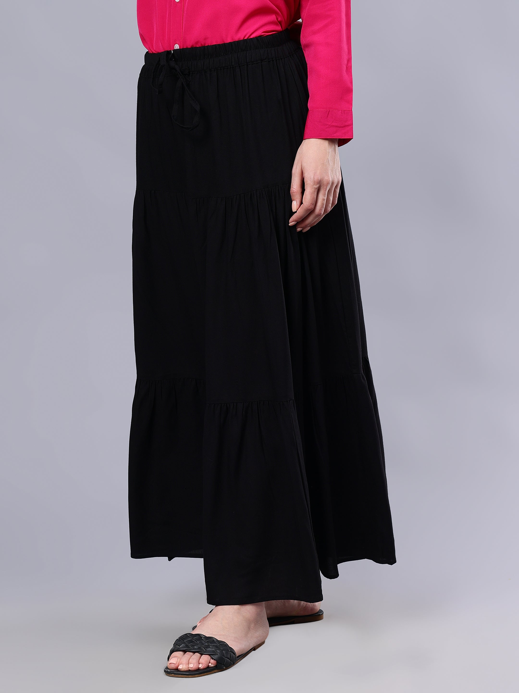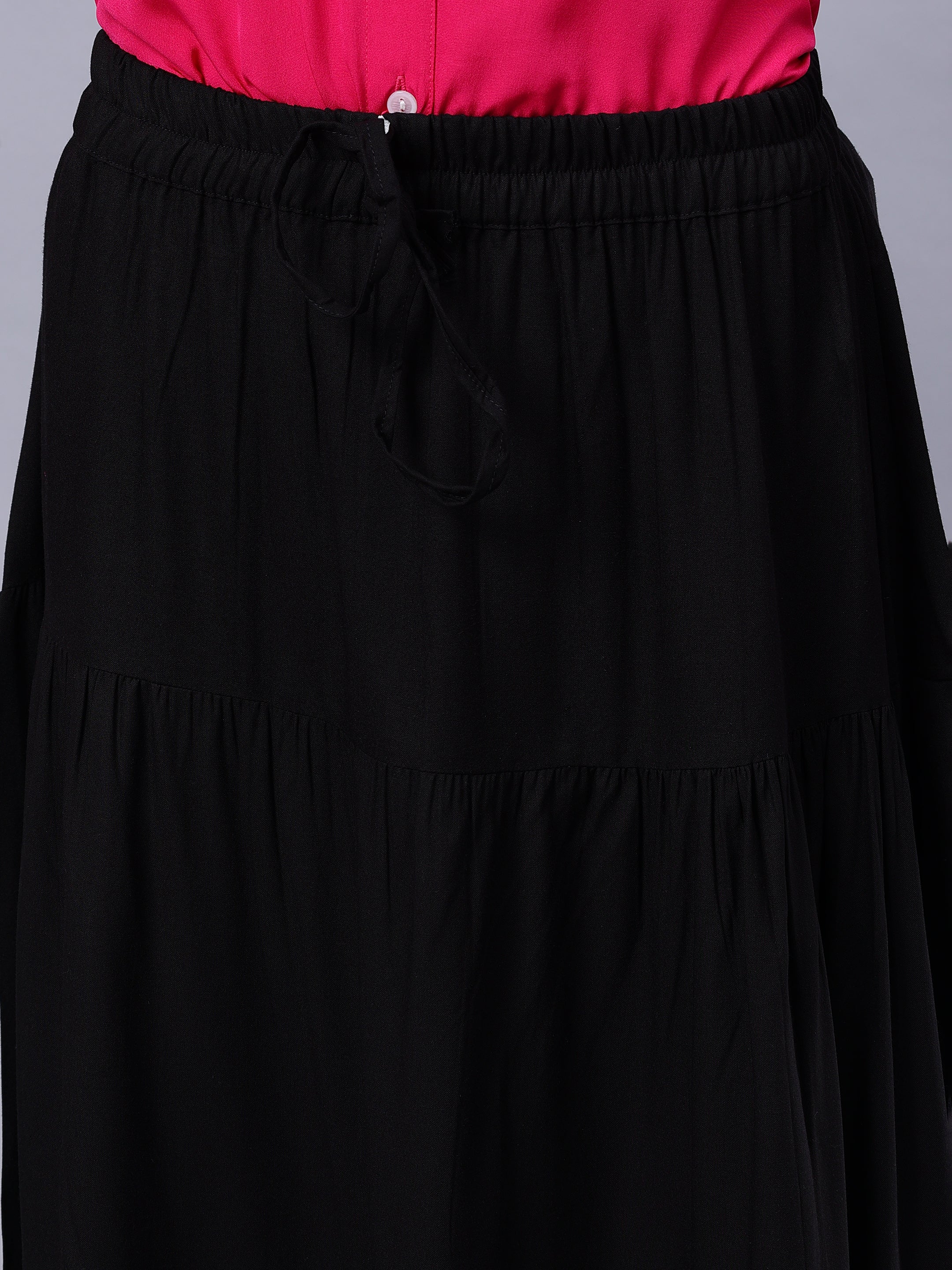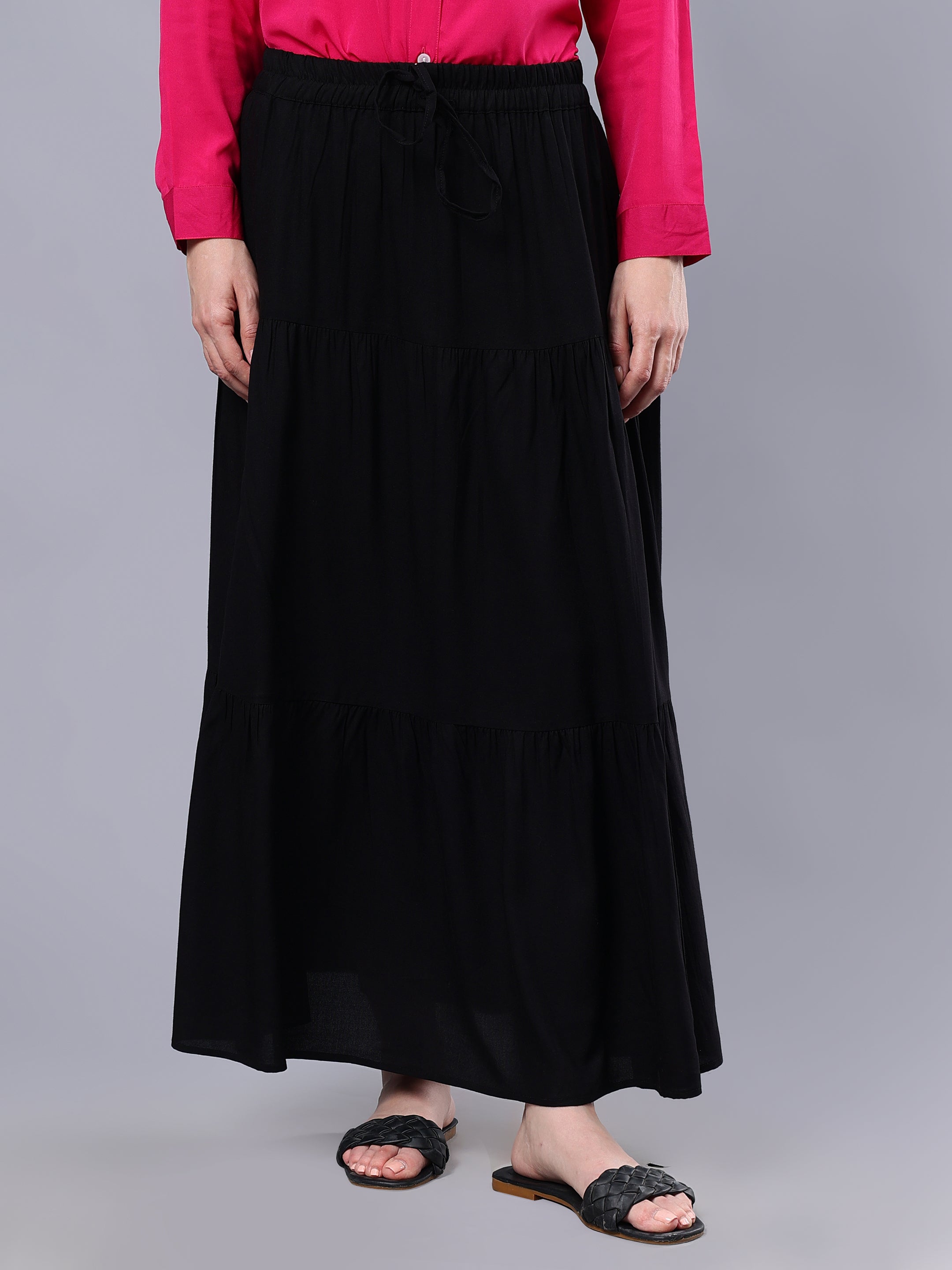 Elevate your wardrobe with our Nabia skirt in solid black. Crafted from comfortable rayon fabric, its drawstring closure ensures ease. Pair effortlessly with chic hijabs, tunics, shades, and favorite shoes for a glamorous, versatile ensemble that exudes timeless sophistication.