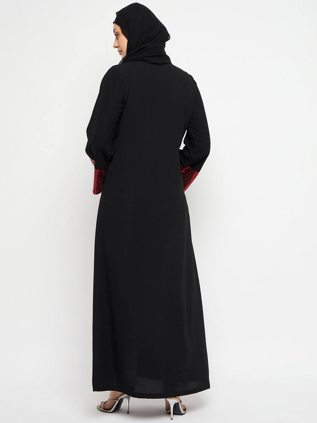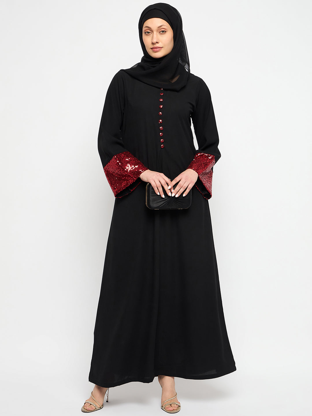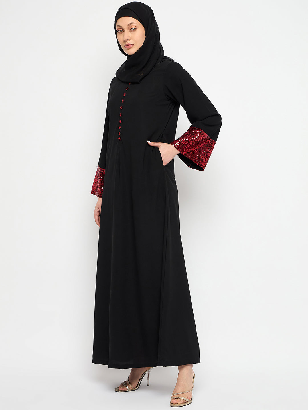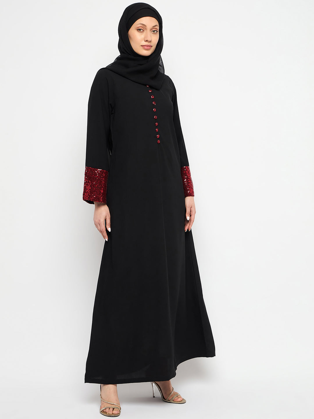 Elevate your style with the black Abaya, adorned with intricate embroidery. Crafted from breathable Nida matte fabric, featuring slip-on closure, free sleeves, front button design only (not funtioning) a round neck, and a solid pattern, this abaya embodies modesty, comfort, and cultural grace for Islamic women.