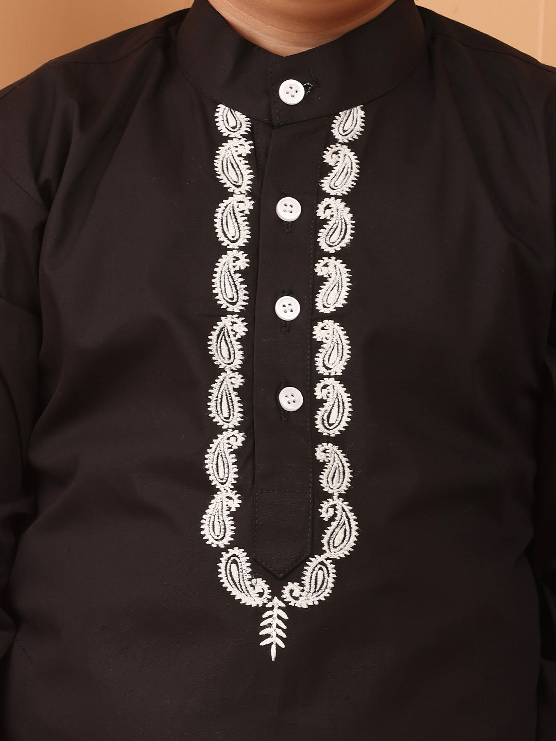 This boy’s black embroidered kurta and white pajama set brings together elegance and comfort in a stylish design. Crafted from soft cotton, the kurta features a refined round neck, four front buttons, and functional side pockets, adding convenience to its simplicity. Paired with an elasticated slip-on pajama, this outfit is perfect for both formal and relaxed occasions.