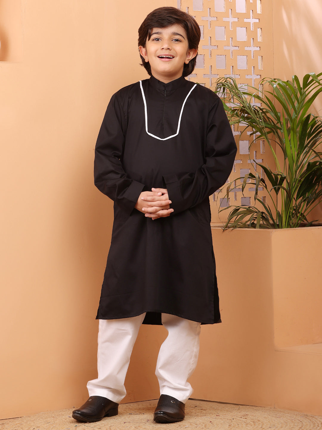 This boys' black solid kurta set with white piping exudes elegance and comfort. Made from soft cotton, the kurta showcases a mandarin collar, zip closure, and functional side pockets for added convenience. Paired with an elasticated, slip-on white pajama, this outfit is ideal for both formal and casual occasions, delivering a modest yet stylish appearance.