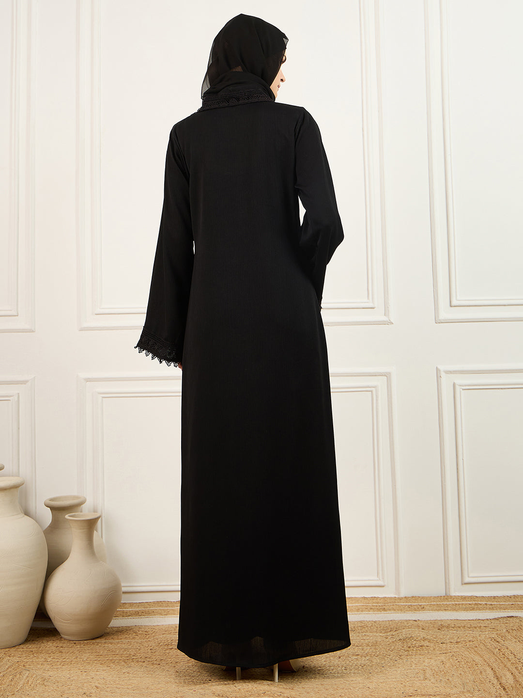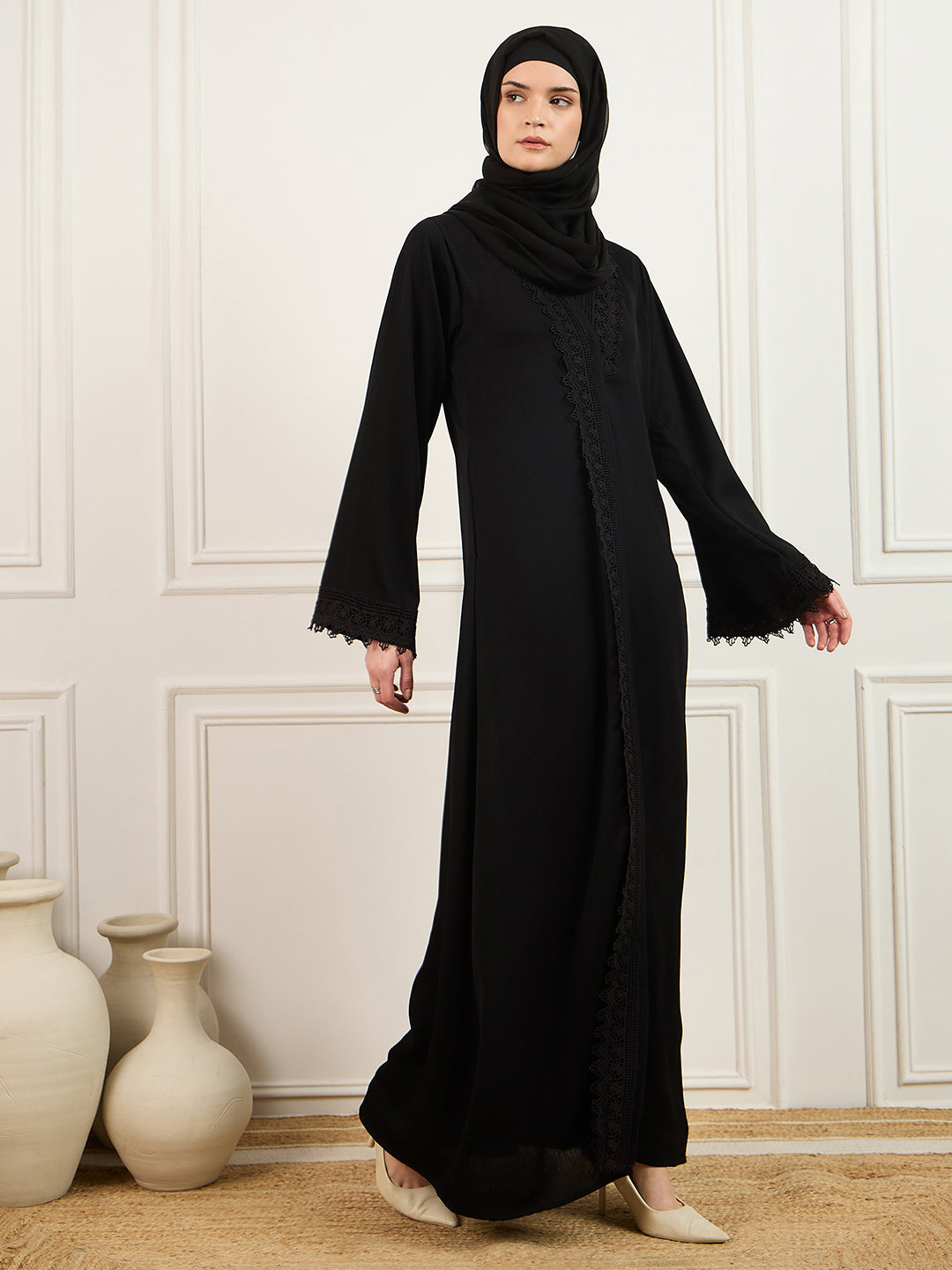 This black lace abaya burqa adds a touch of elegance to everyday modest wear. Crafted from soft Zoom fabric, it features a solid design with a graceful V-neck, stylish bell sleeves, and an easy slip-on closure. Delicate lace accents enhance its charm and femininity. Perfect for Islamic and Muslim women, this abaya blends comfort with timeless style—making it an ideal choice for both casual wear and special occasions.