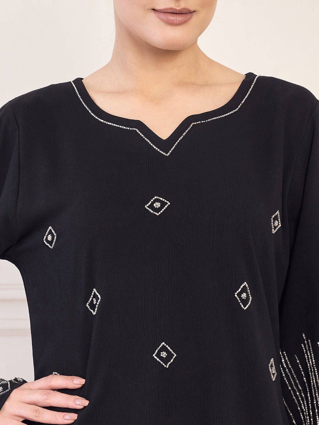 This black solid luxury abaya burqa from the latest collection exudes elegance and modesty for Islamic women. Made from premium CY-Crush fabric, it boasts intricate handwork detailing for a refined touch. Designed with a relaxed fit for ultimate comfort, it features a stylish slip-on closure for easy wear. Perfect for both special occasions and everyday outings, this abaya combines sophistication with contemporary modest fashion. A timeless, versatile addition to any wardrobe, it’s ideal for those seeking refined, modern style.