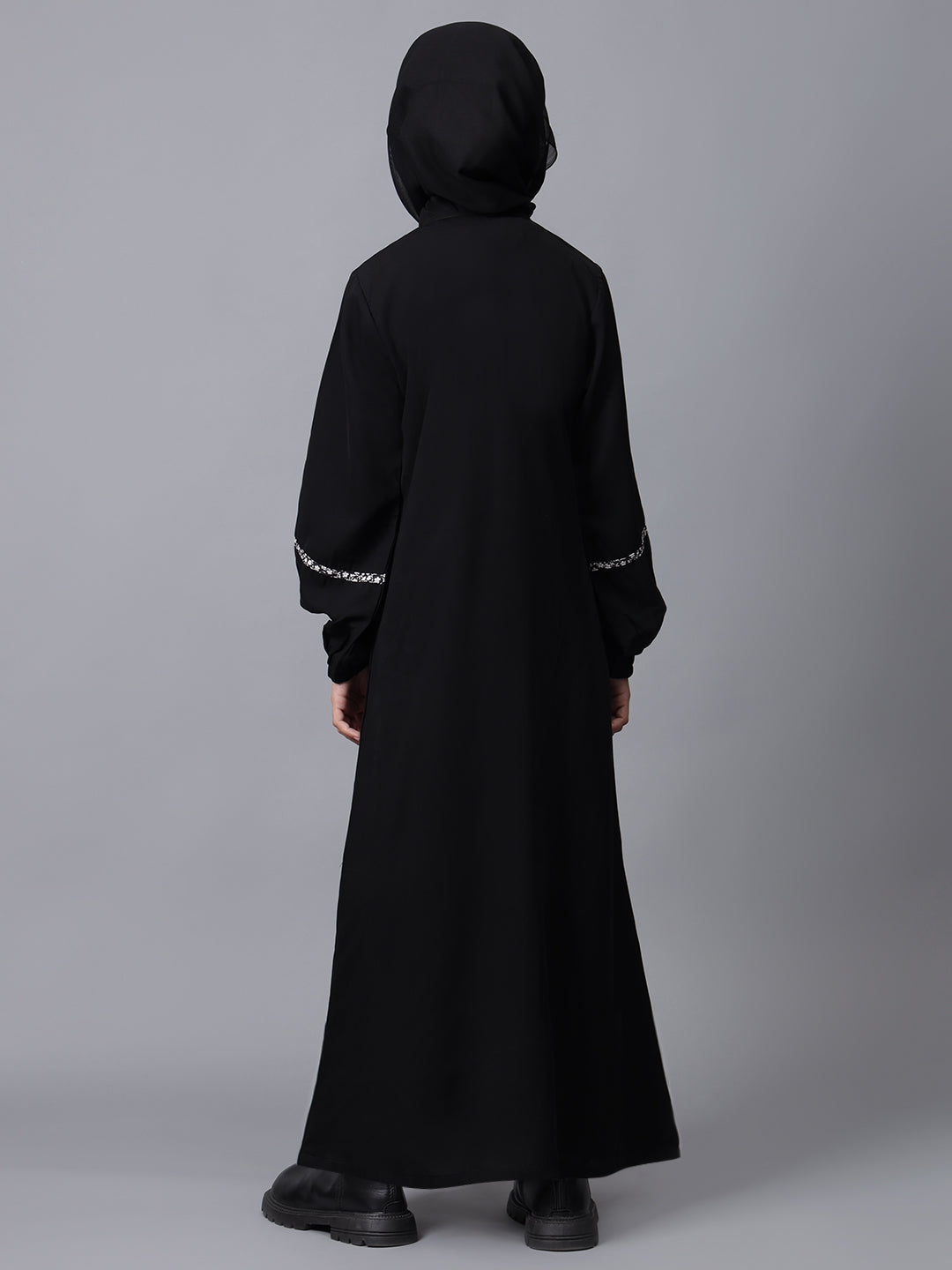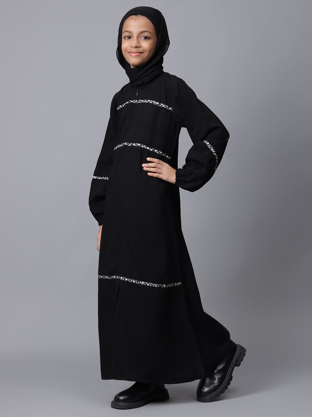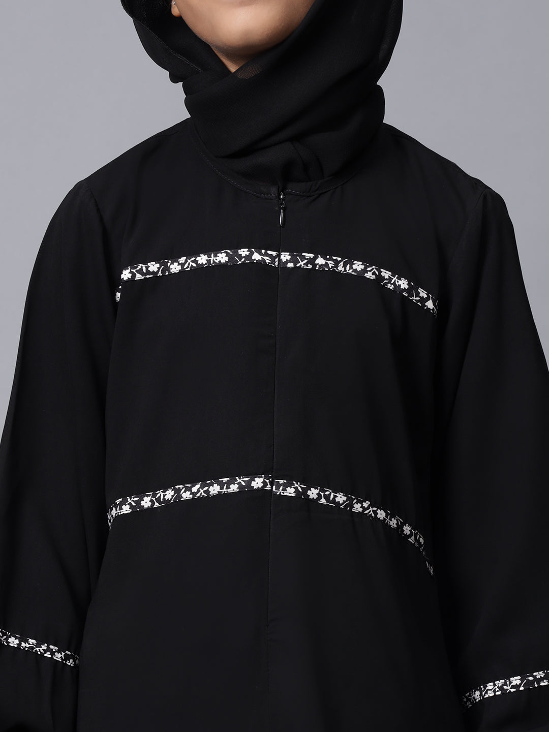 This black solid Abaya for Muslim girls features a half front opening with a convenient zip closure. Designed for modesty and comfort, it offers a sleek and modern look. The latest design ensures ease of wear while maintaining a stylish appearance, making it perfect for everyday modest fashion.