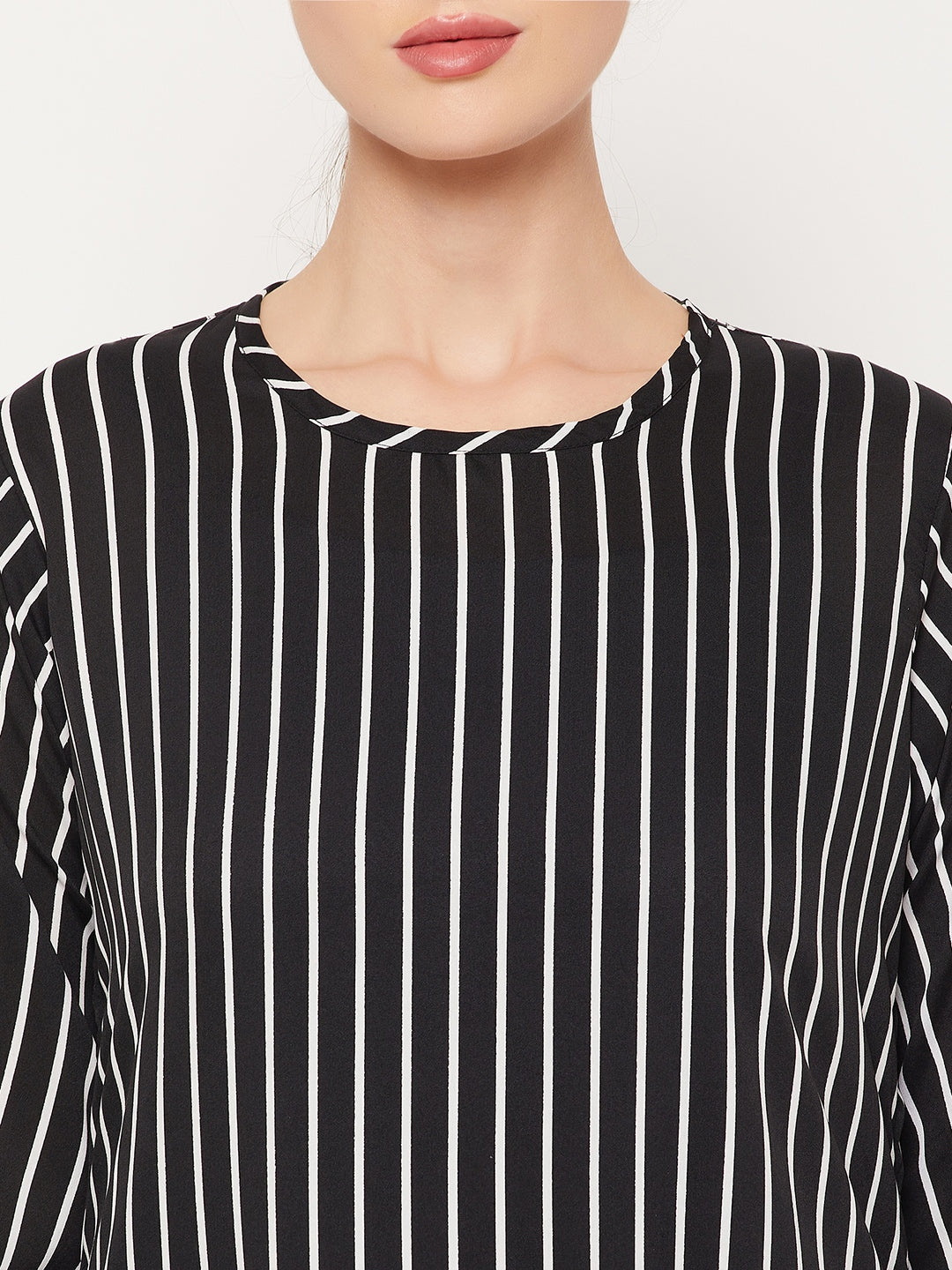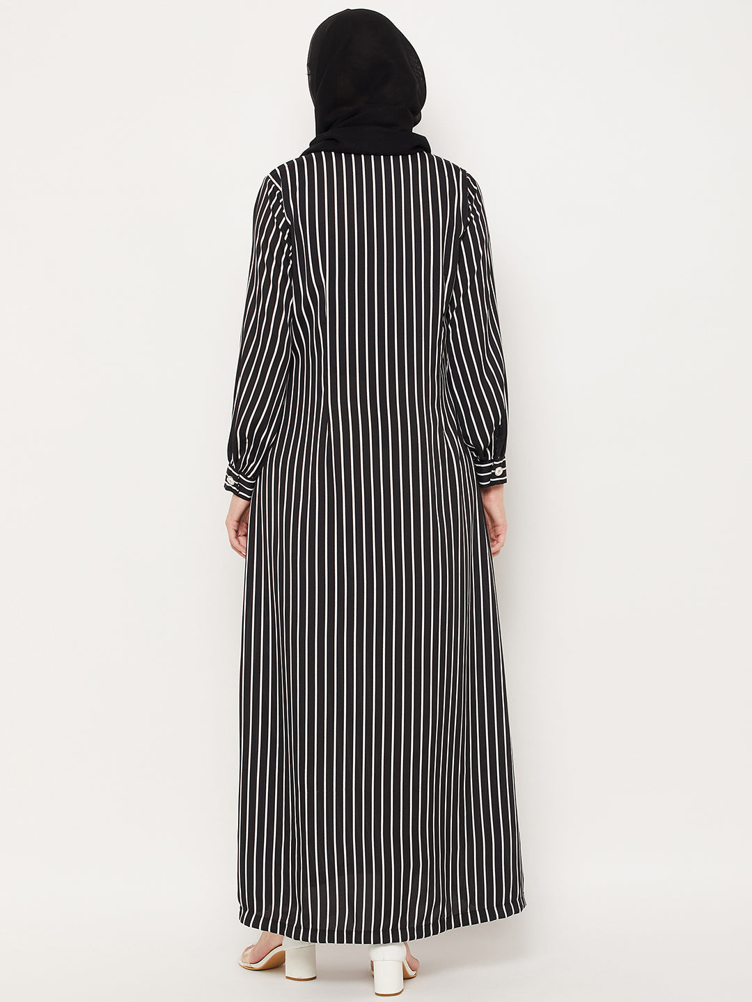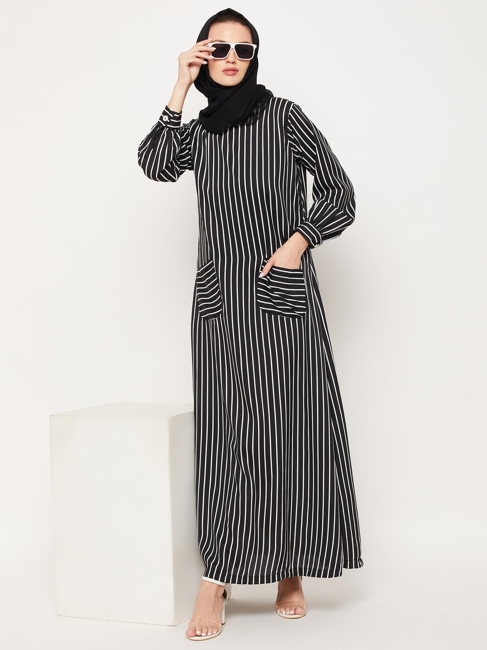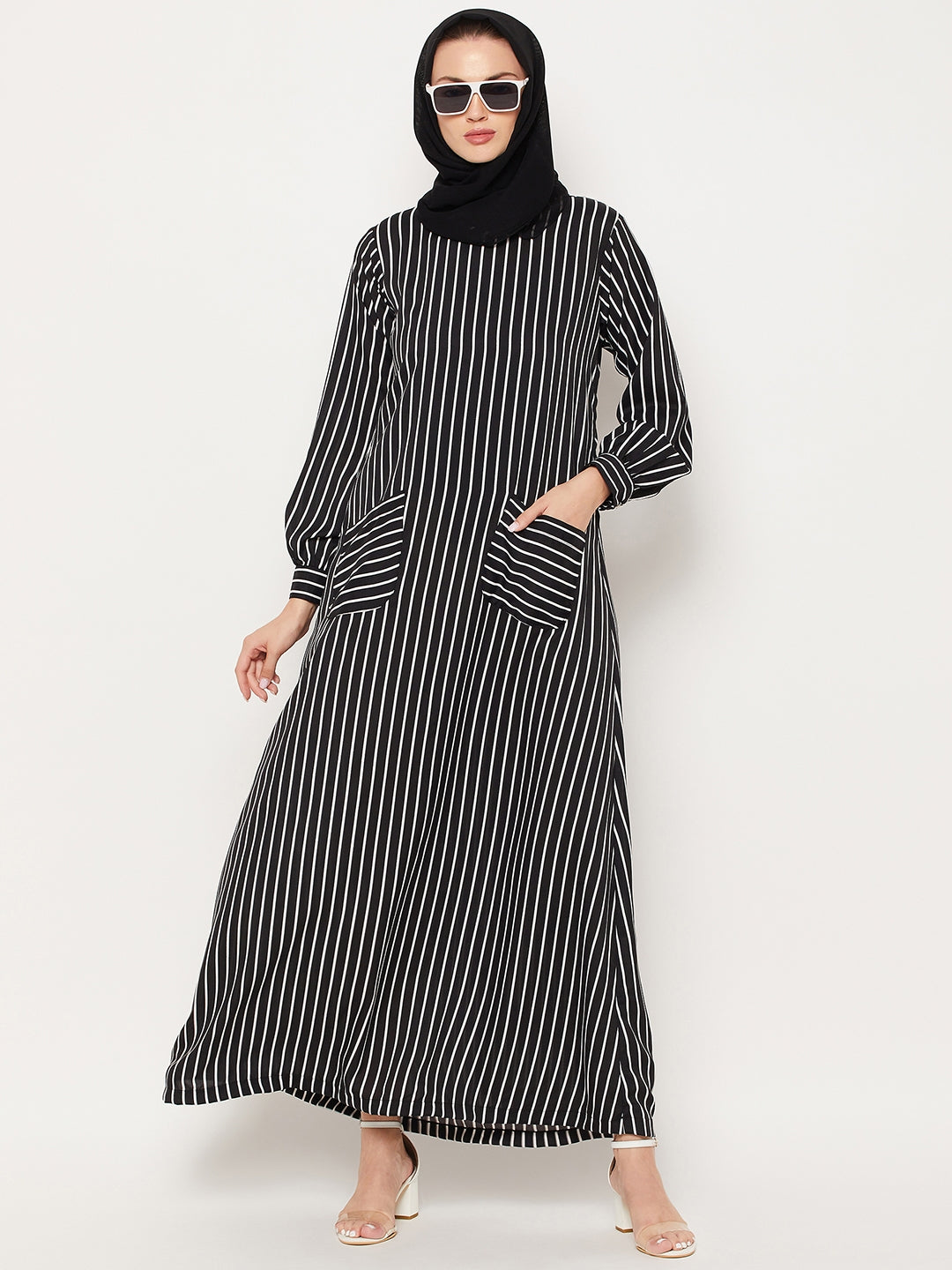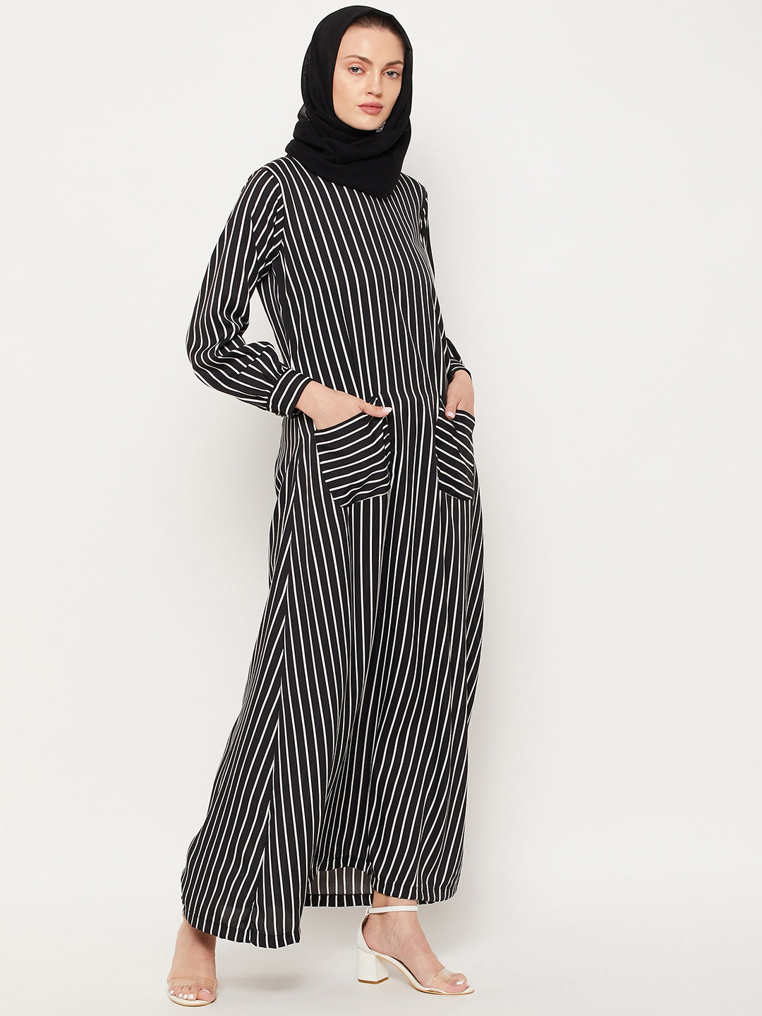 Elevate your modest style with the Black Stripe Abaya by Nabia, featuring a front-open design with a button closure. Made from high-quality Crepe Fabric, this Islamic attire is tailored for Muslim women who value both faith and fashion. It also offers practicality with two convenient patch pockets for carrying essentials.