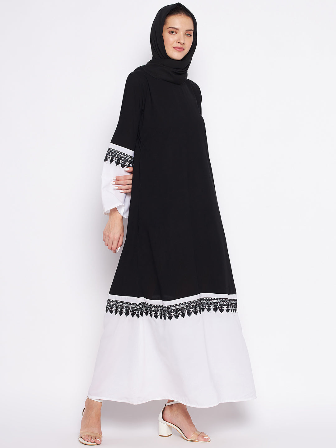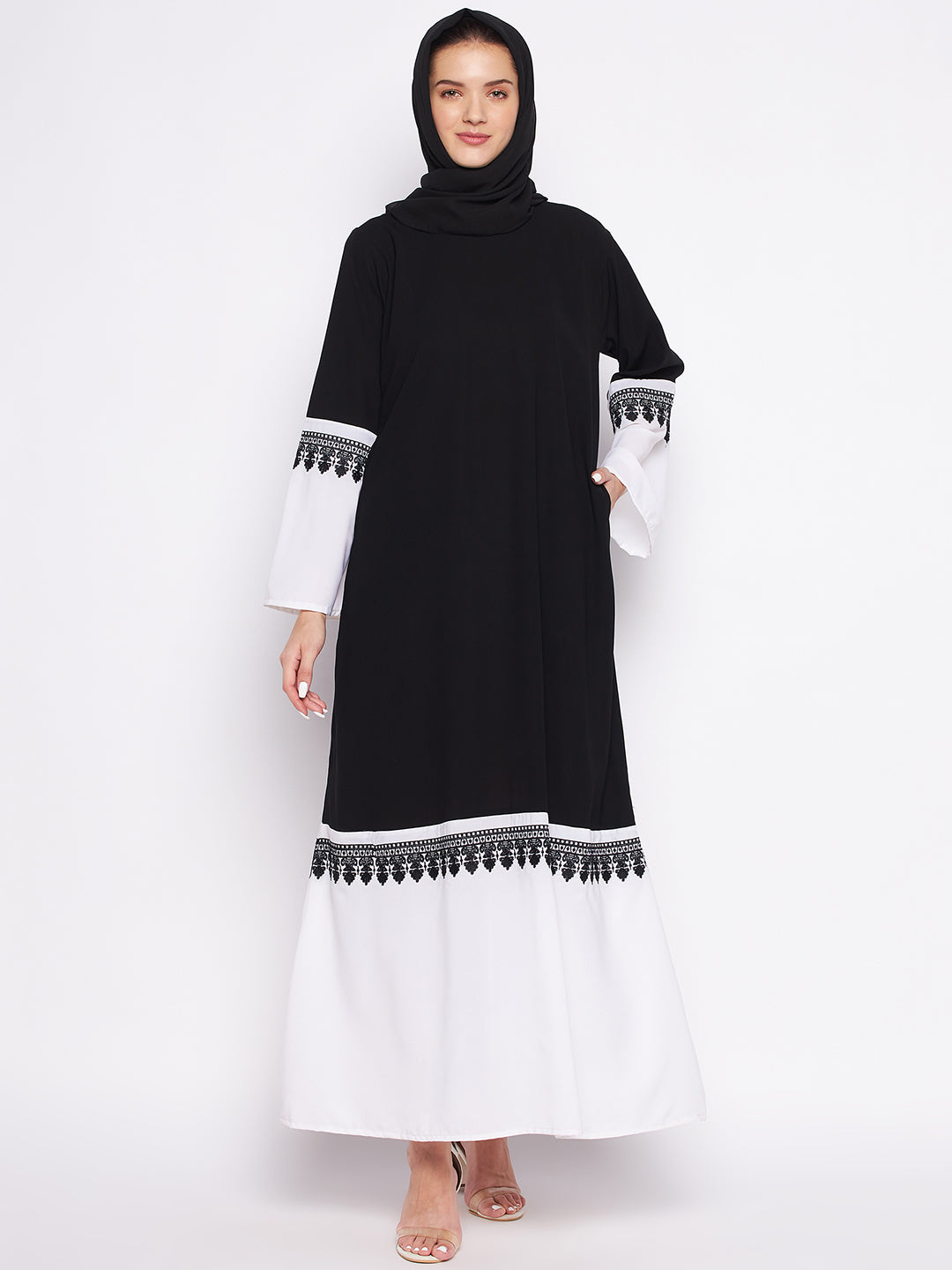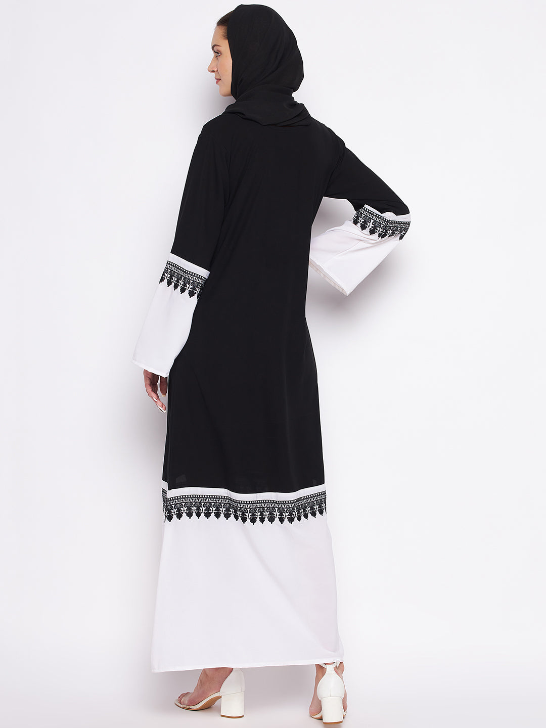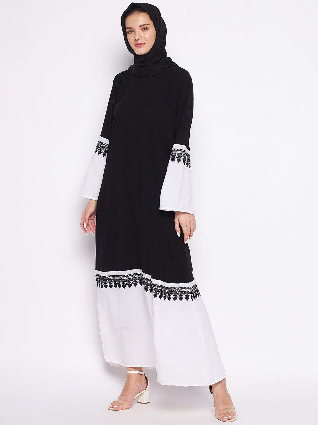 Nabia's Black and White Embroidery Abaya offers a modest and stylish option for Muslim women. Made from high-quality Nida Matte Fabric, it features intricate embroidery on the sleeves and bottom, enhancing the design's elegance.