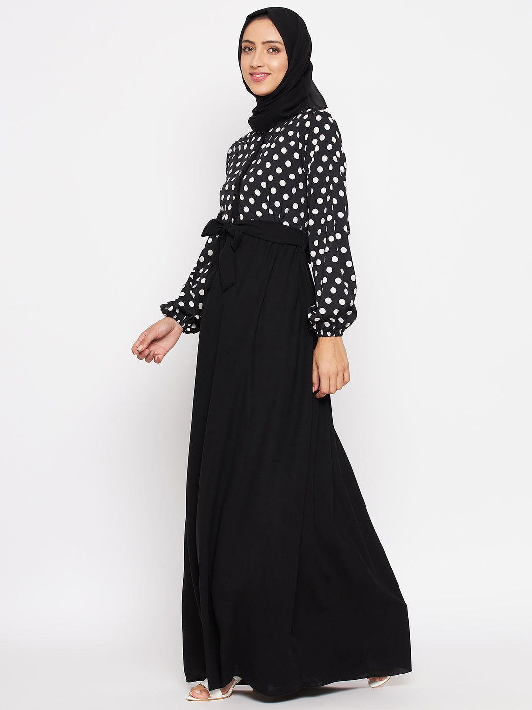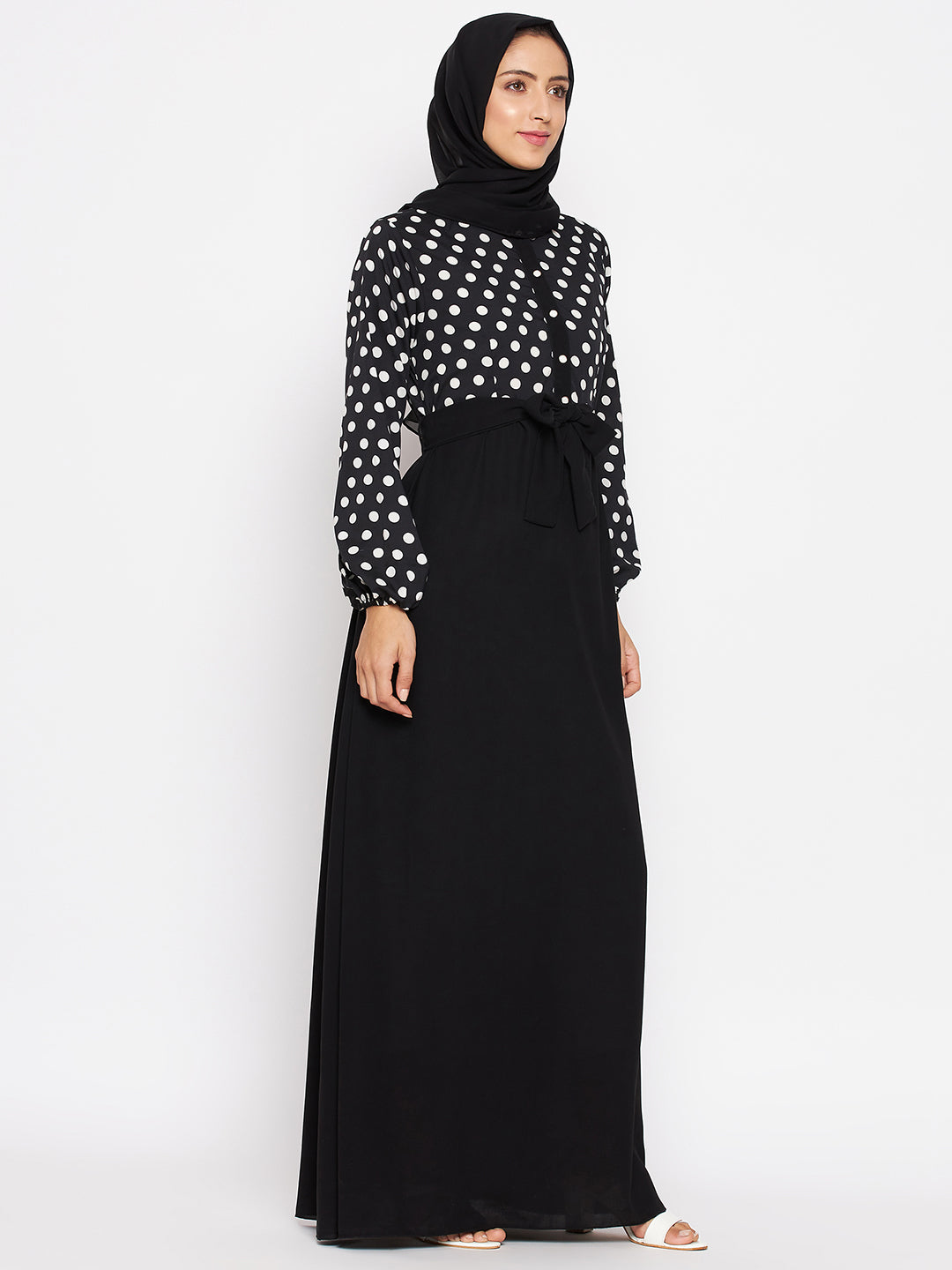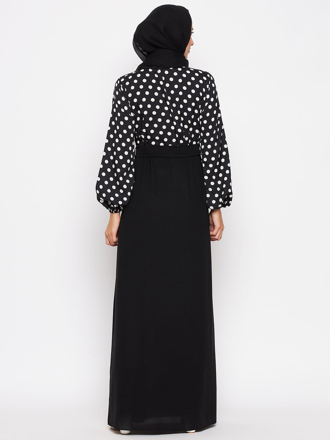 Nabia's Abaya Dress for women is a fusion of style and comfort in Nida Matte and crepe fabric. The button closure on the neck, long & cuffed sleeves, and a belt for adjustment add a touch of elegance. This dress is perfect for modern Muslim women seeking both fashion and modesty.