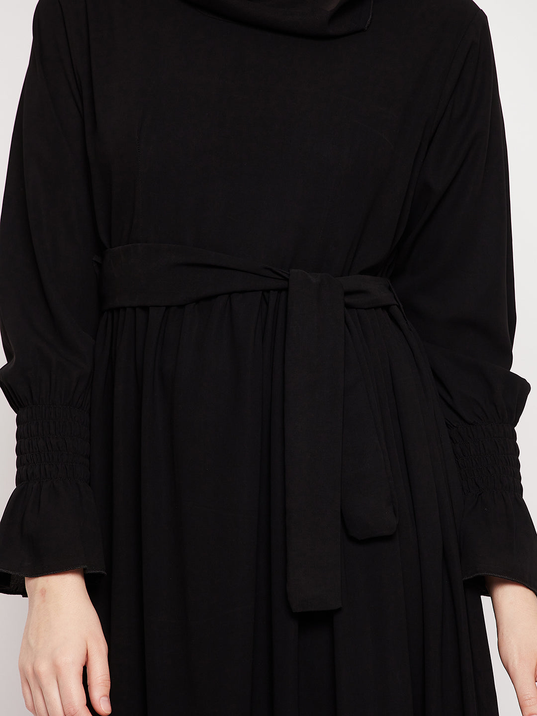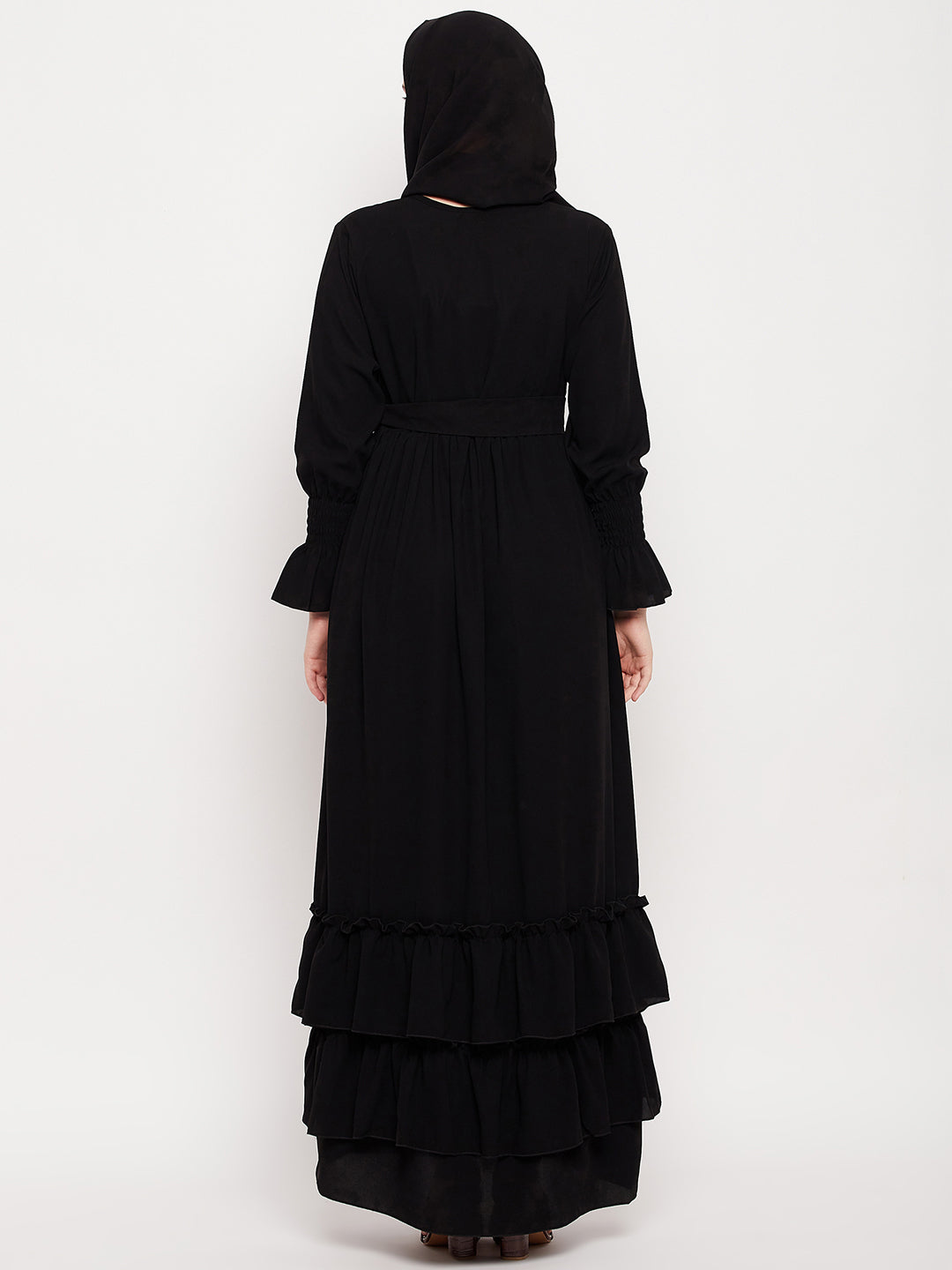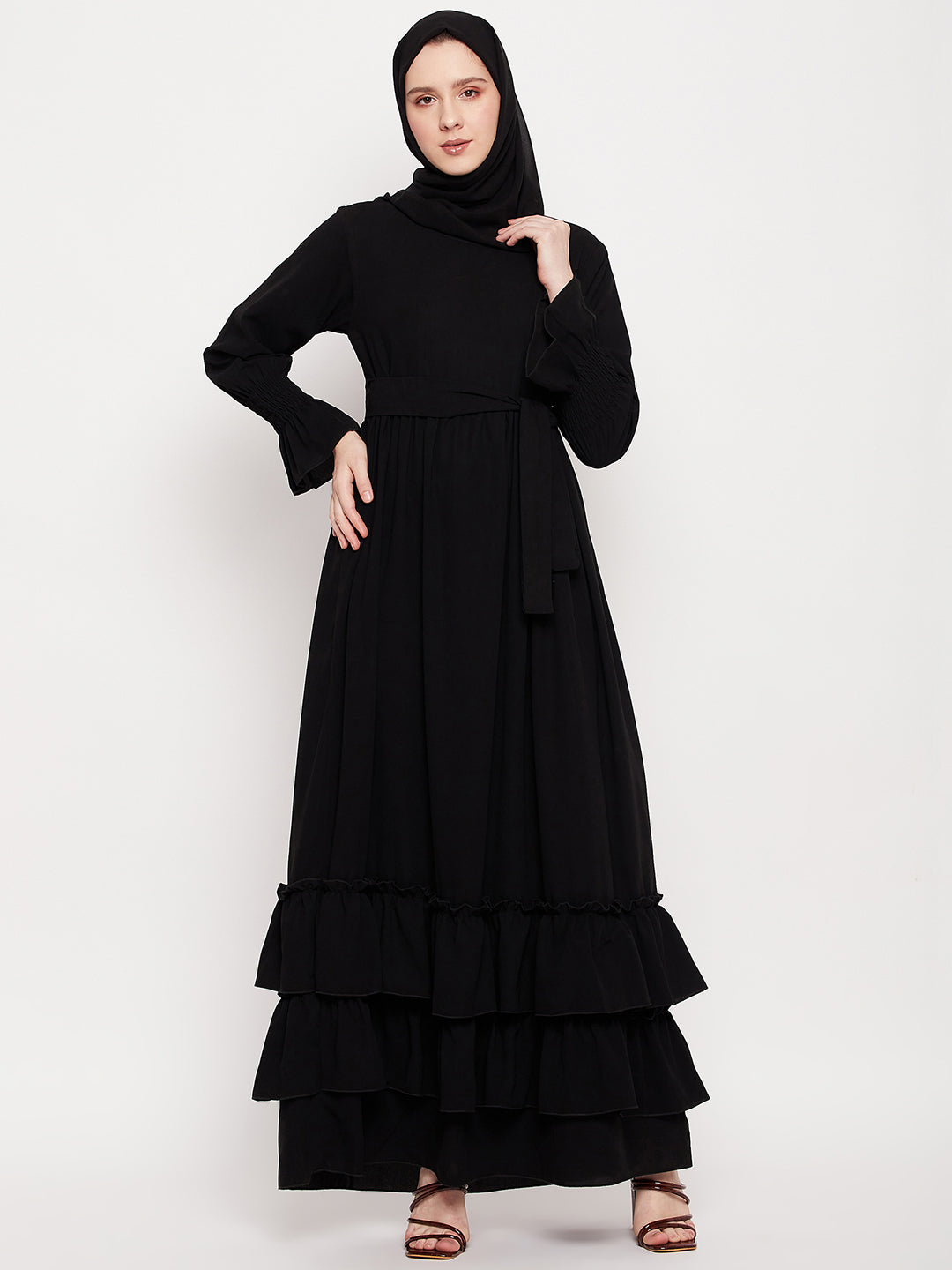 This Black Abaya has full length, with three flowing frills leveled over each other to give you a feel of exquisite dressing and beautiful personality. It has been made in ‘Nida Matte Finish’ fabric, long bell sleeves which have elastic adjustments to allow you to make them as you feel for. This Abaya has a waist belt so that you can adjust the breadth as and when you like in accordance with the place and weather. This adjusting belt would provide you with free movement and a sense of dressing to good fit.