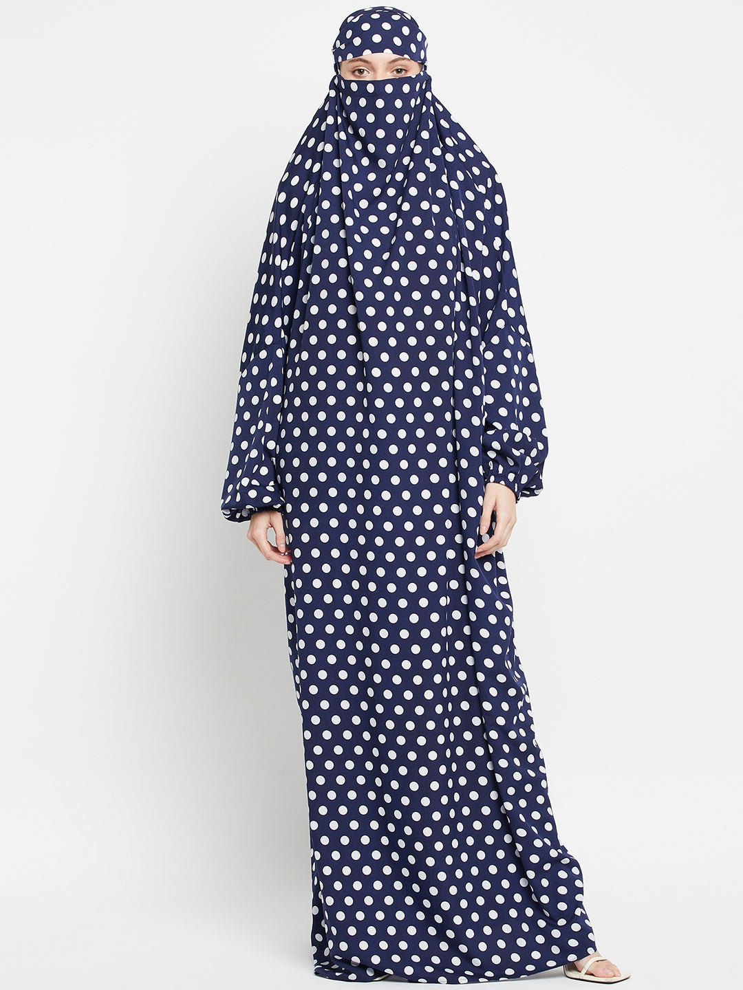The Nabia Jilbab Abaya is a modest Islamic attire that offers full-length coverage with full sleeves. Crafted from high-quality polyester fabric , it blends modesty with style. Ideal for Muslim women seeking elegant modest wear, this blue and white polk printed Abaya provides both comfort and a fashionable look, allowing for a modestly chic appearance in line with Islamic traditions.