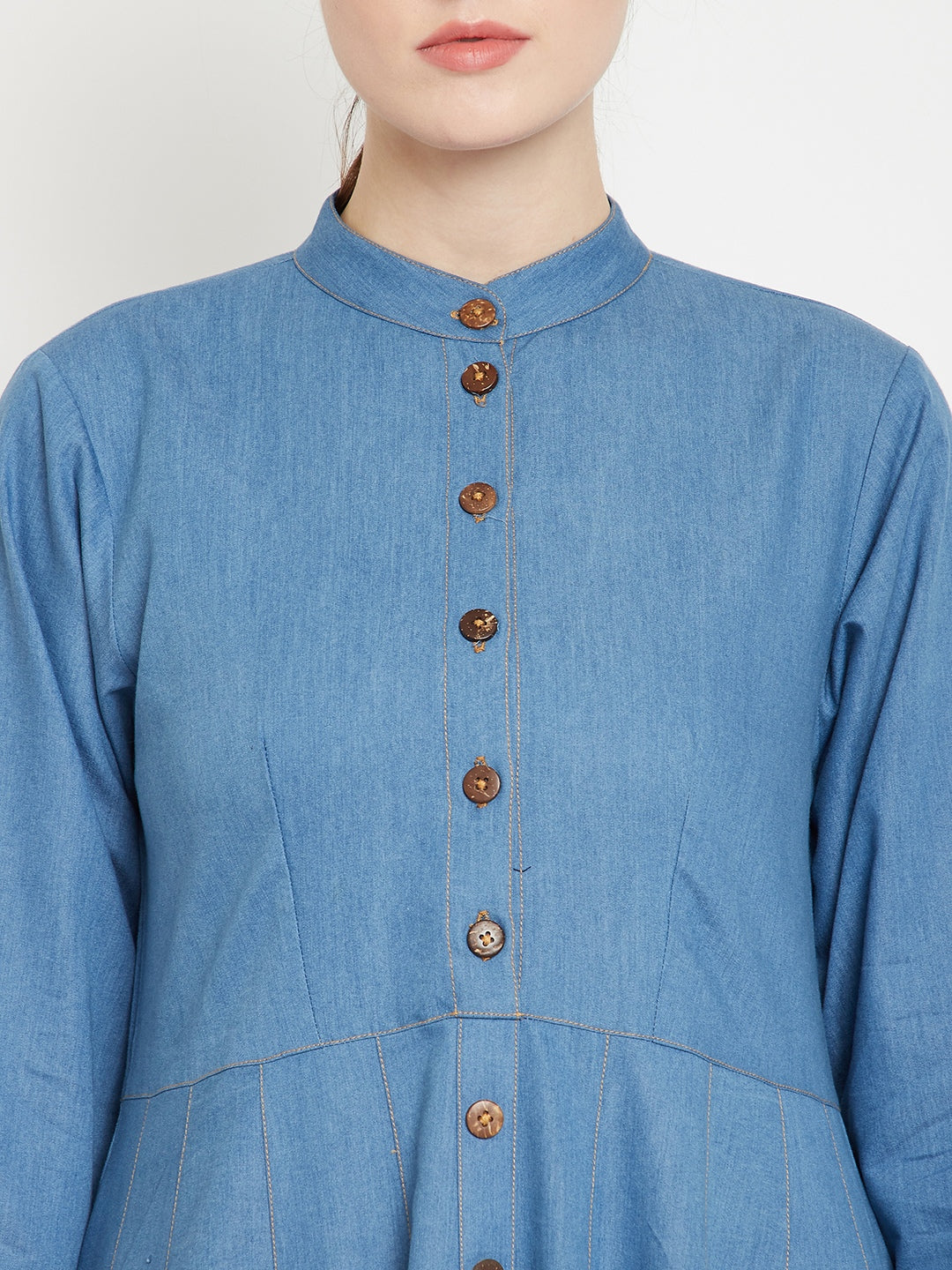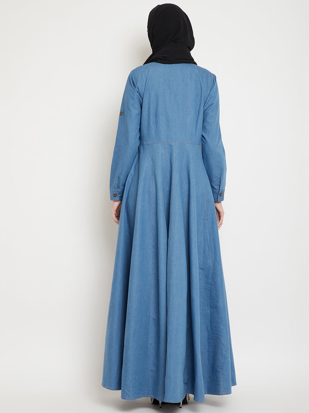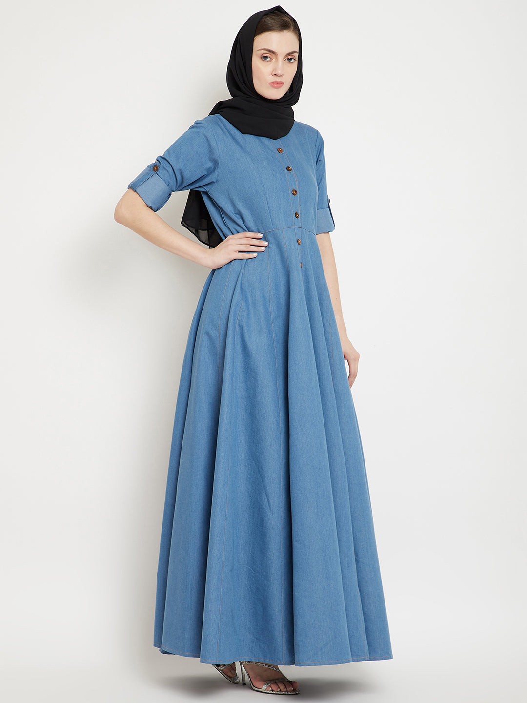 Elevate your modest style with the Blue Denim Cotton Abaya by Nabia, conveniently available online. This Islamic attire boasts an elegant umbrella cut design, offering Muslim women the perfect blend of faith and fashion. It's a graceful choice for those seeking both modesty and contemporary flair.