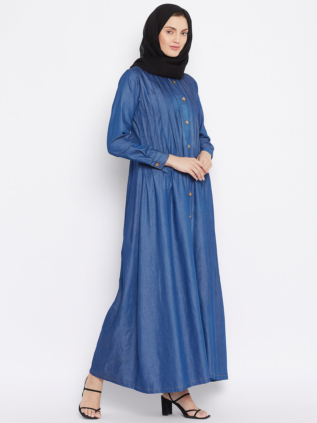 Nabia's Abaya for women is tailored from solid denim cotton fabric, featuring a front-open design adorned with a plate design on the front. Long & cuffed sleeves and a mandarin collar add an elegant touch, creating a perfect blend of modesty and contemporary style for modern Muslim women