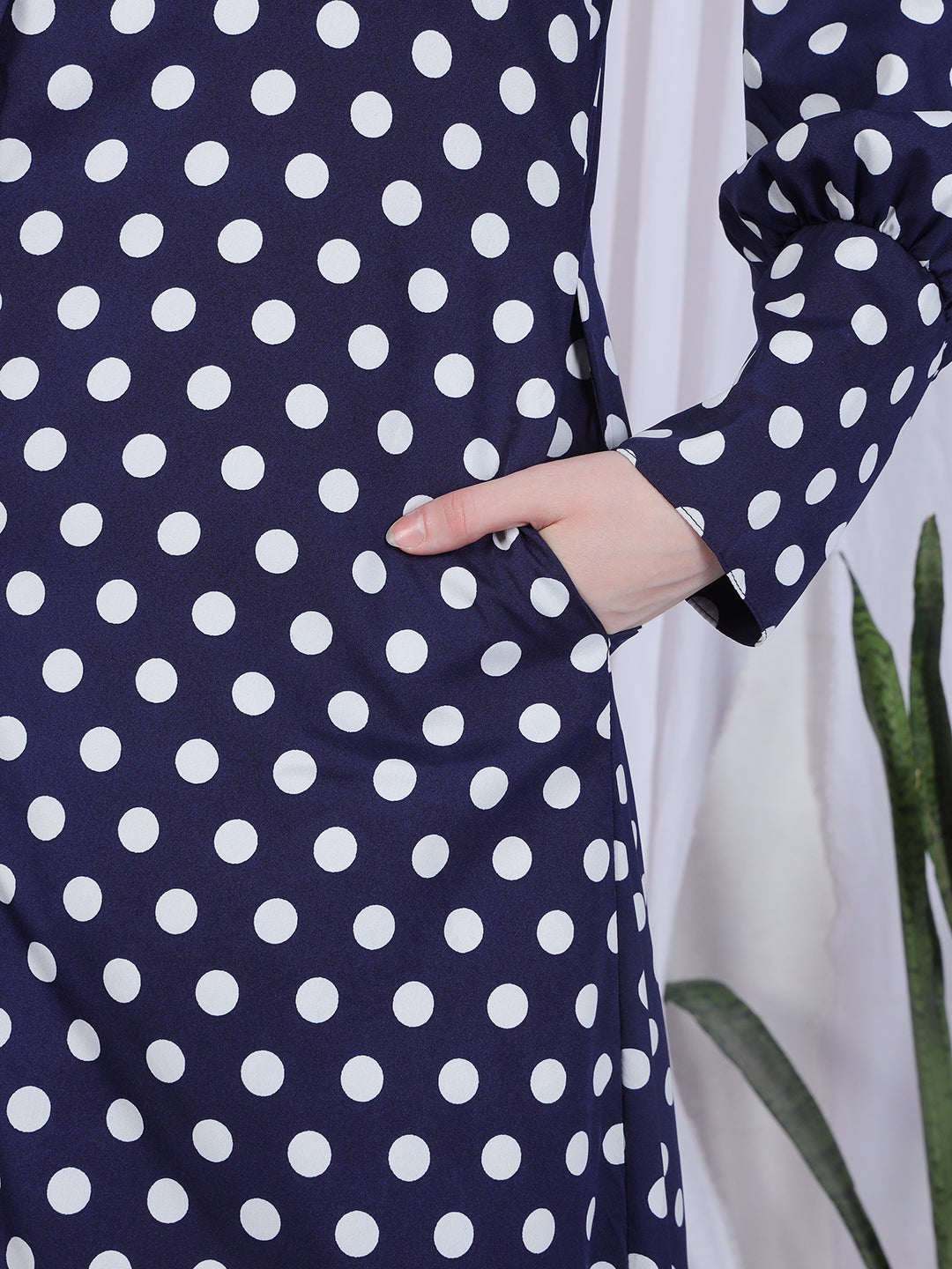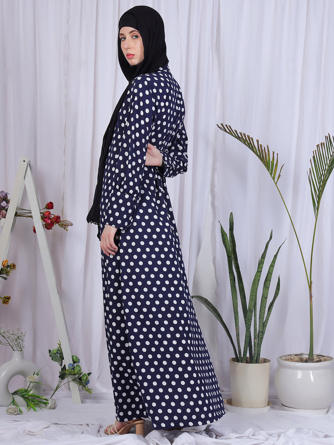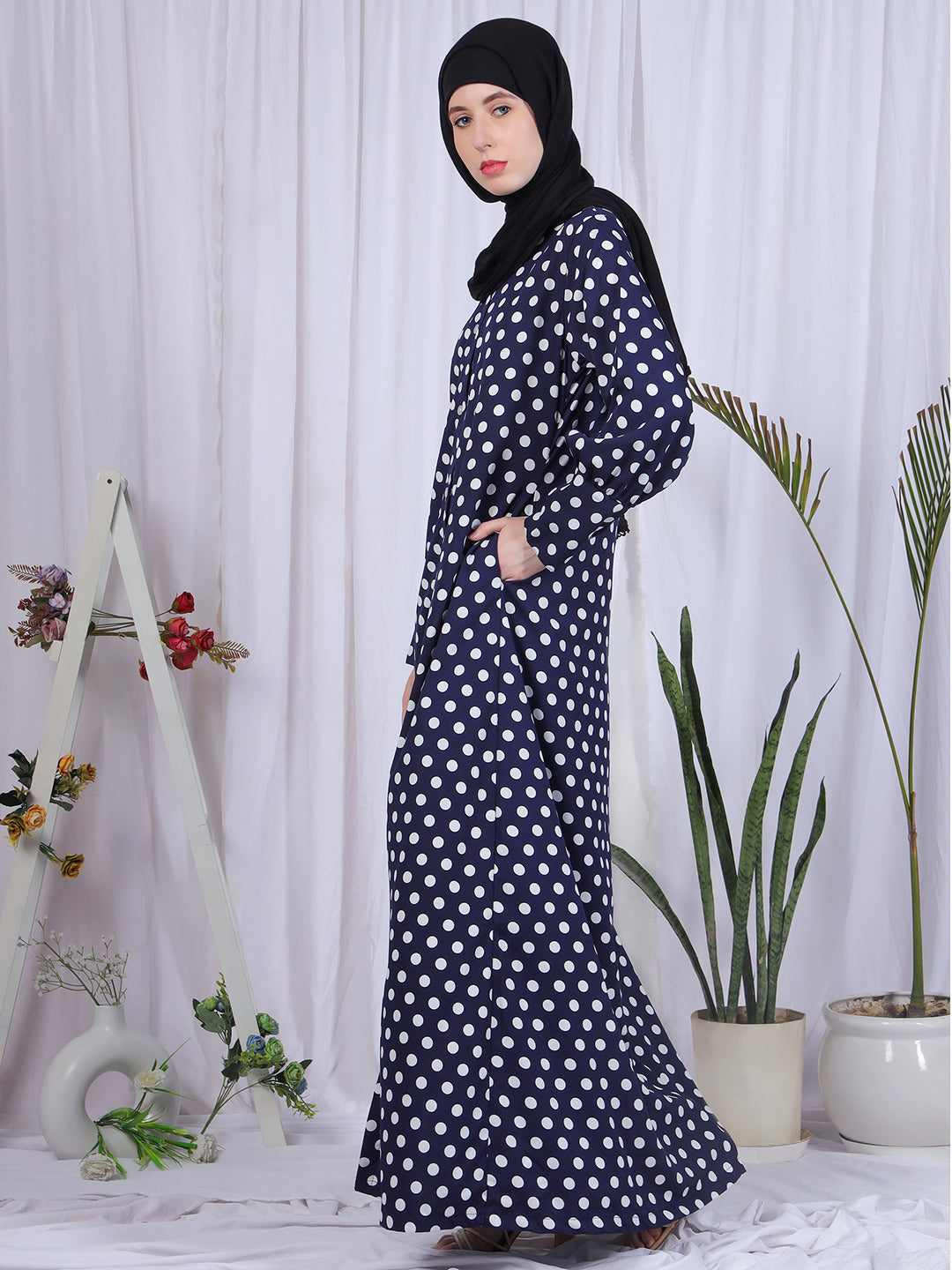 This chic Polka Dot printed Abaya is a must-have for making a fashion statement. Perfect for daily wear, its front-open design and side pockets add practicality. A timeless addition to any Muslim woman's wardrobe, this Abaya seamlessly blends style and convenience, ensuring you look elegant and feel comfortable wherever you go.