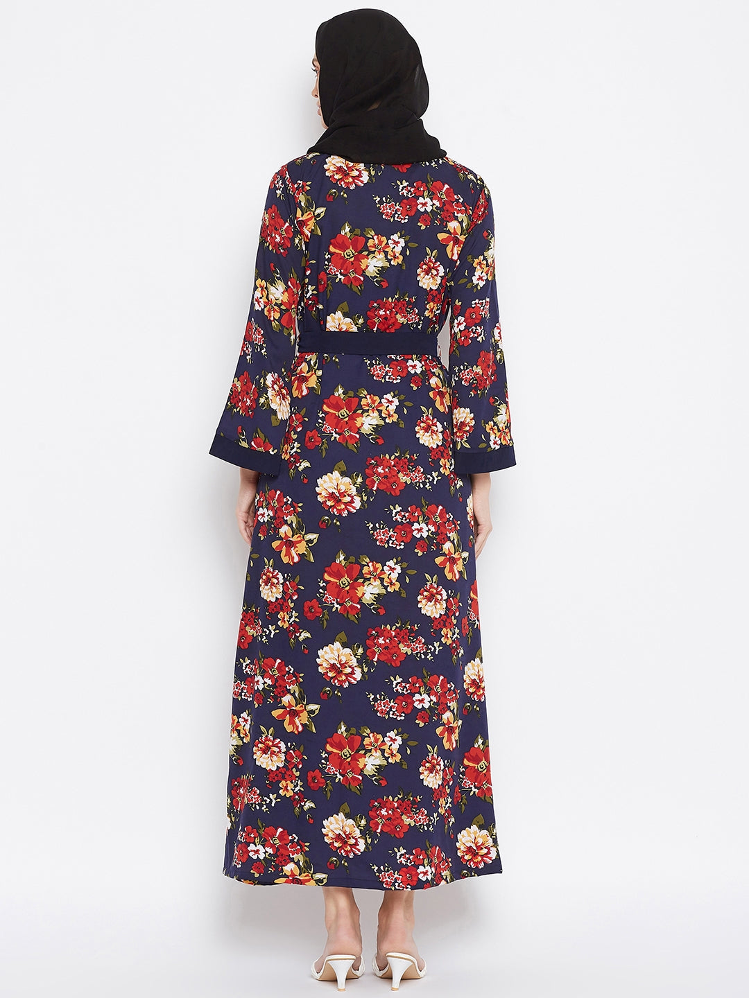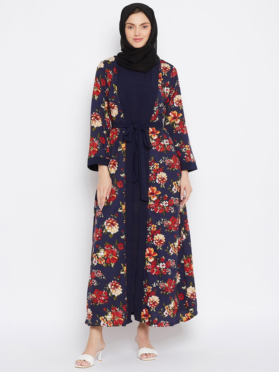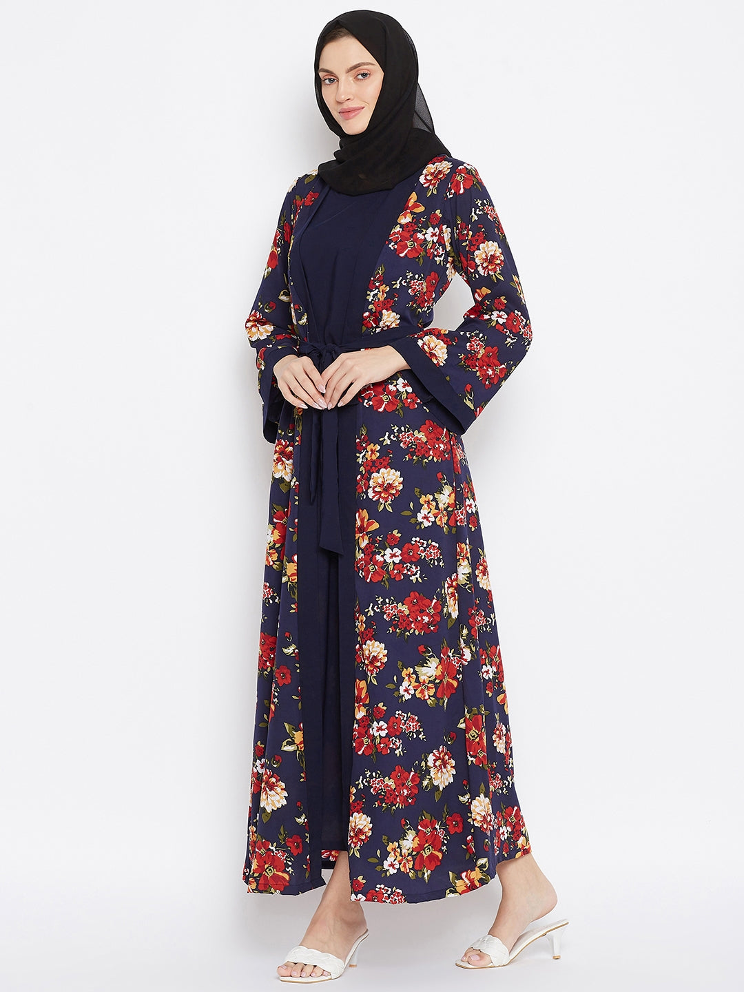 This trendy blue and red floral printed abaya is the perfect choice for a day out with friends. Crafted from two distinct fabrics, Nida matte for the inner garment and crepe for the outer shrug, it blends style with comfort seamlessly.